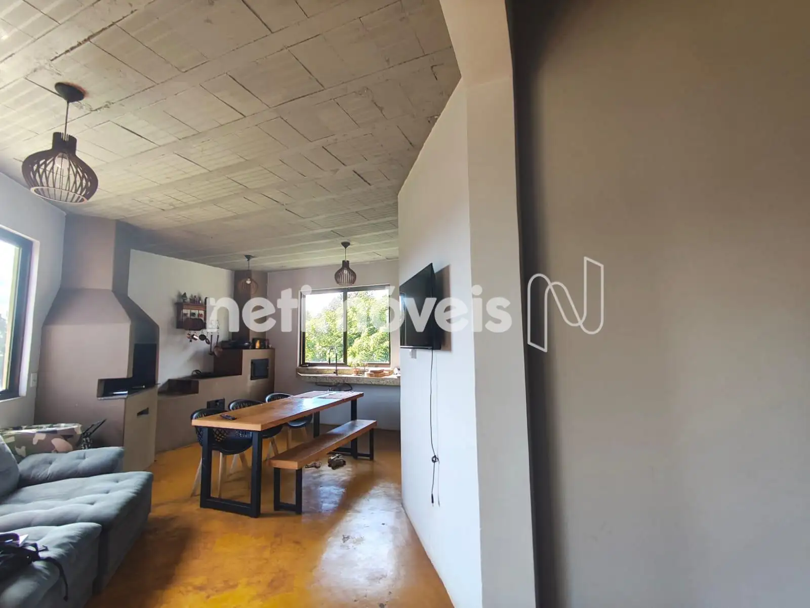 A casa possui três quartos, sendo uma suíte com closet , escritório, sala íntima, lavanderia com quarto de despejo, cozinha com despensa e cozinha caipira (com churrasqueira e fogão à lenha). Possui uma ampla sala , composta de três ambientes, integrados à varanda. Lareira, forro de teto amadeirado, pé direito elevado, piso em taco de madeira ...compõem esta aconchegante e confortável sala.
