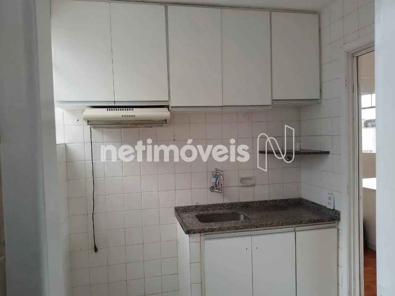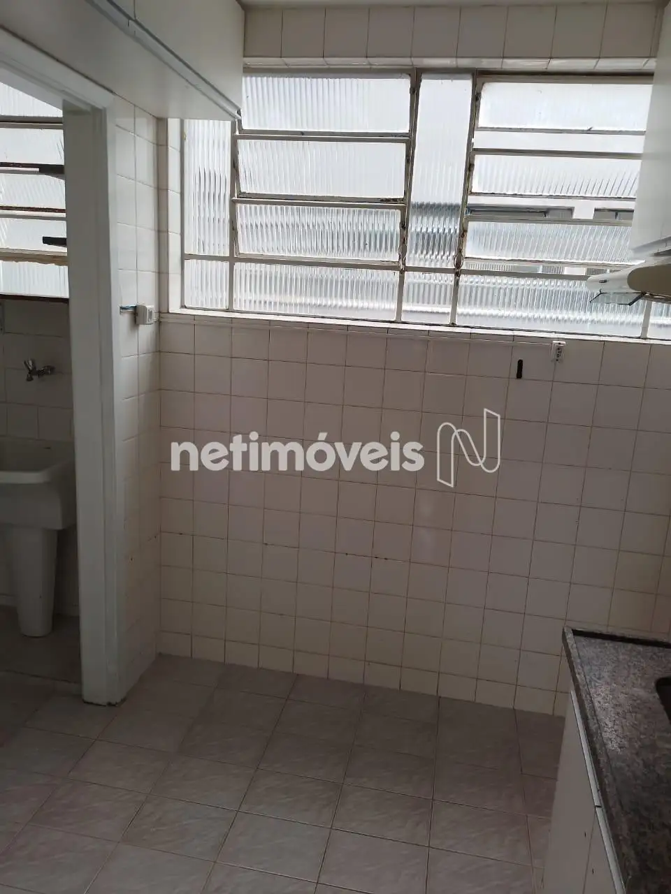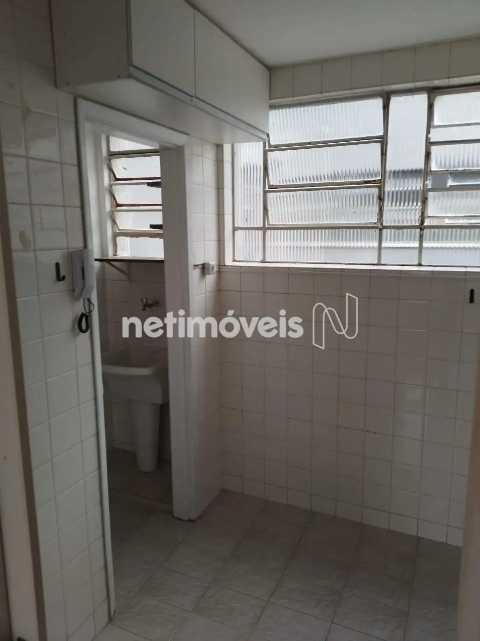 Cozinha com armários e área de serviço.