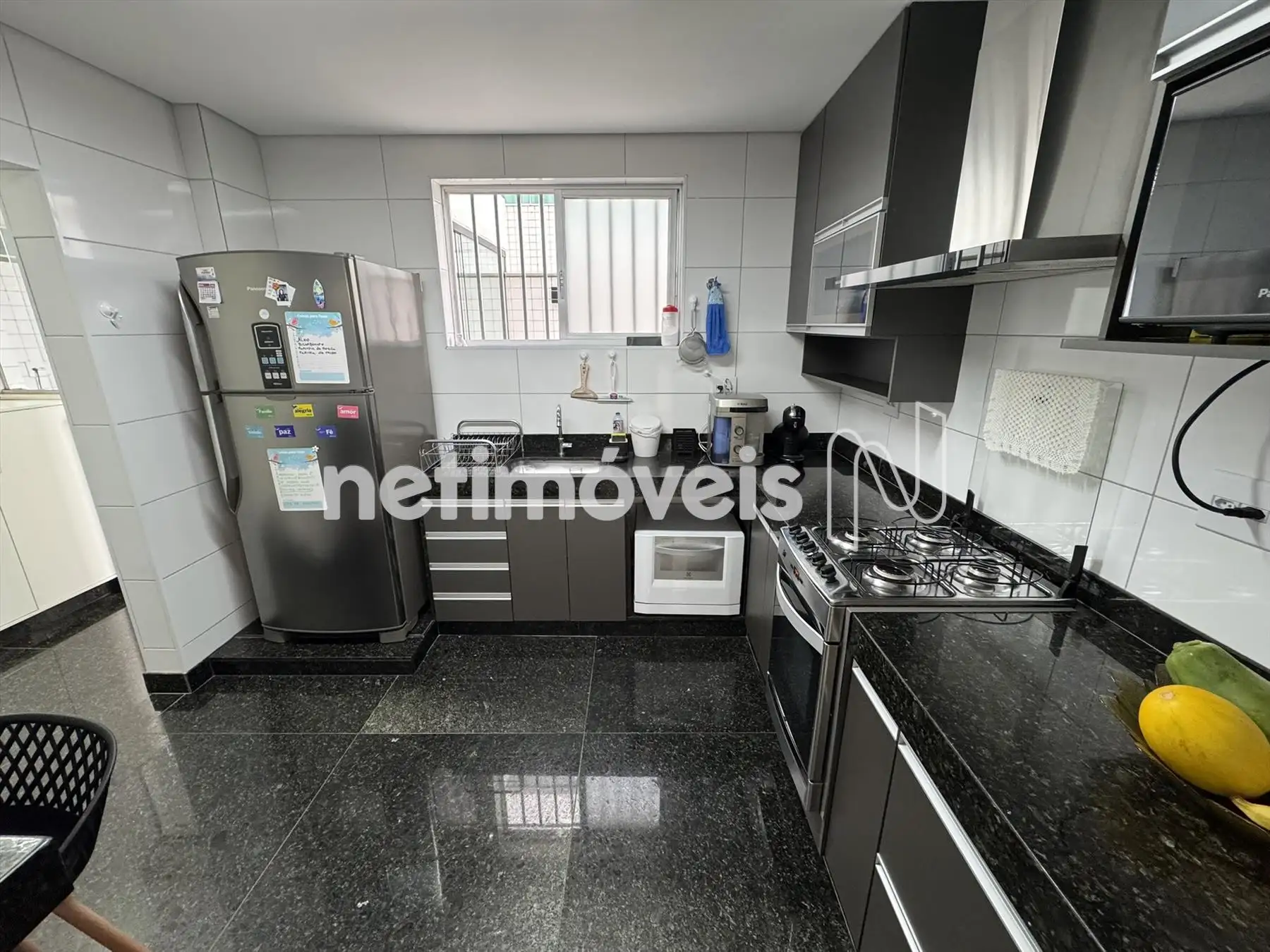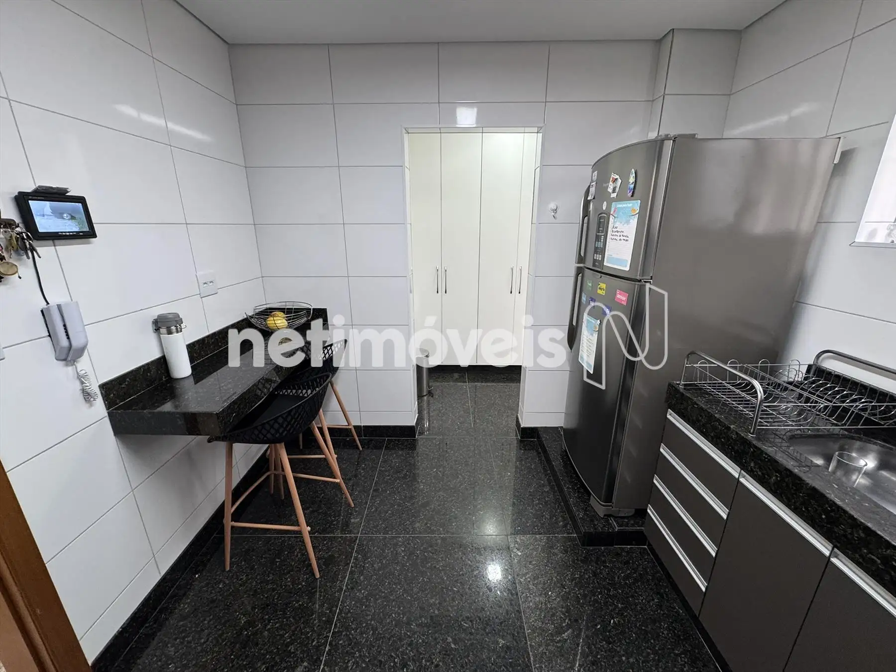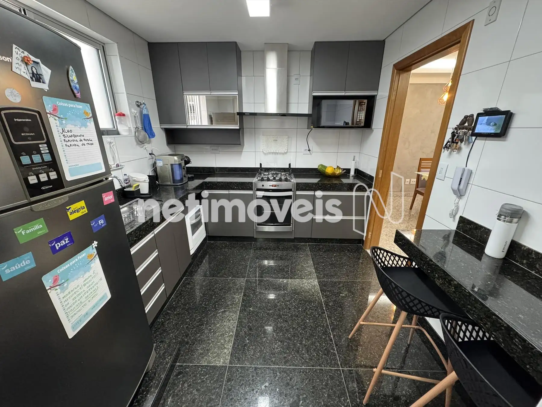 Cozinha com armários, piso e bancada em granito.