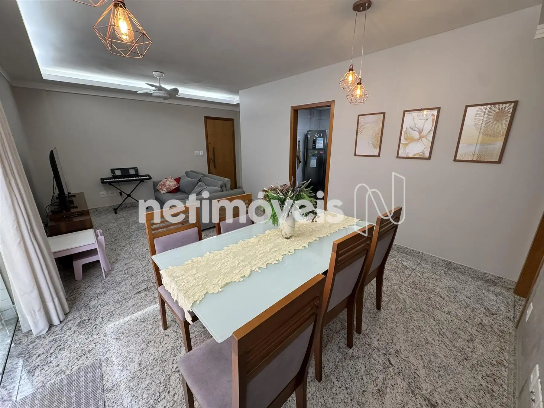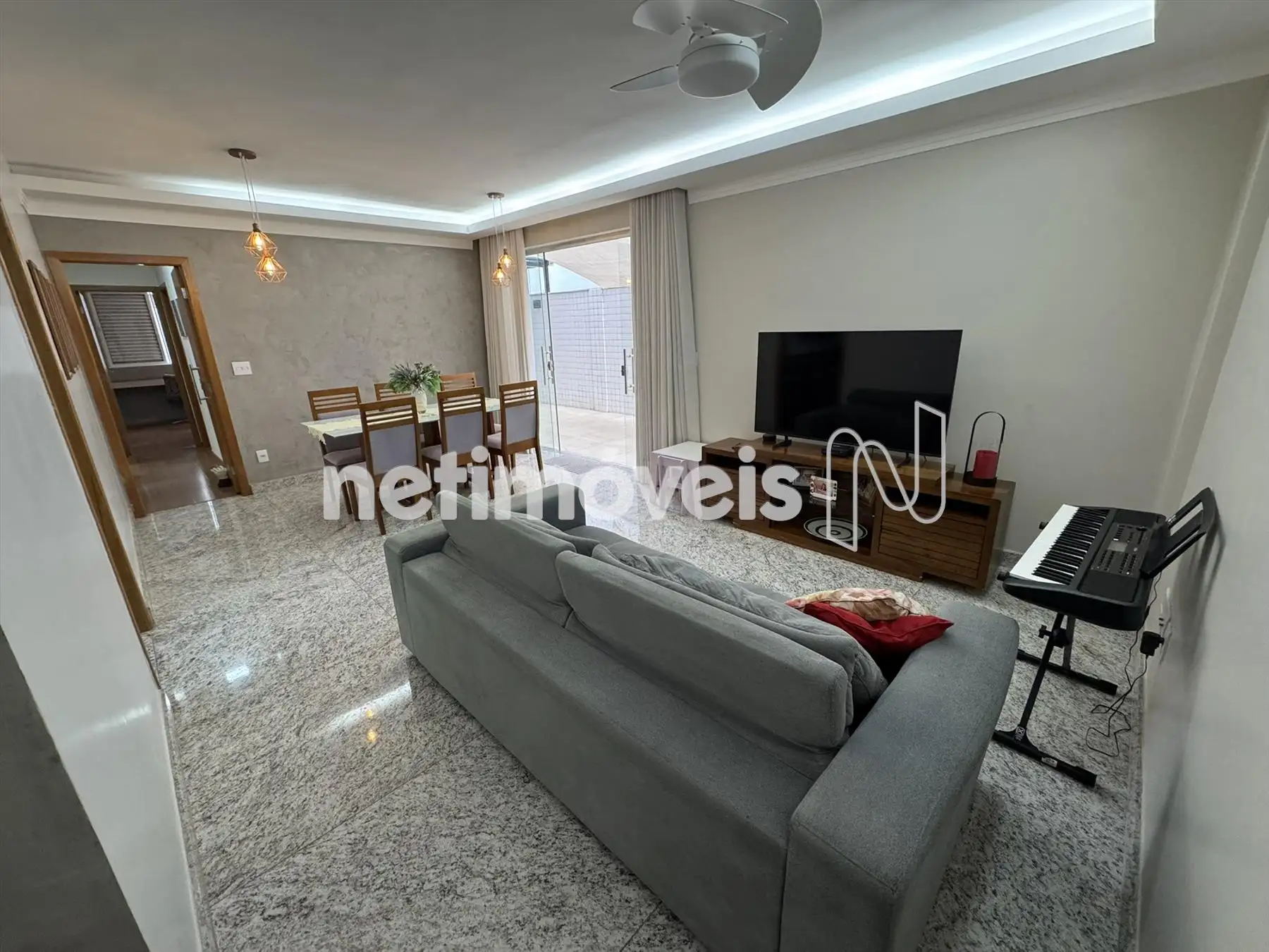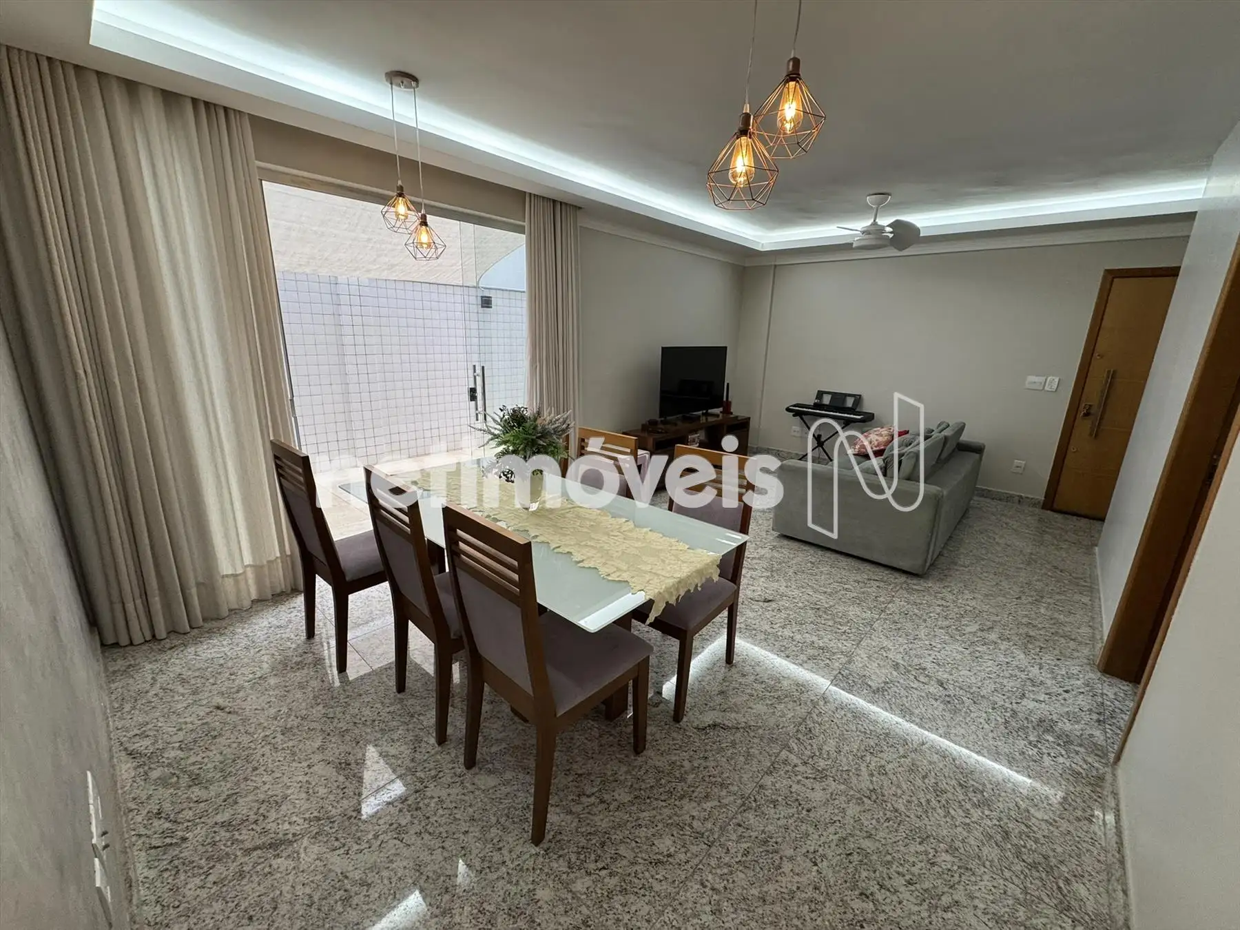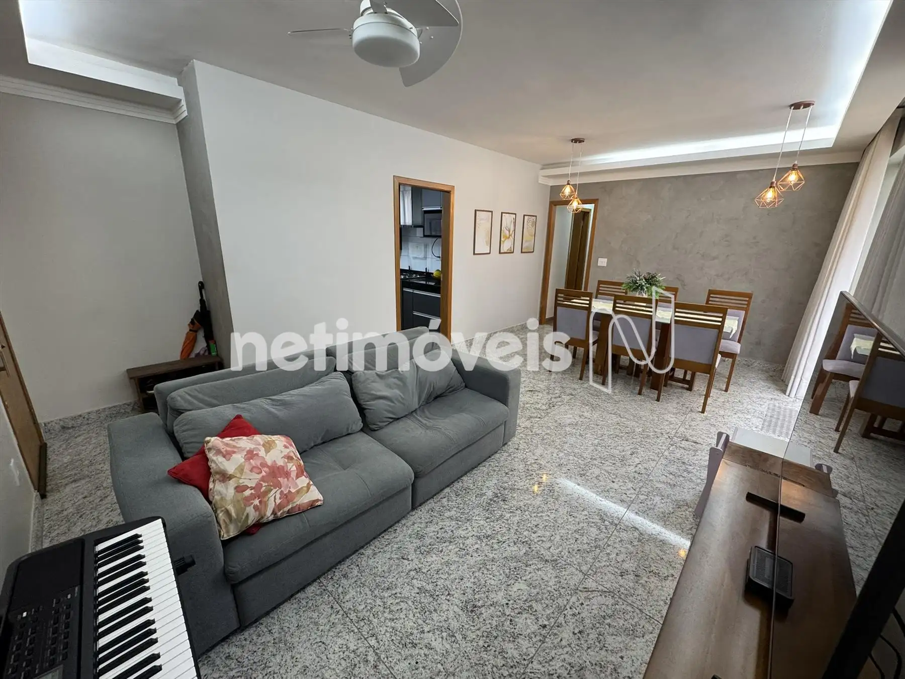 Sala espaçosa com piso em granito.
