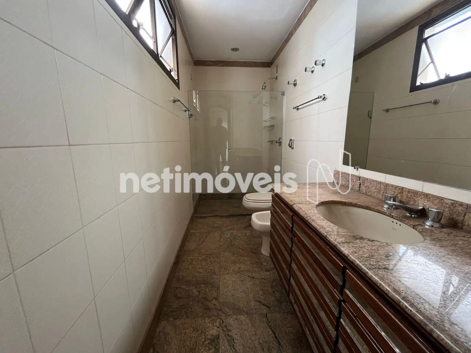 O banheiro social possui banheira, box em vidro, armário sob bancada em granito e sofisticado revestimento em mármore.
