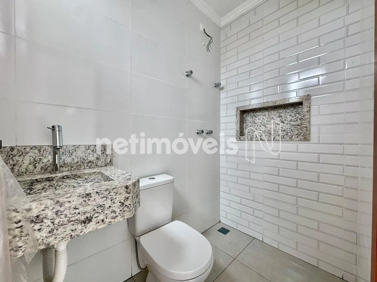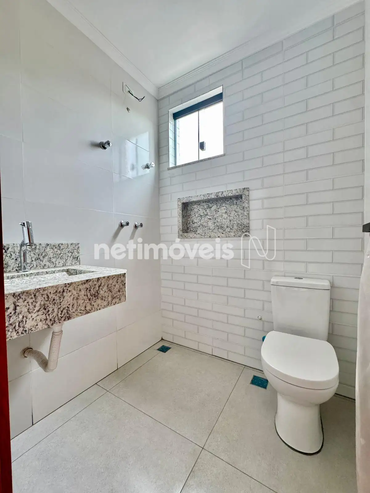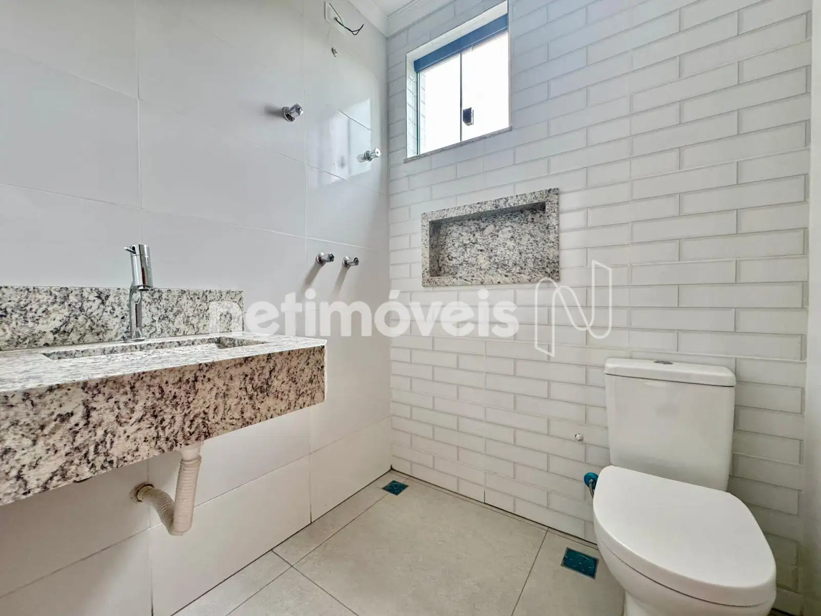 Banheiro social com pia embutida, bancada de granito, piso em mármore e nicho na área de Banho ;