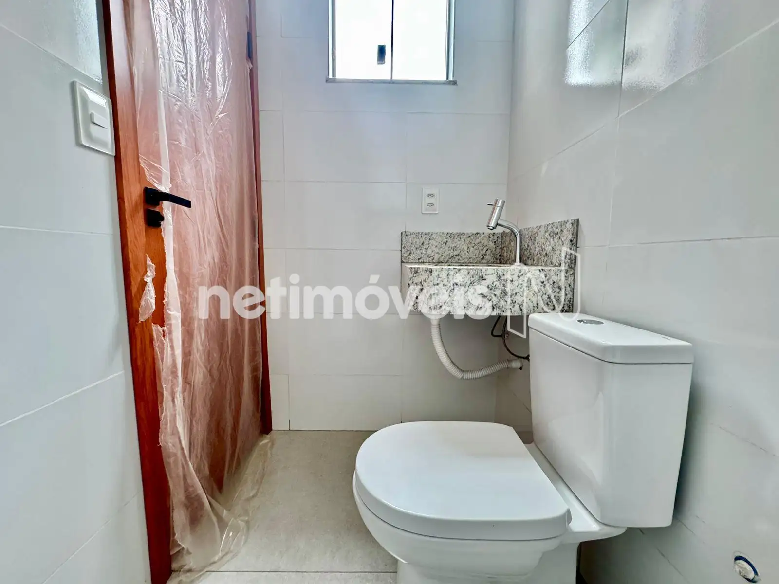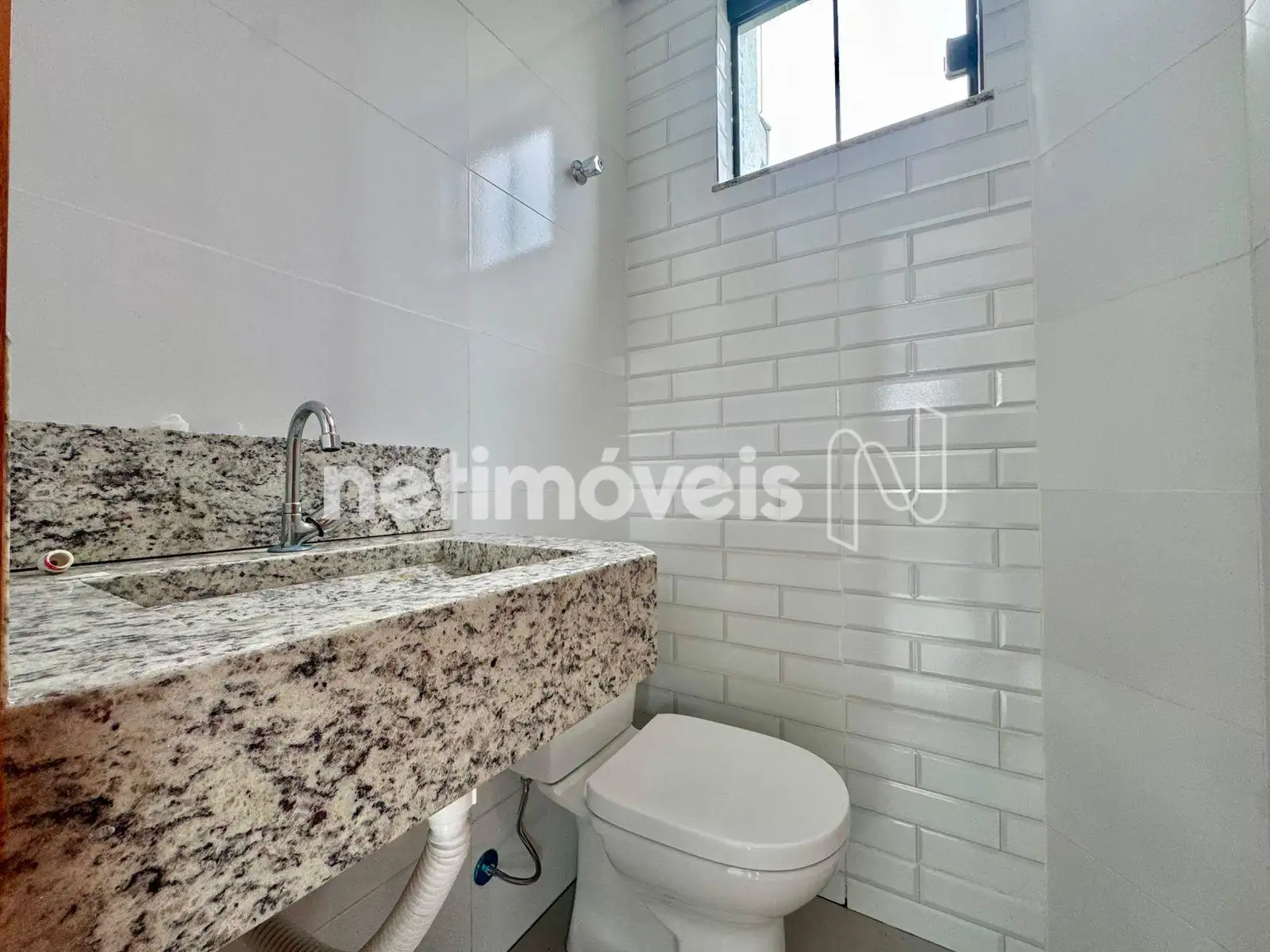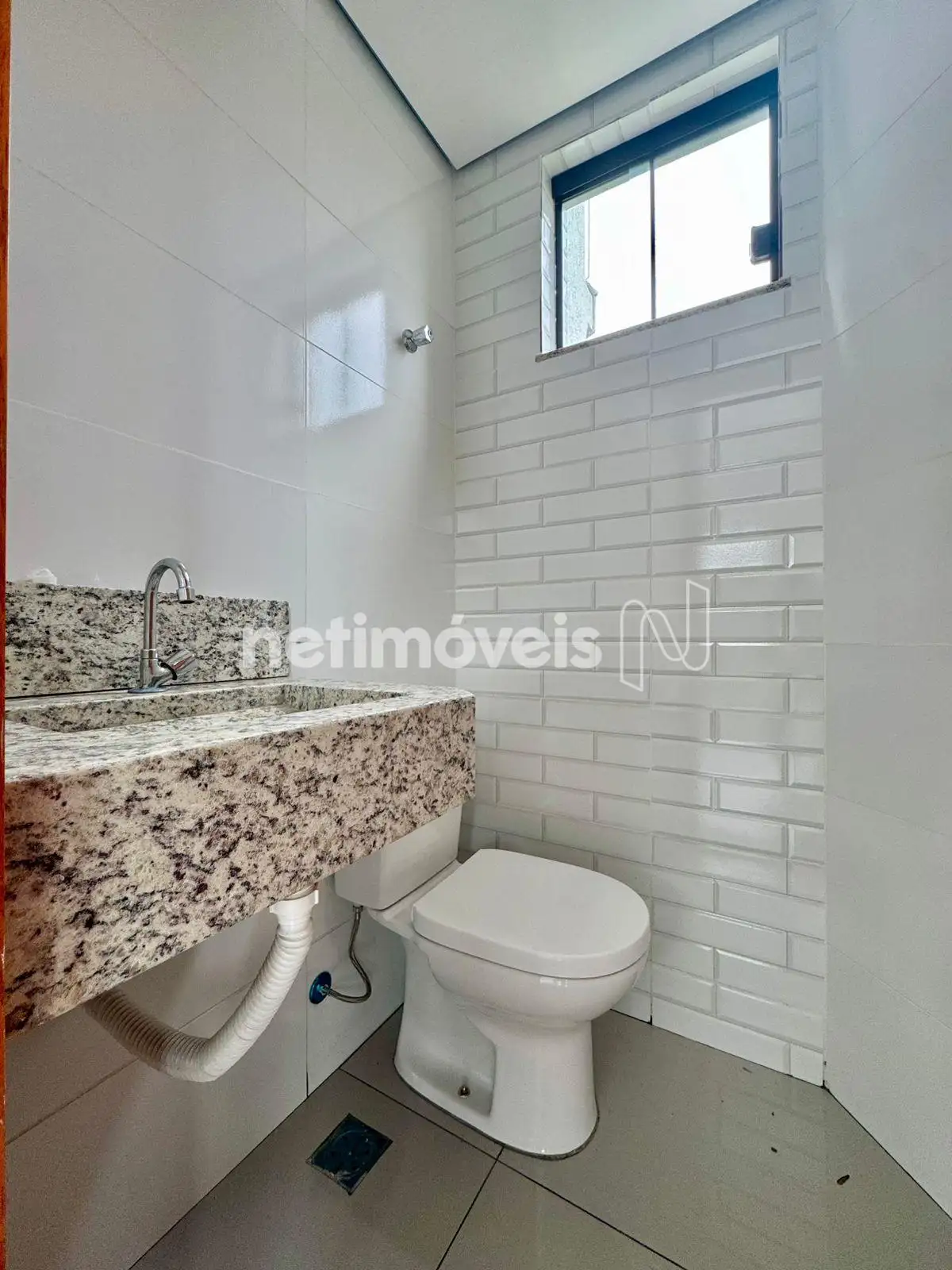 Banheiro social com pia embutida, bancada de granito, piso em mármore e nicho na área de Banho ;
