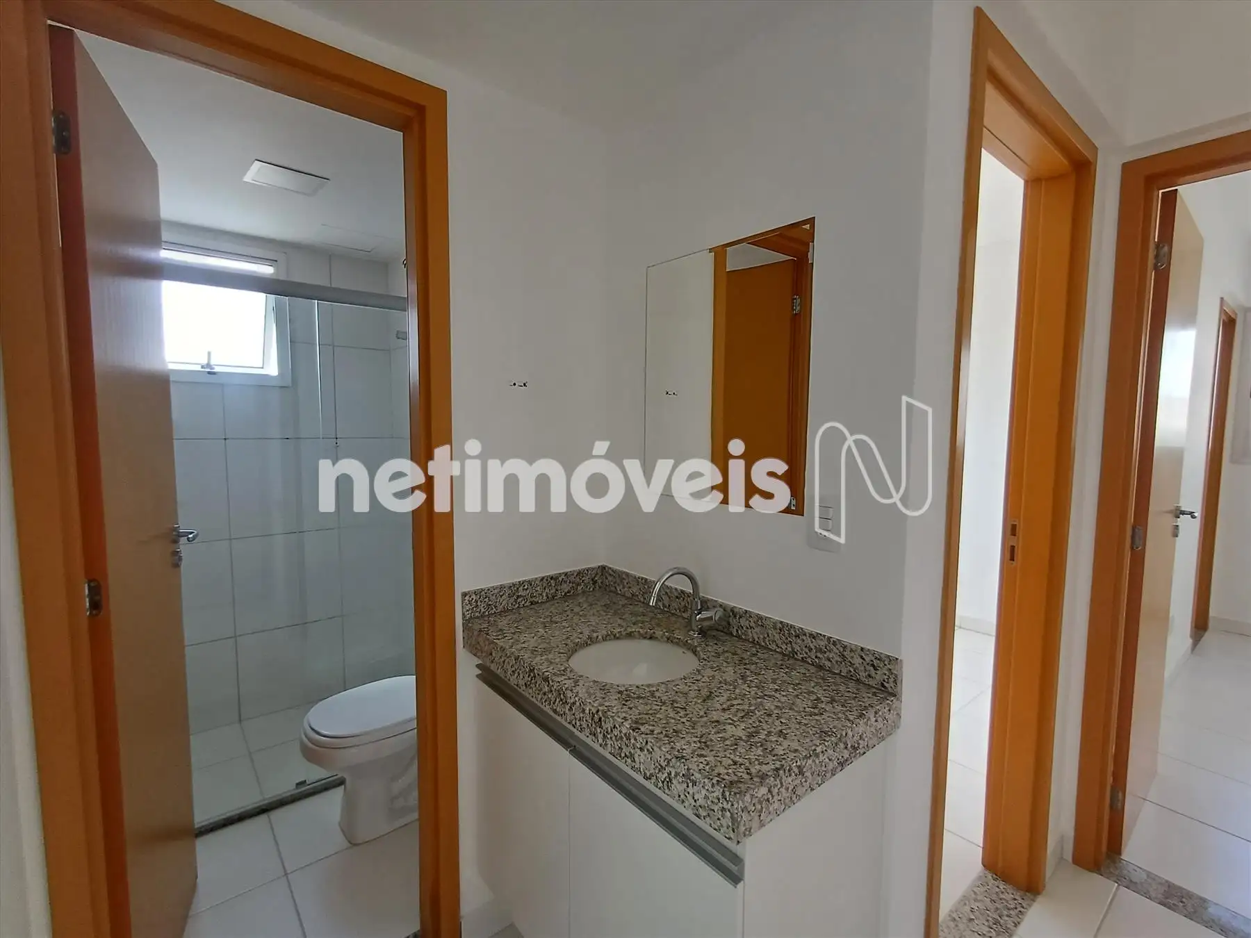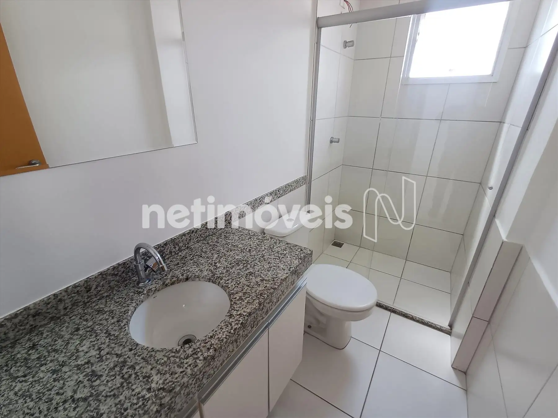 Banho social com armários, box e espelho;