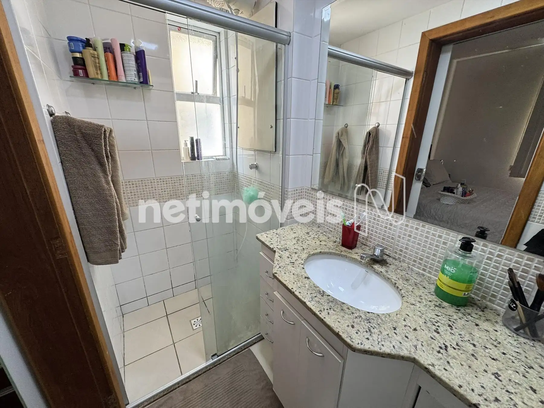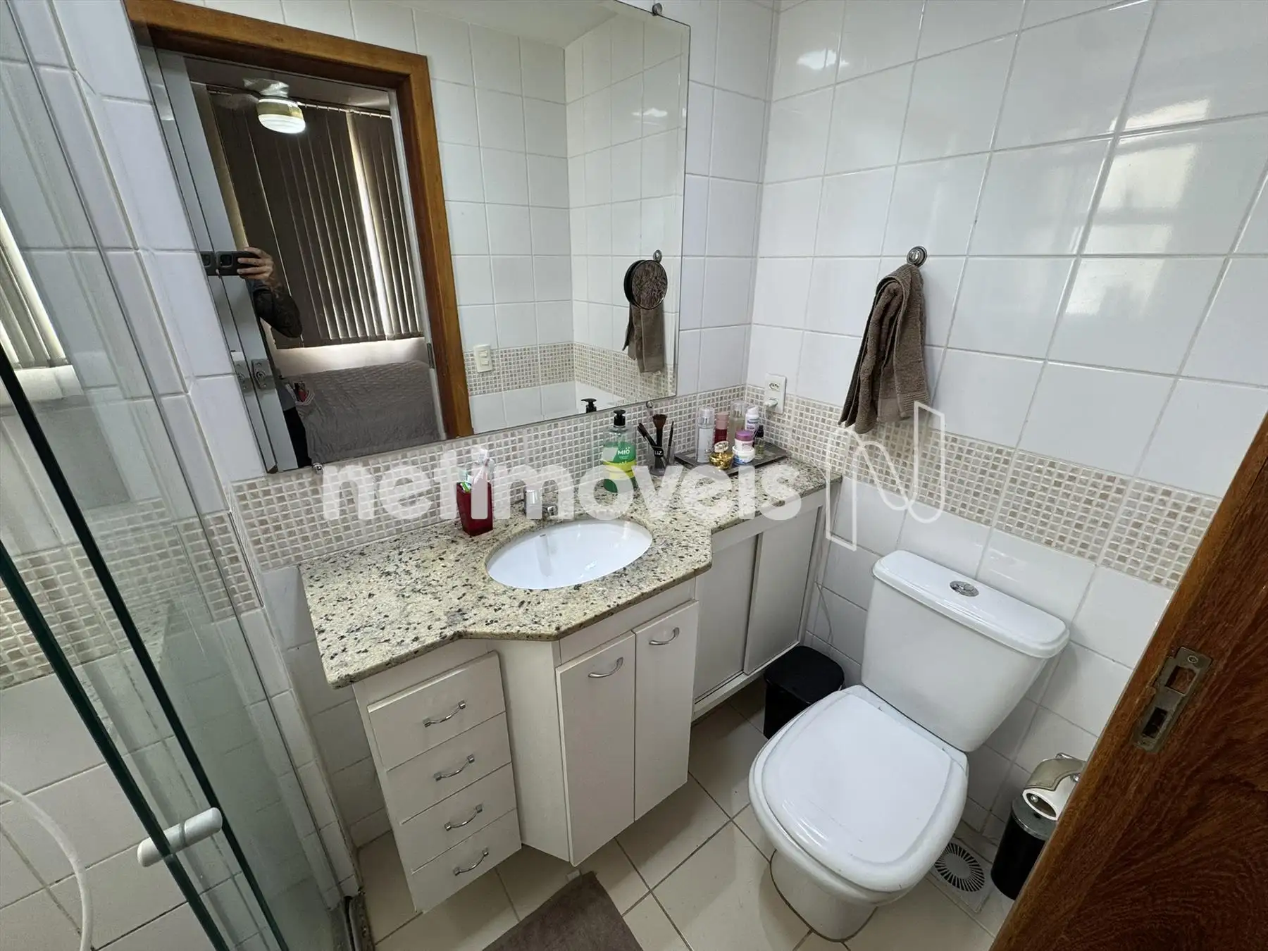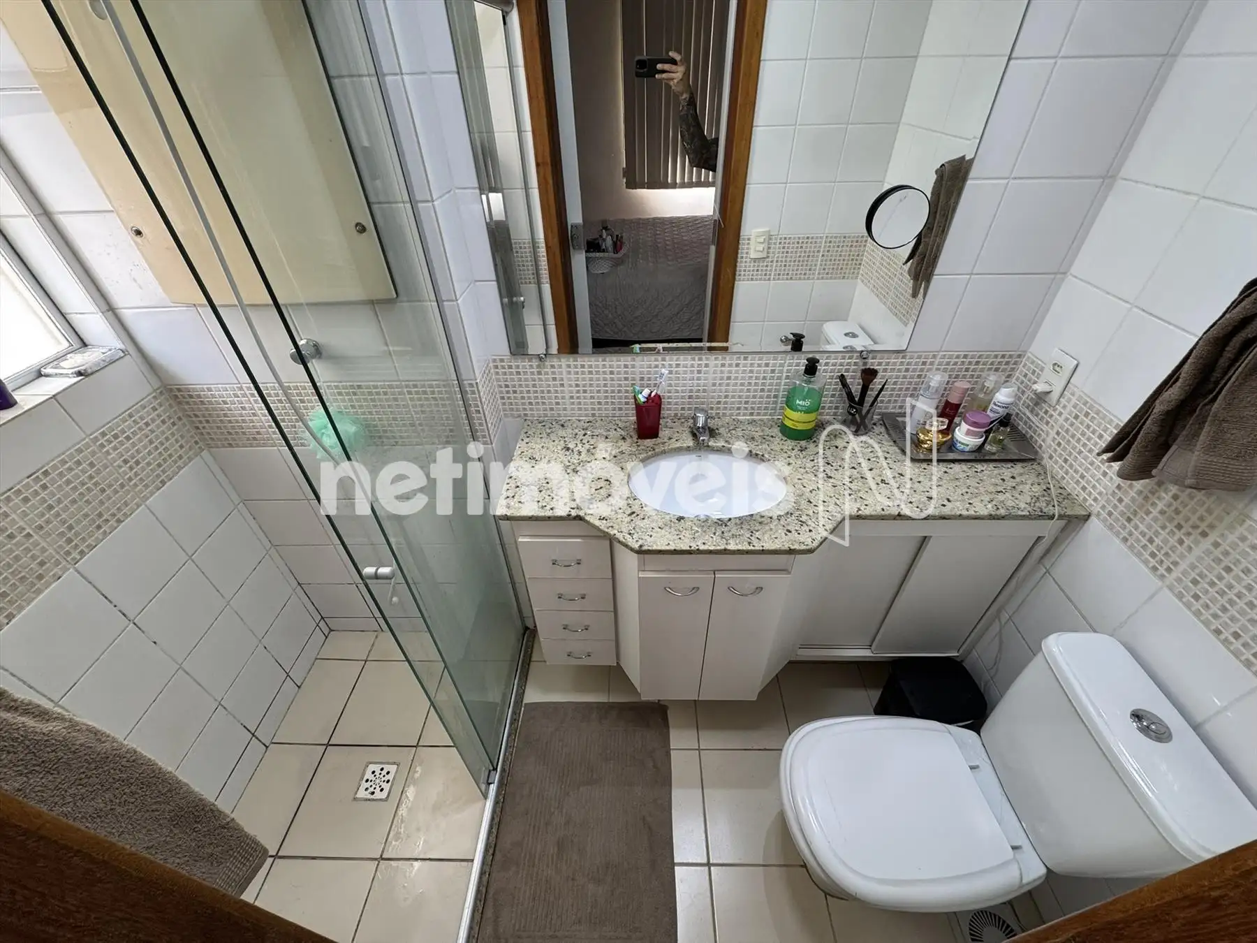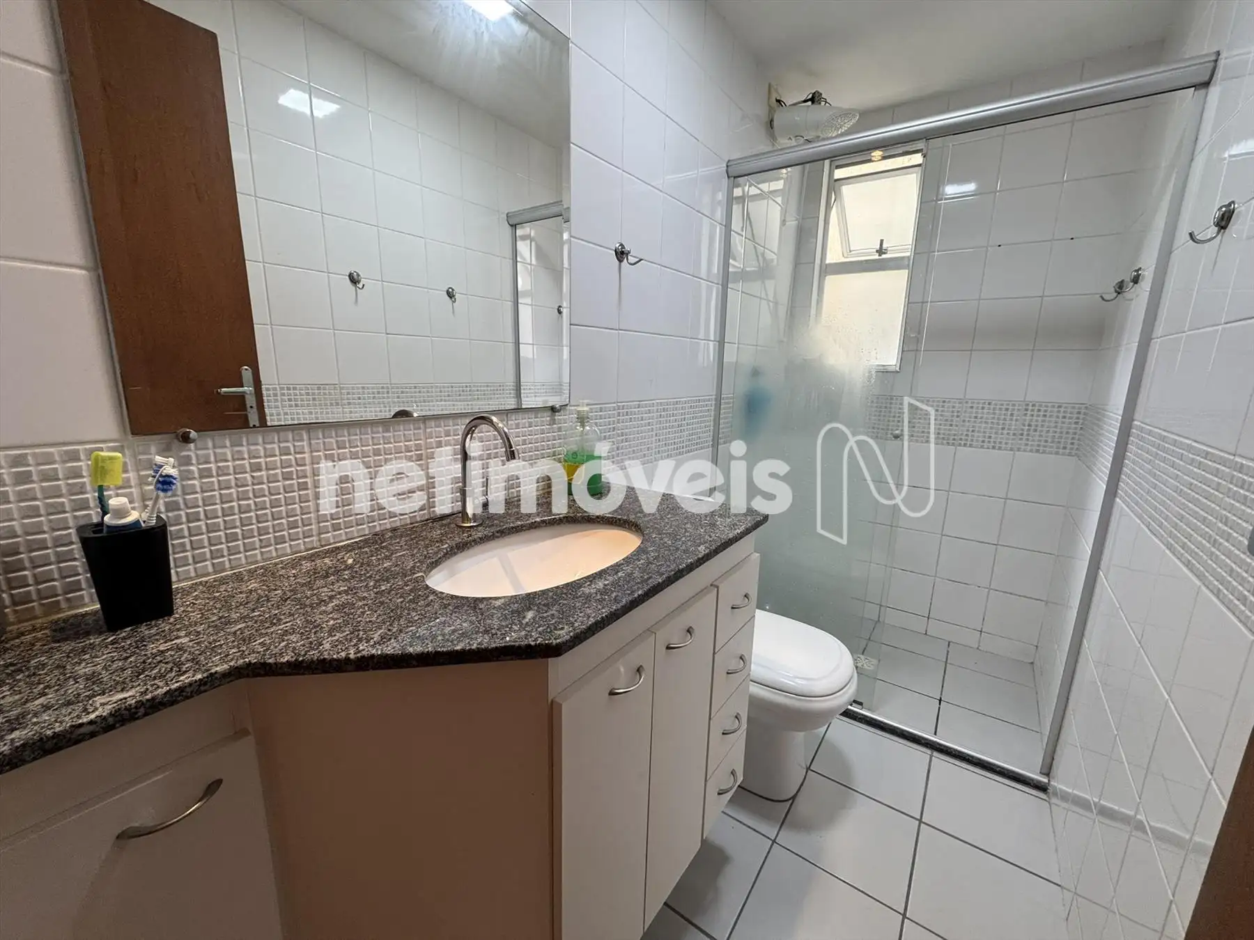 Banho social dom armários, box blindex, piso em porcelanato e bancada em granito