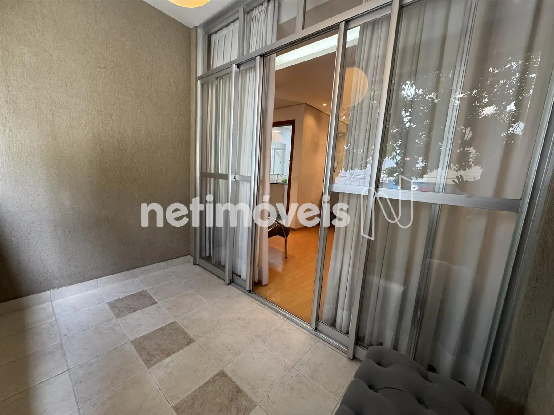 Sala , com piso em laminado, varanda com piso em porcelanato, fechada com vidro.