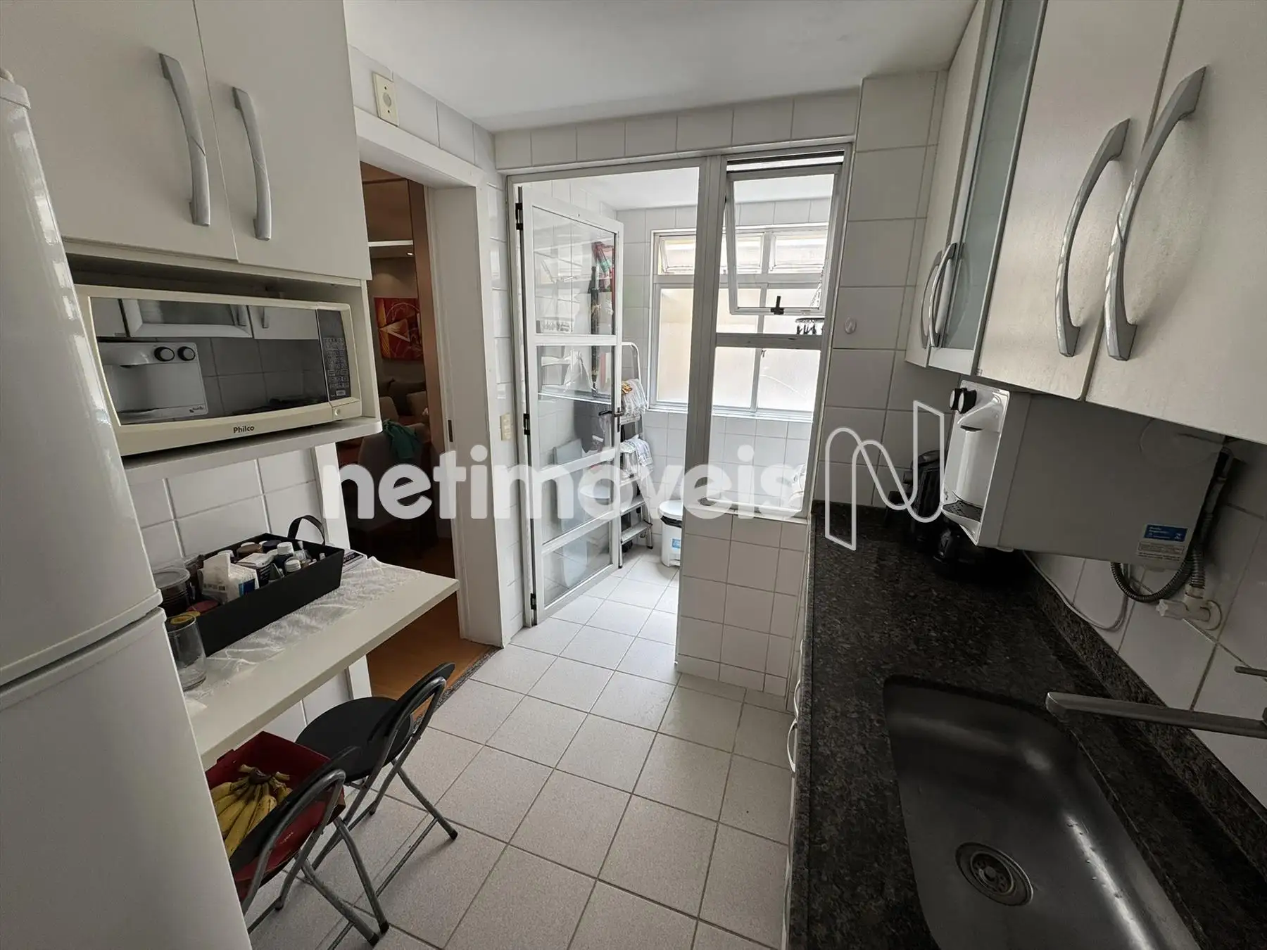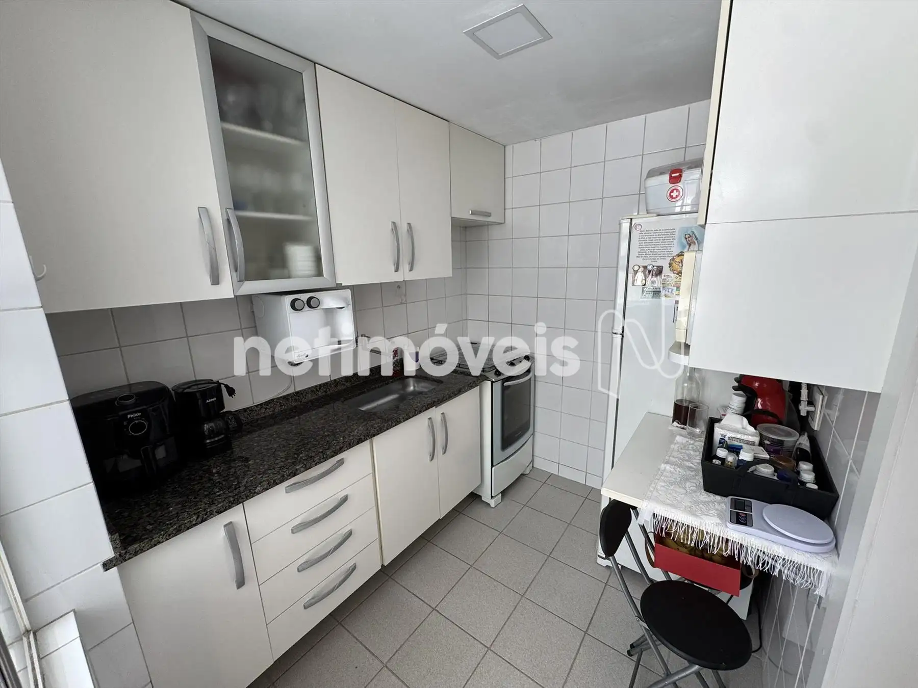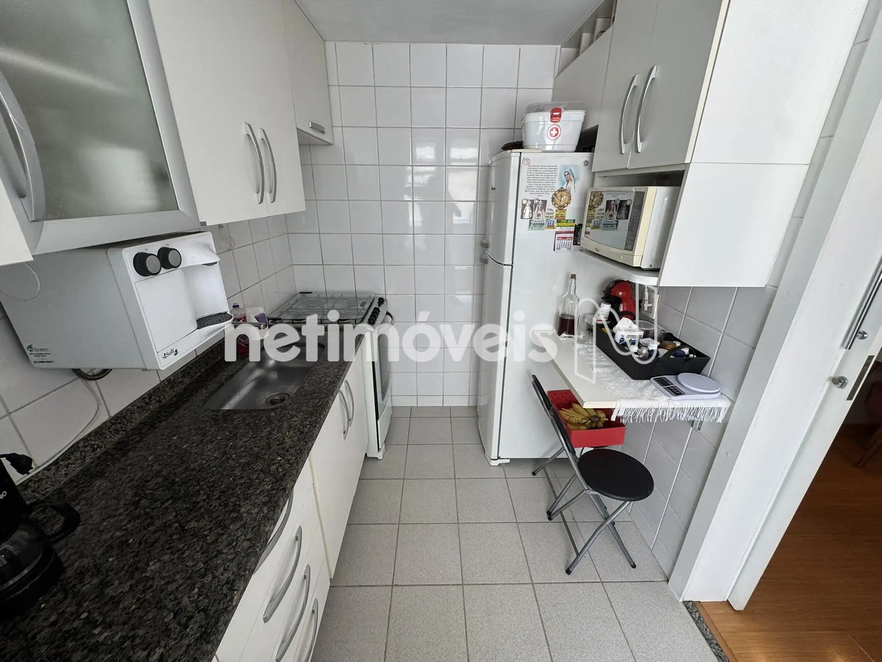 Cozinha com armários, piso em porcelanato e bancada em granito.