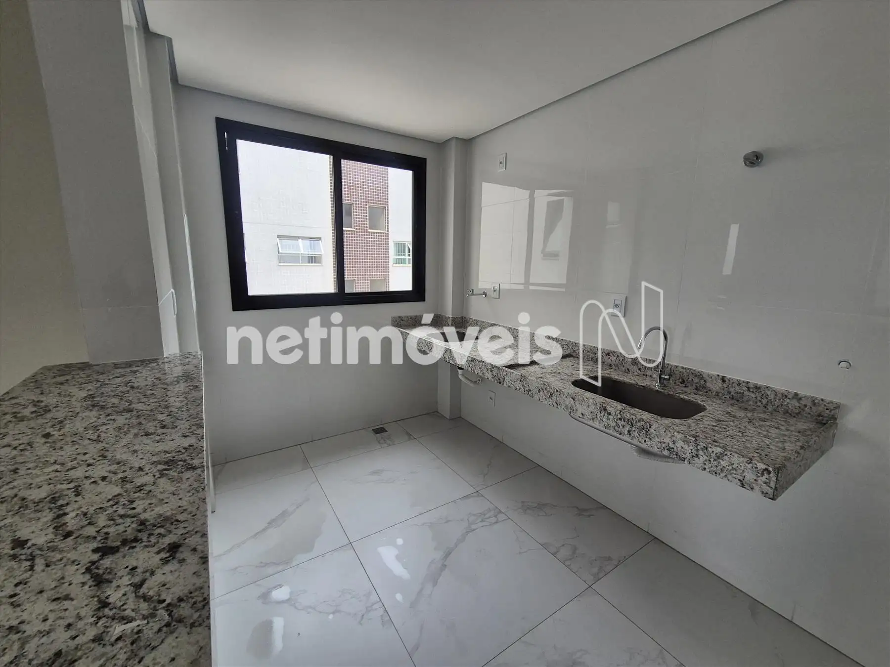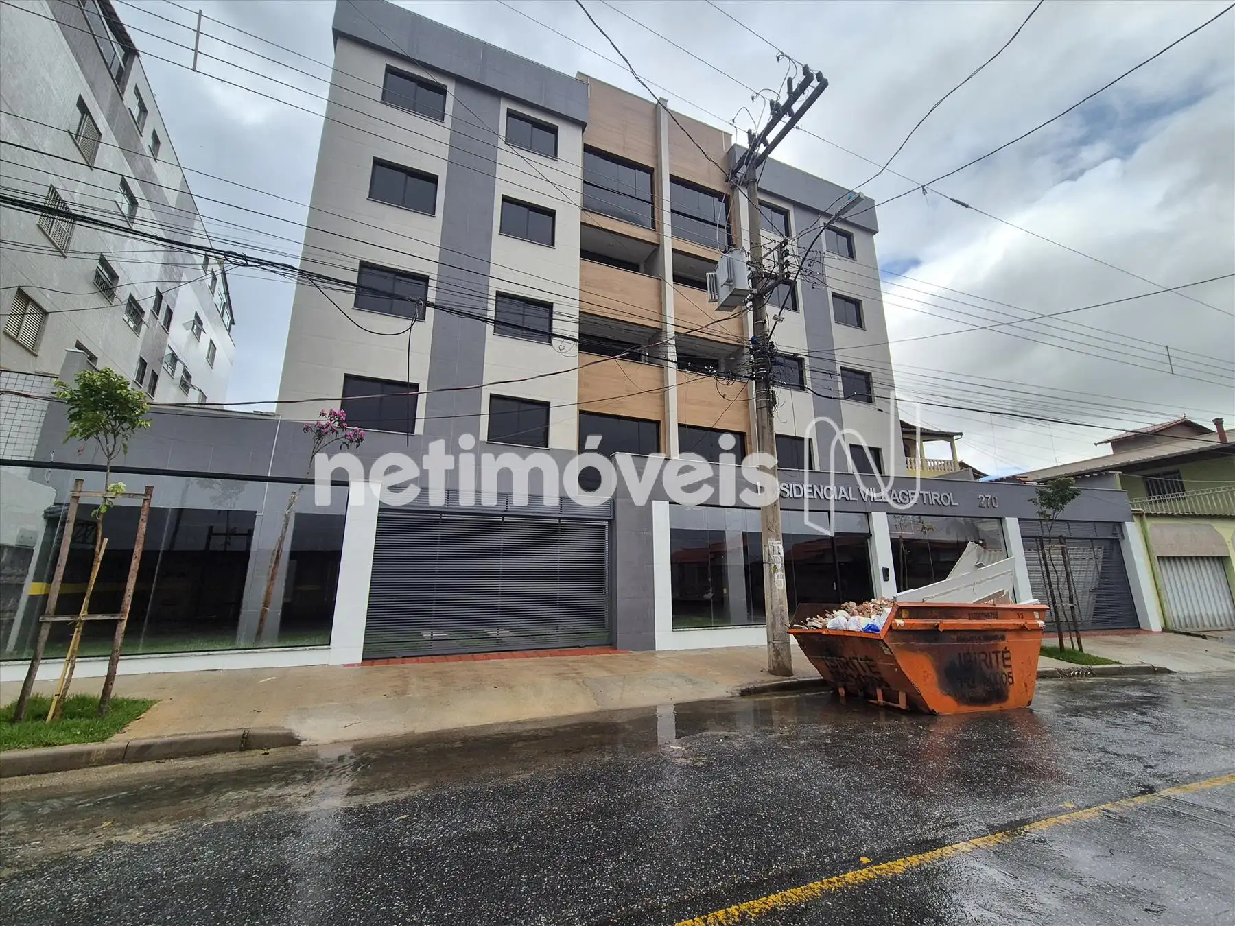 Prédio imponente com frente larga e varanda, revestimento em porcelanato e cores neutras.