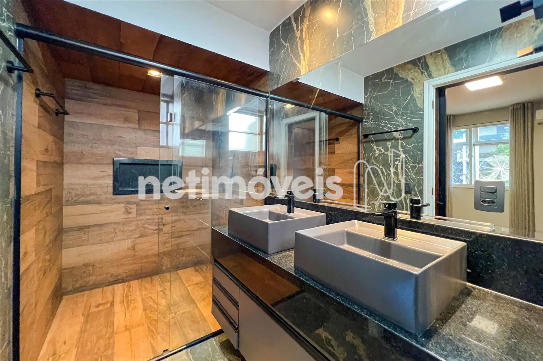 Banheiro da suíte com revestimento em porcelanato, bancadas em granito, duas cubas sobrepostas, armários planejados, box em vidro temperado e espelho;