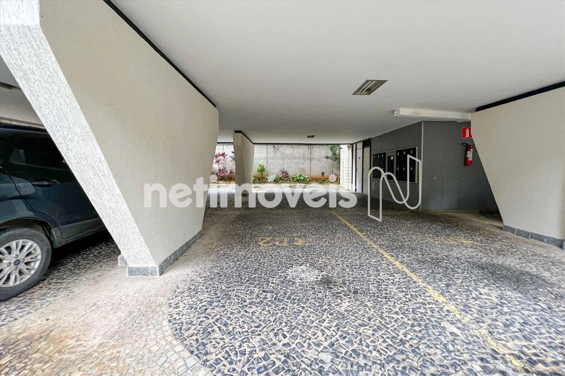 Uma vaga de garagem livre, coberta e demarcada e box de despejo.