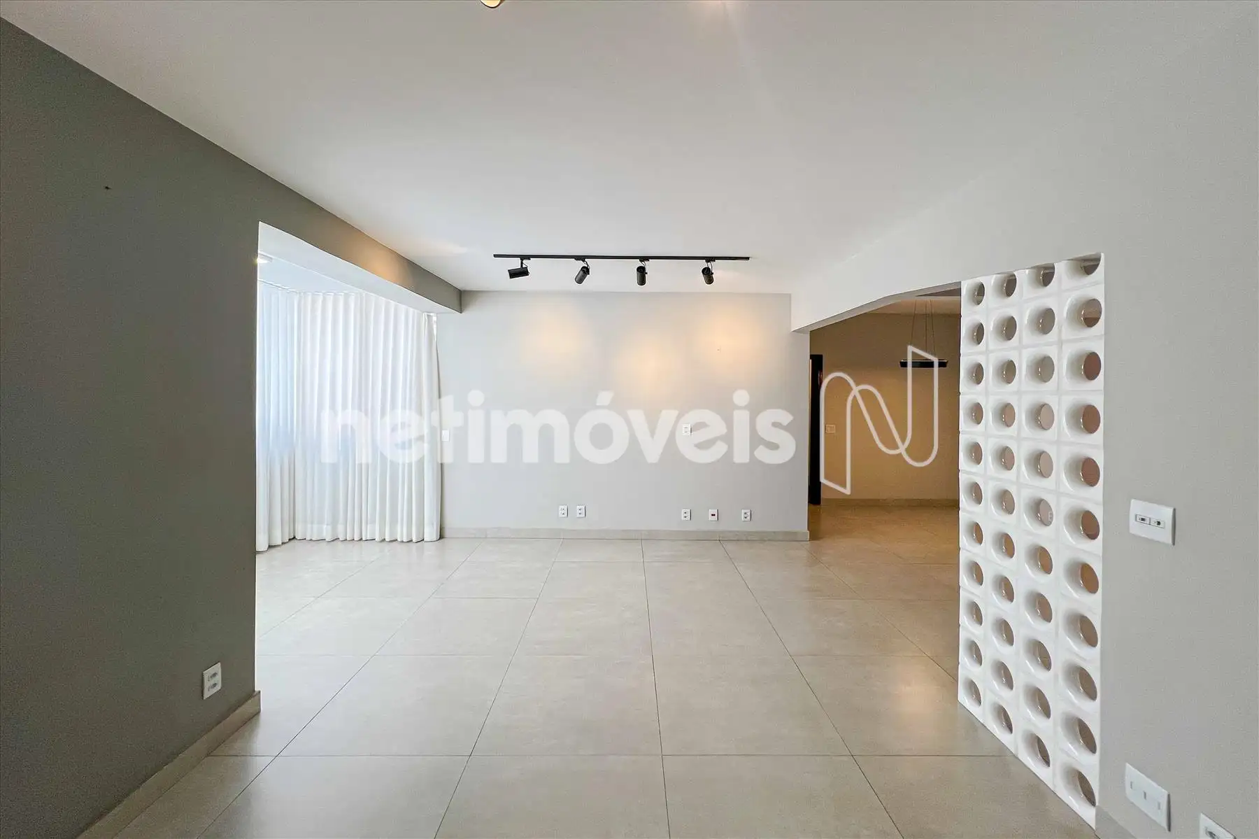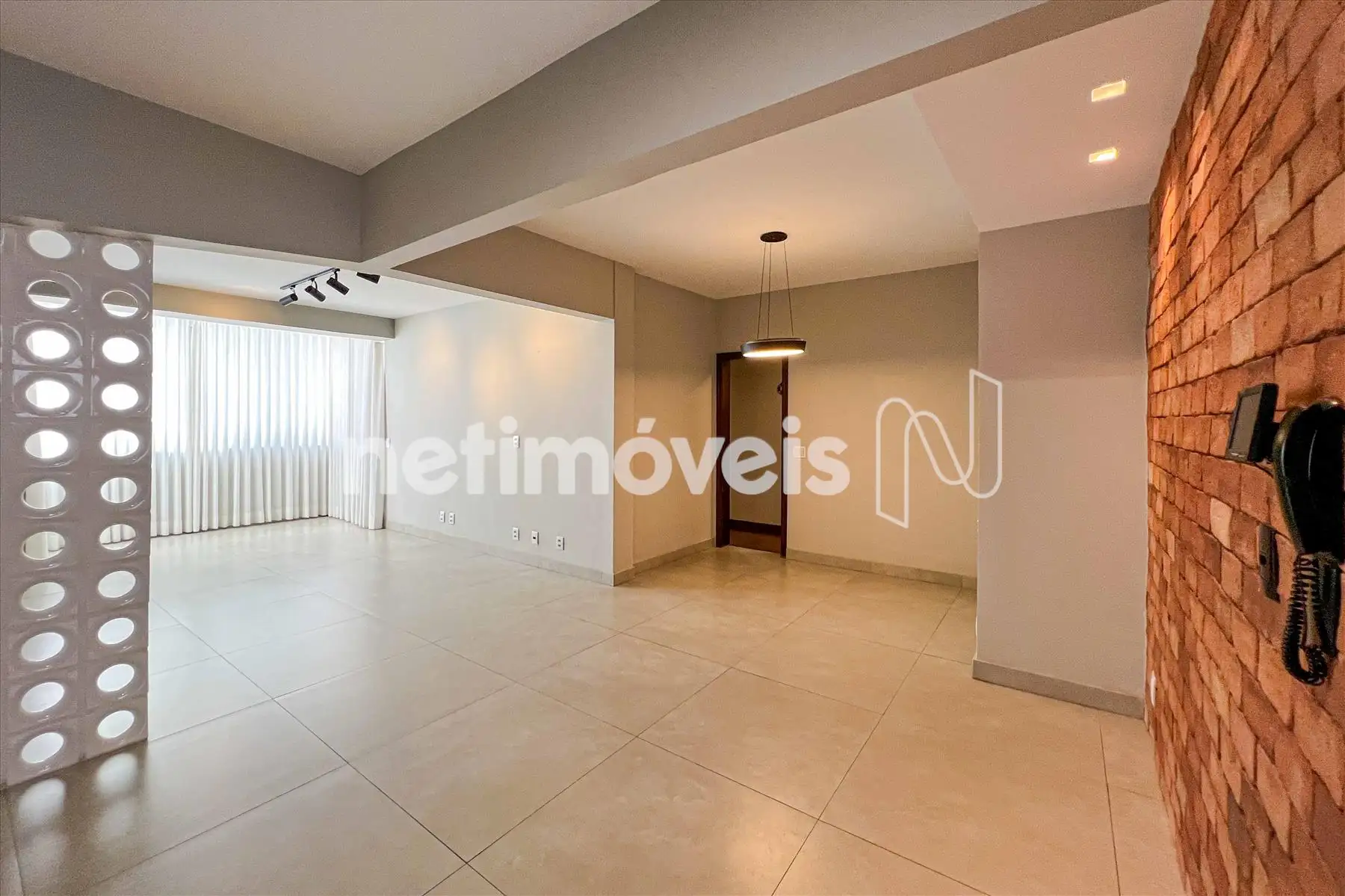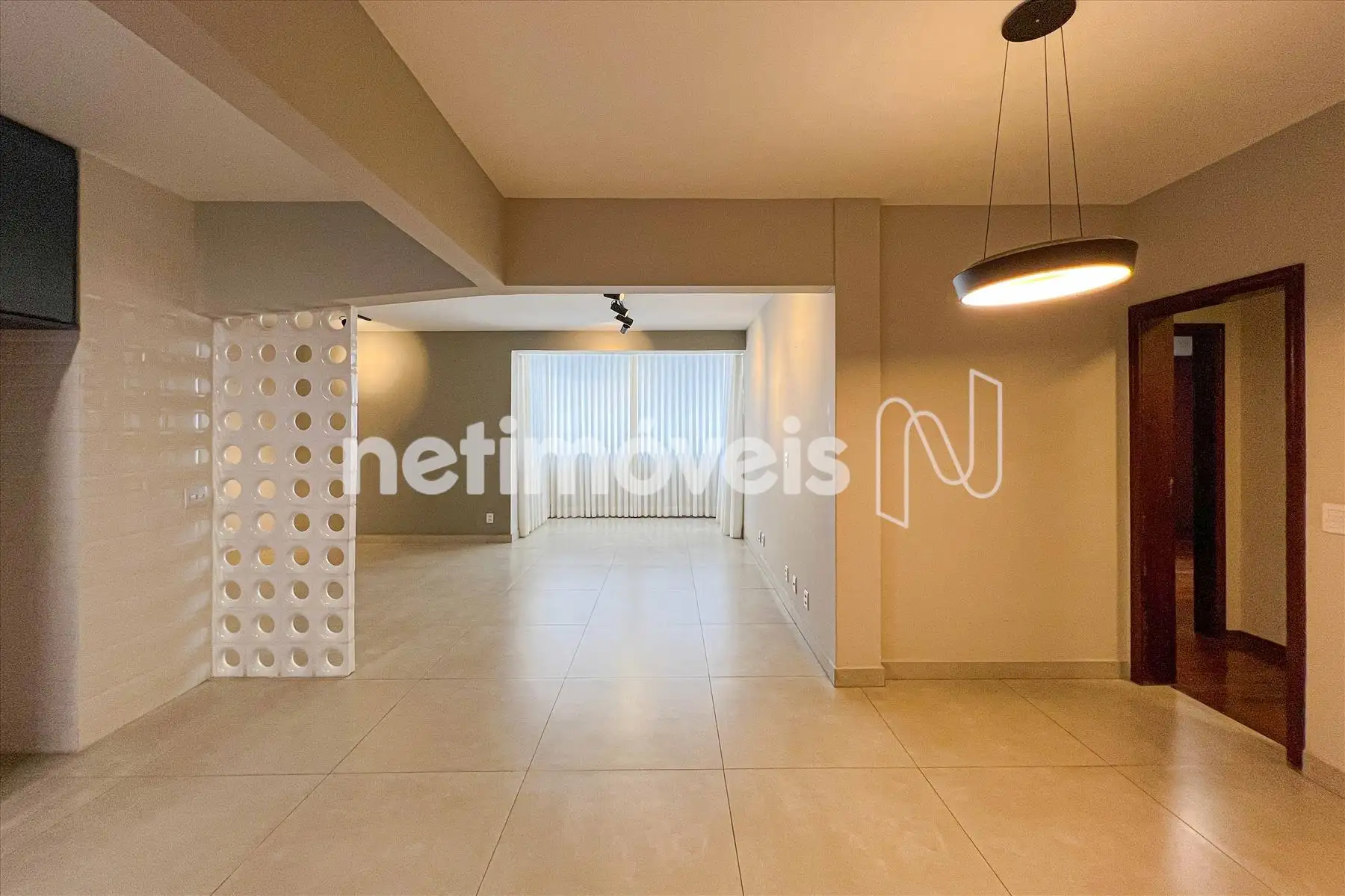 Sala ampla para 3 ambientes, com piso em porcelanato, projeto luminotécnico e varanda integrada com fechamento em vidro;