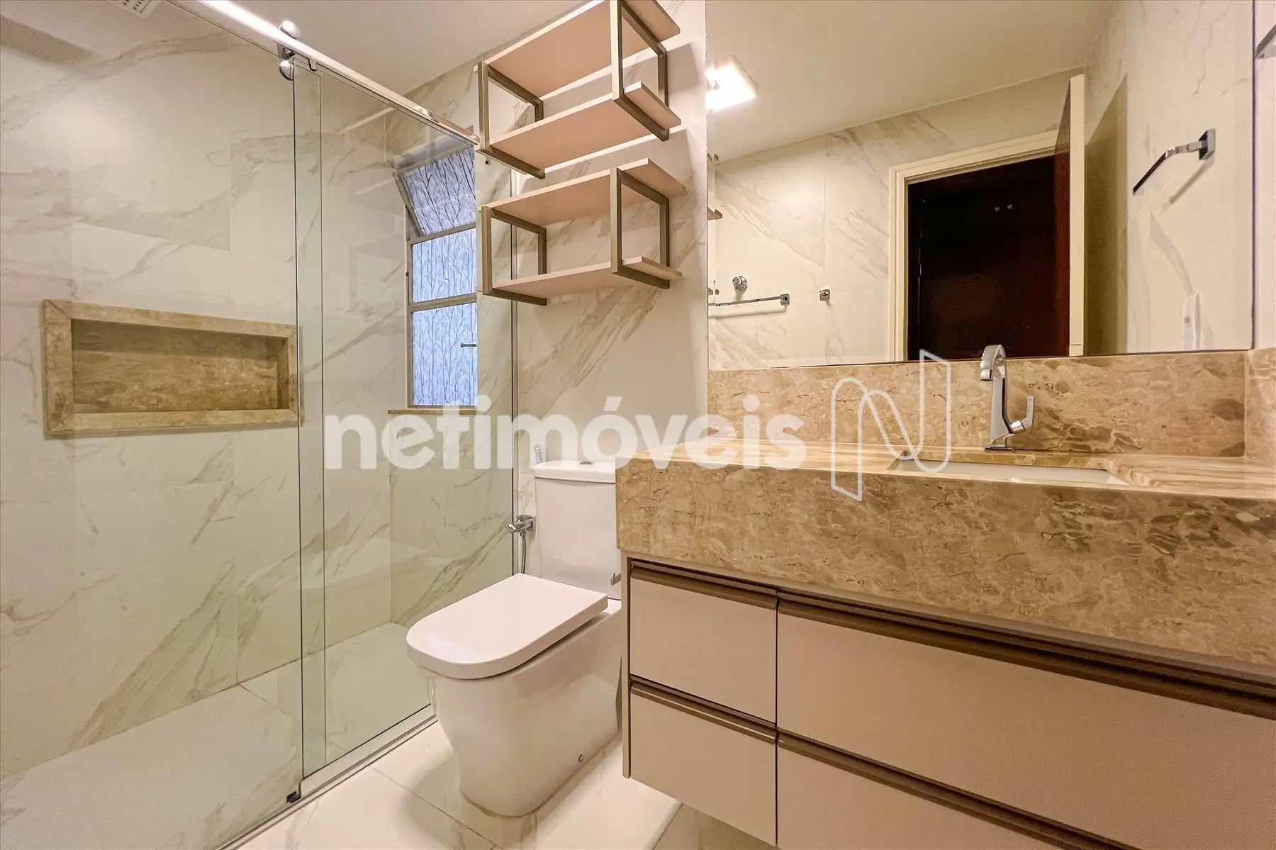 Banheiro social com revestimento em porcelanato, bancadas em granito, armários planejados, box em vidro temperado e espelho;