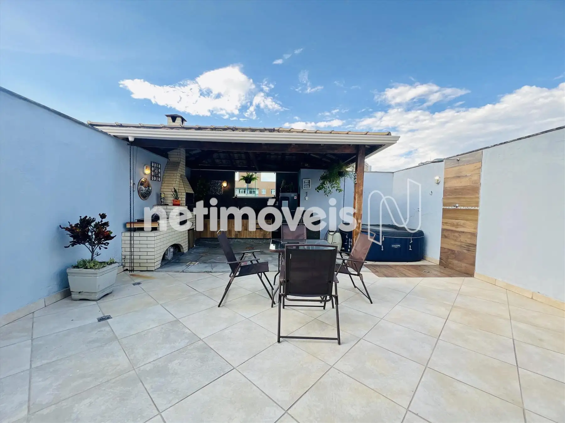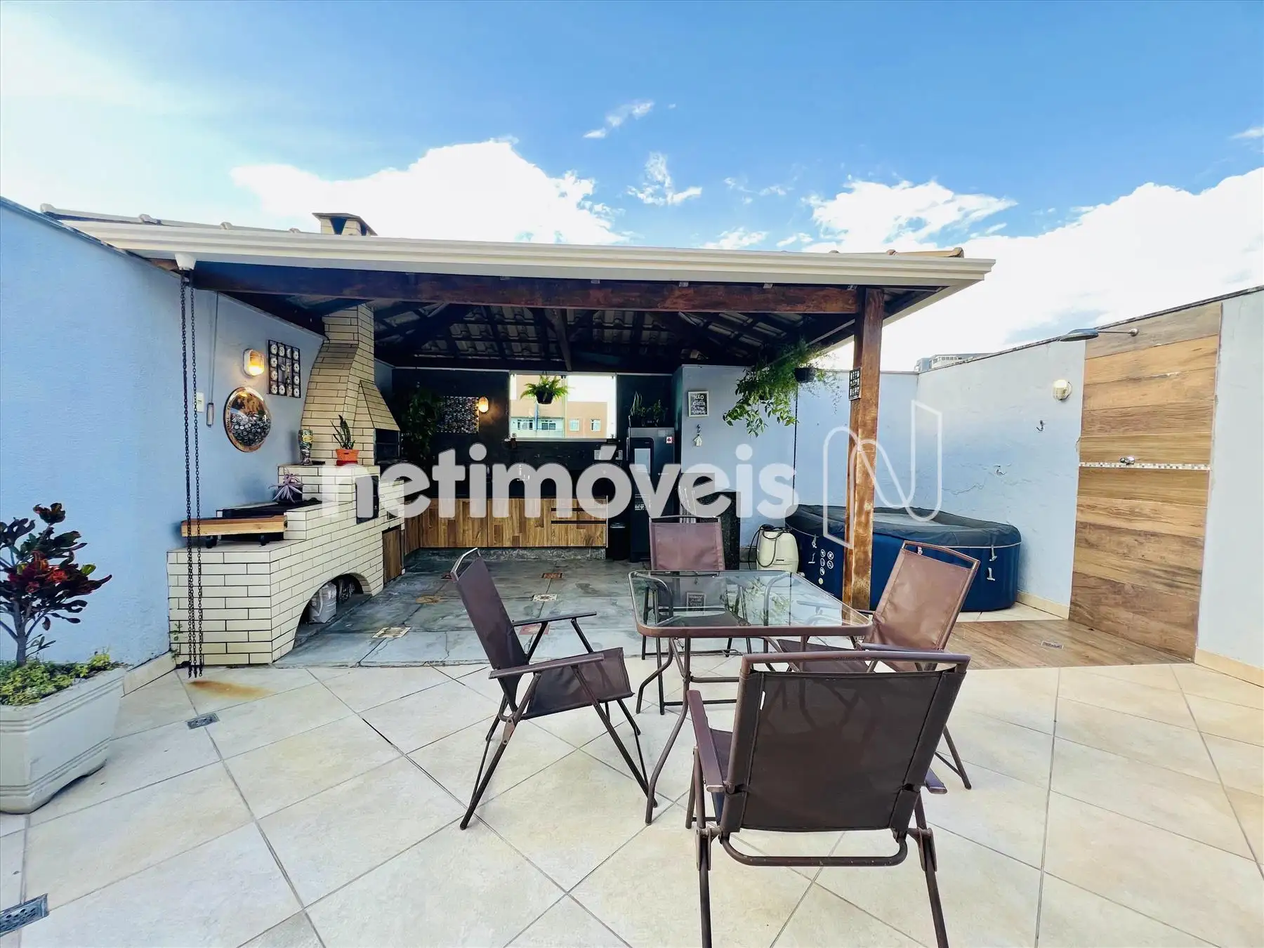 - Área gourmet com churrasqueira e fogão à lenha, bancadas em granito.