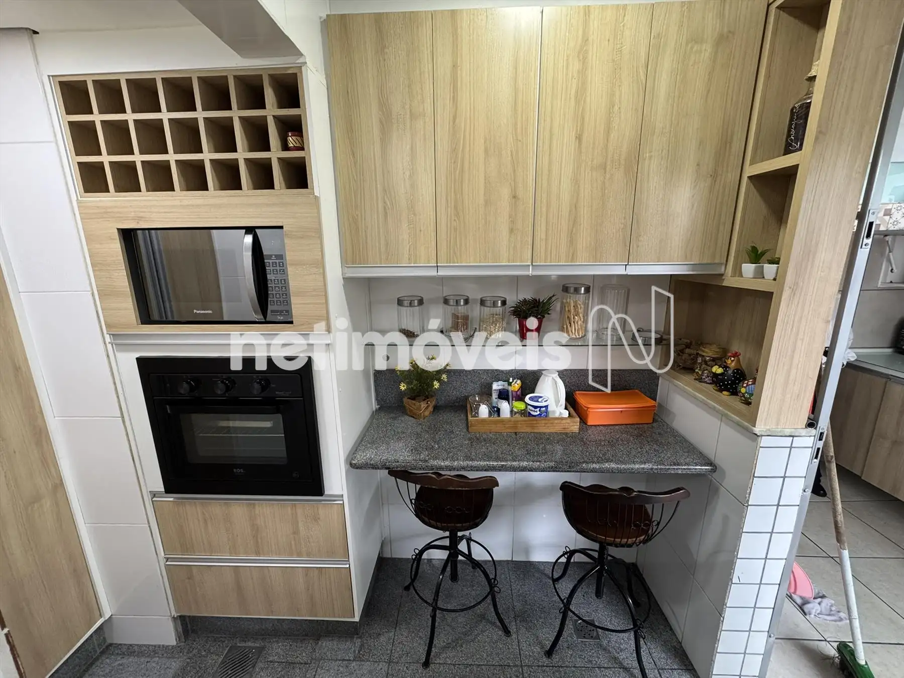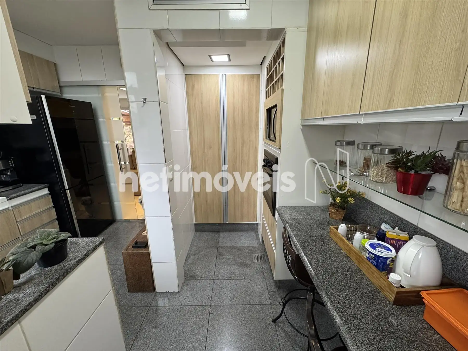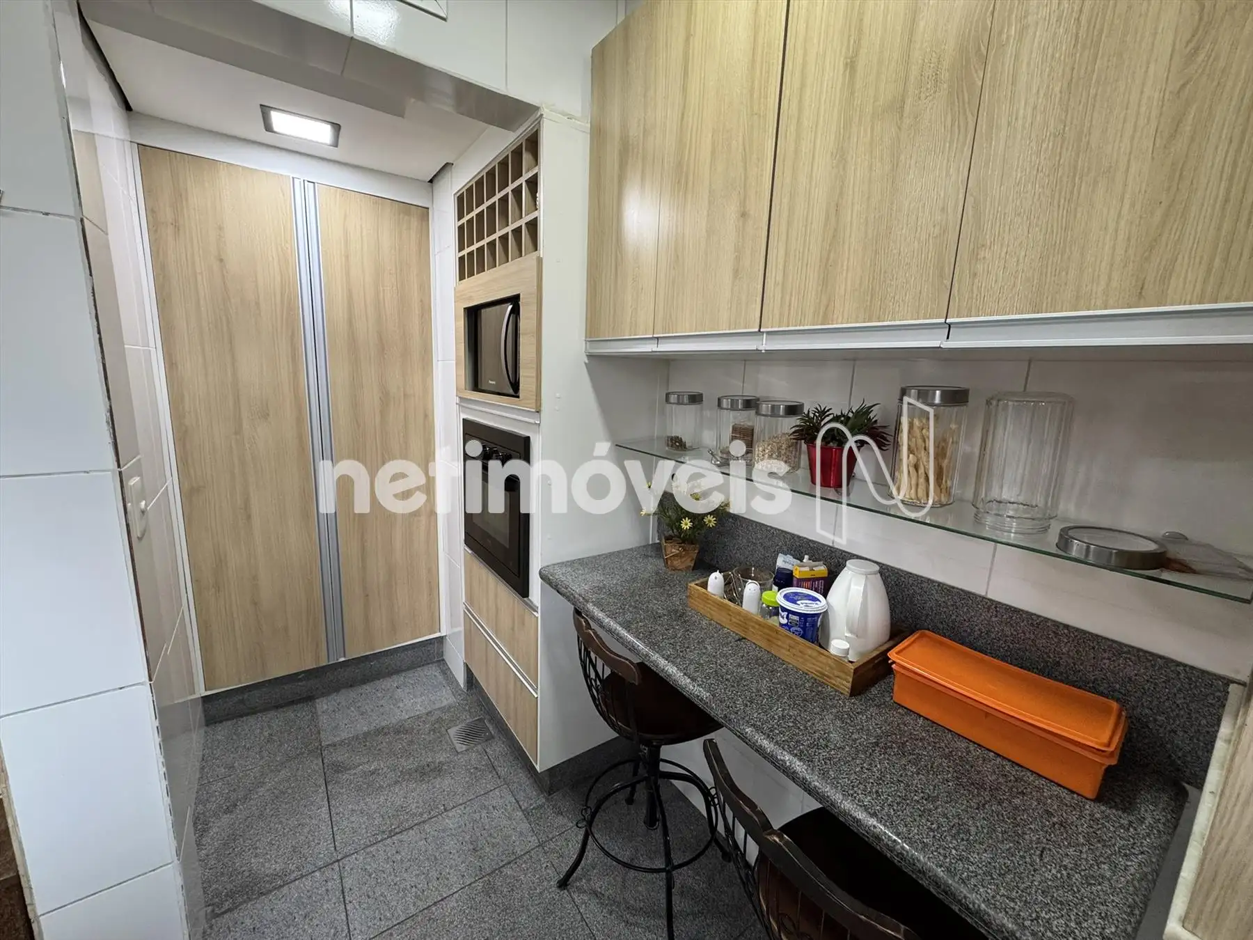Cozinha com armários, piso e bancada em granito.