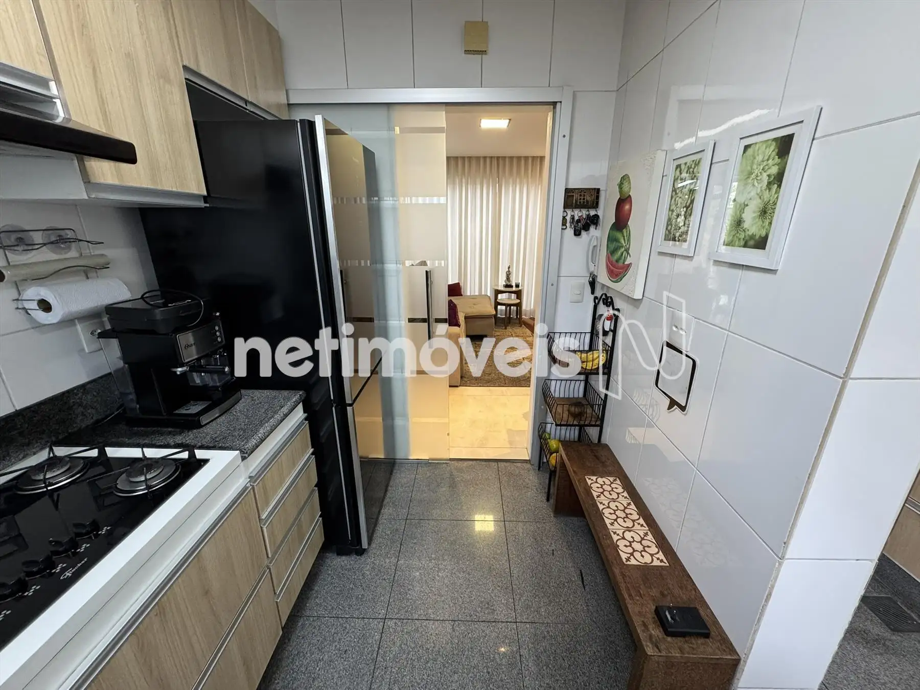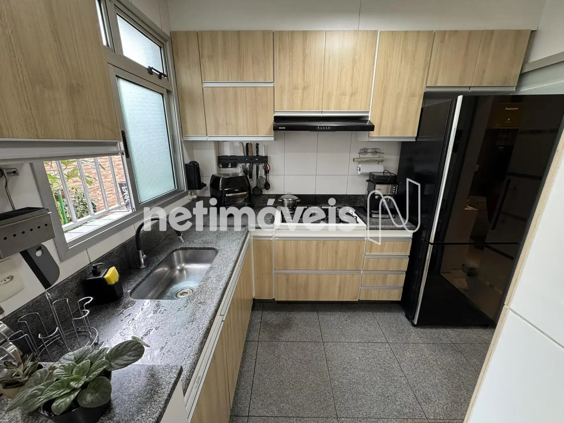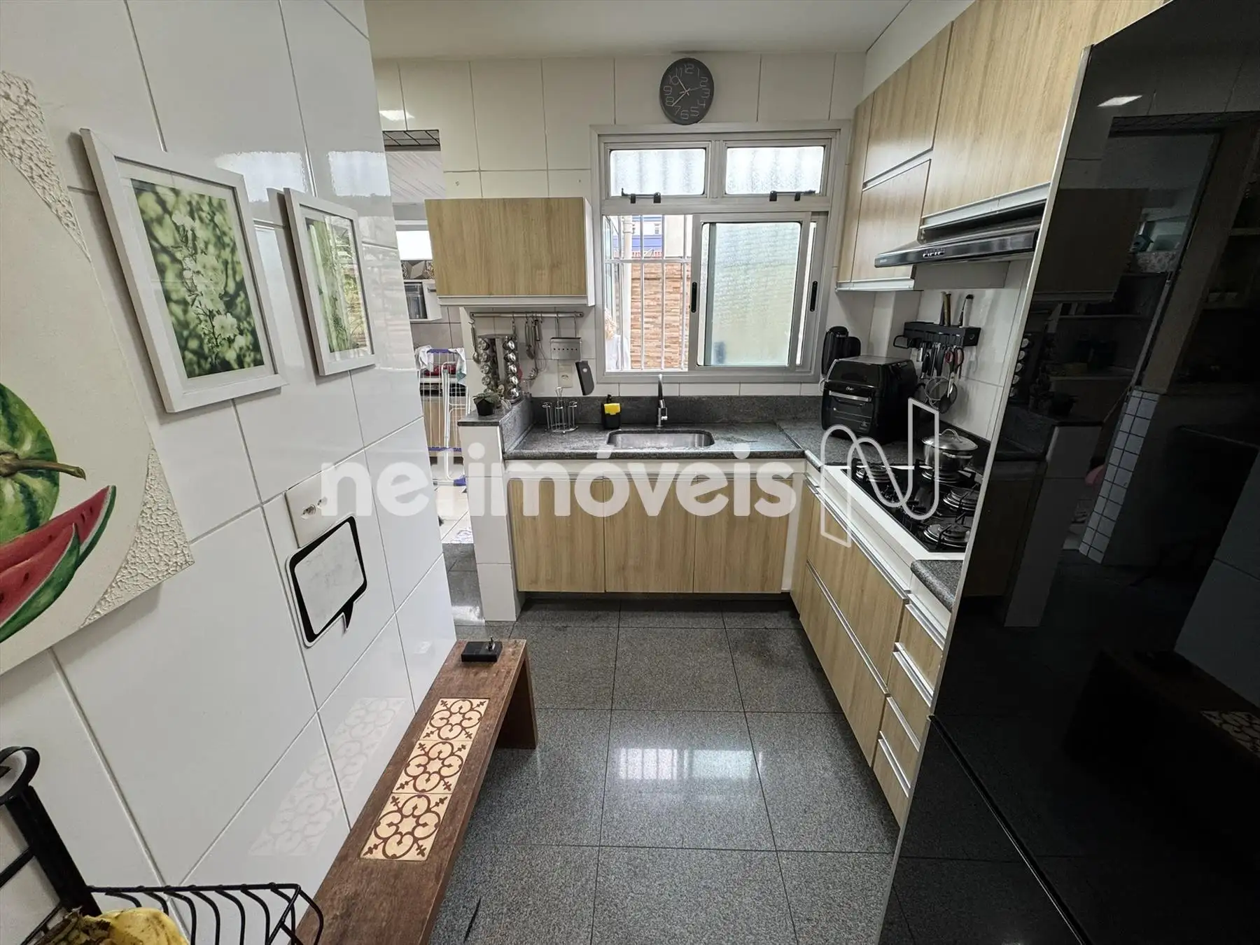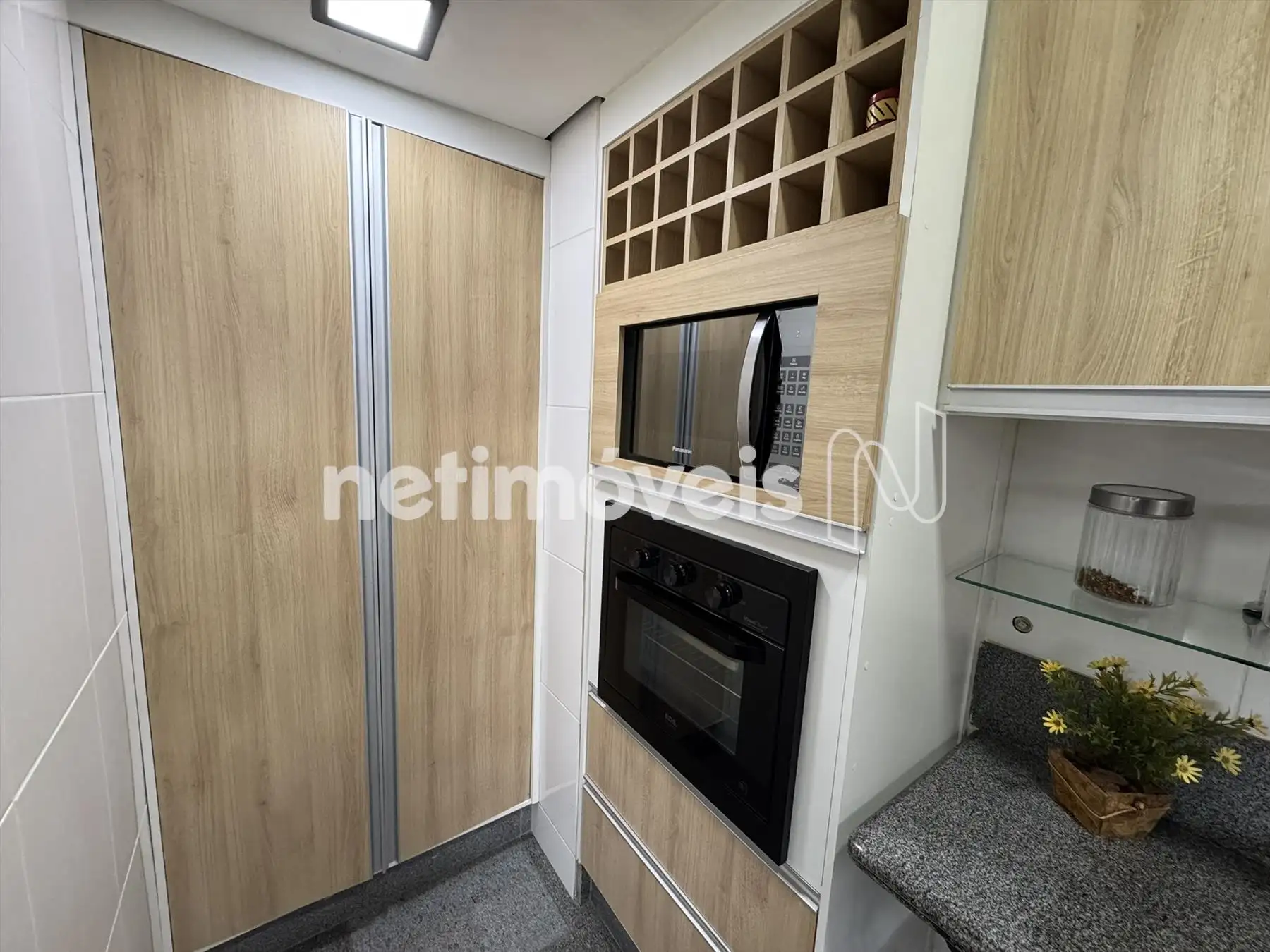 Cozinha com armários, piso e bancada em granito.