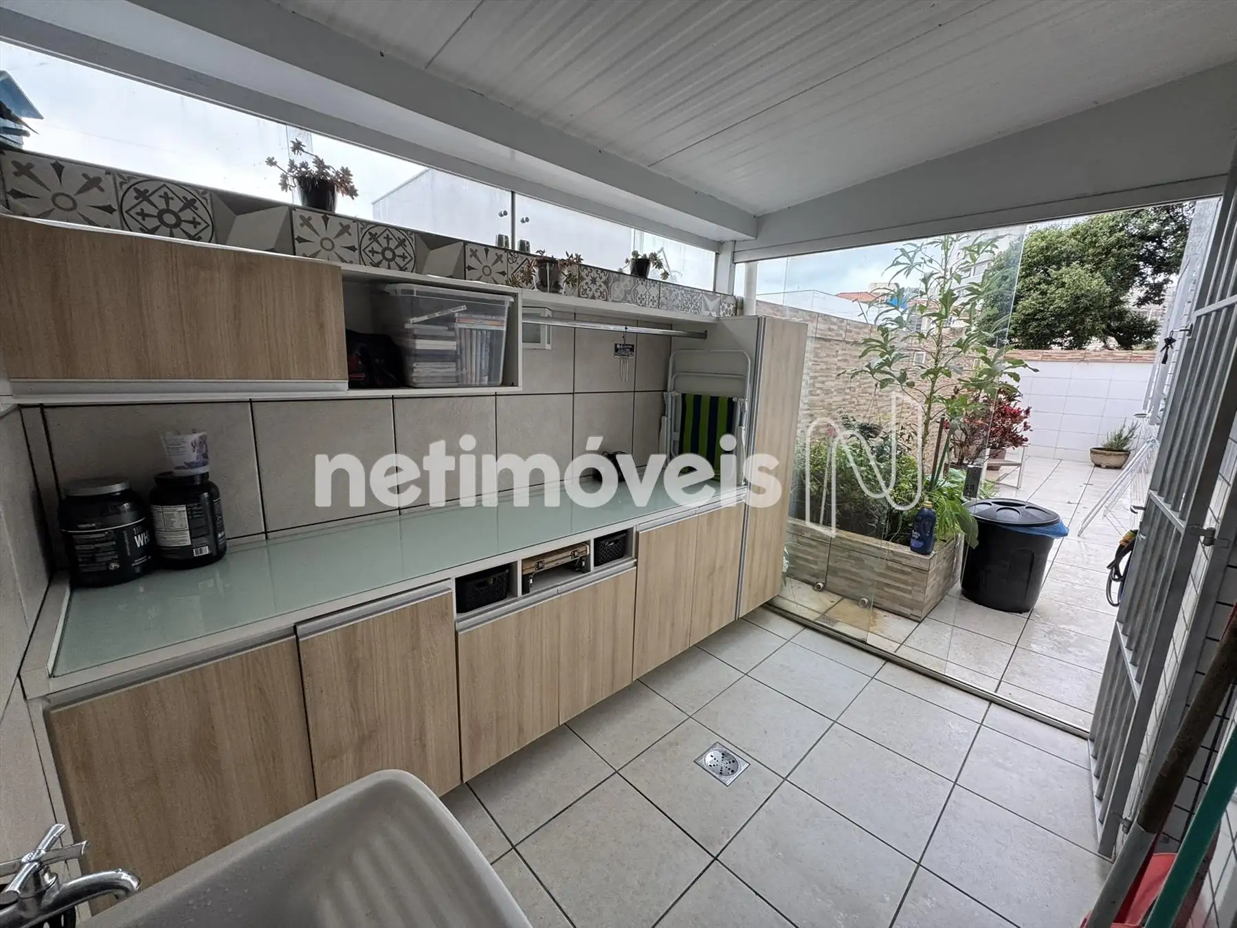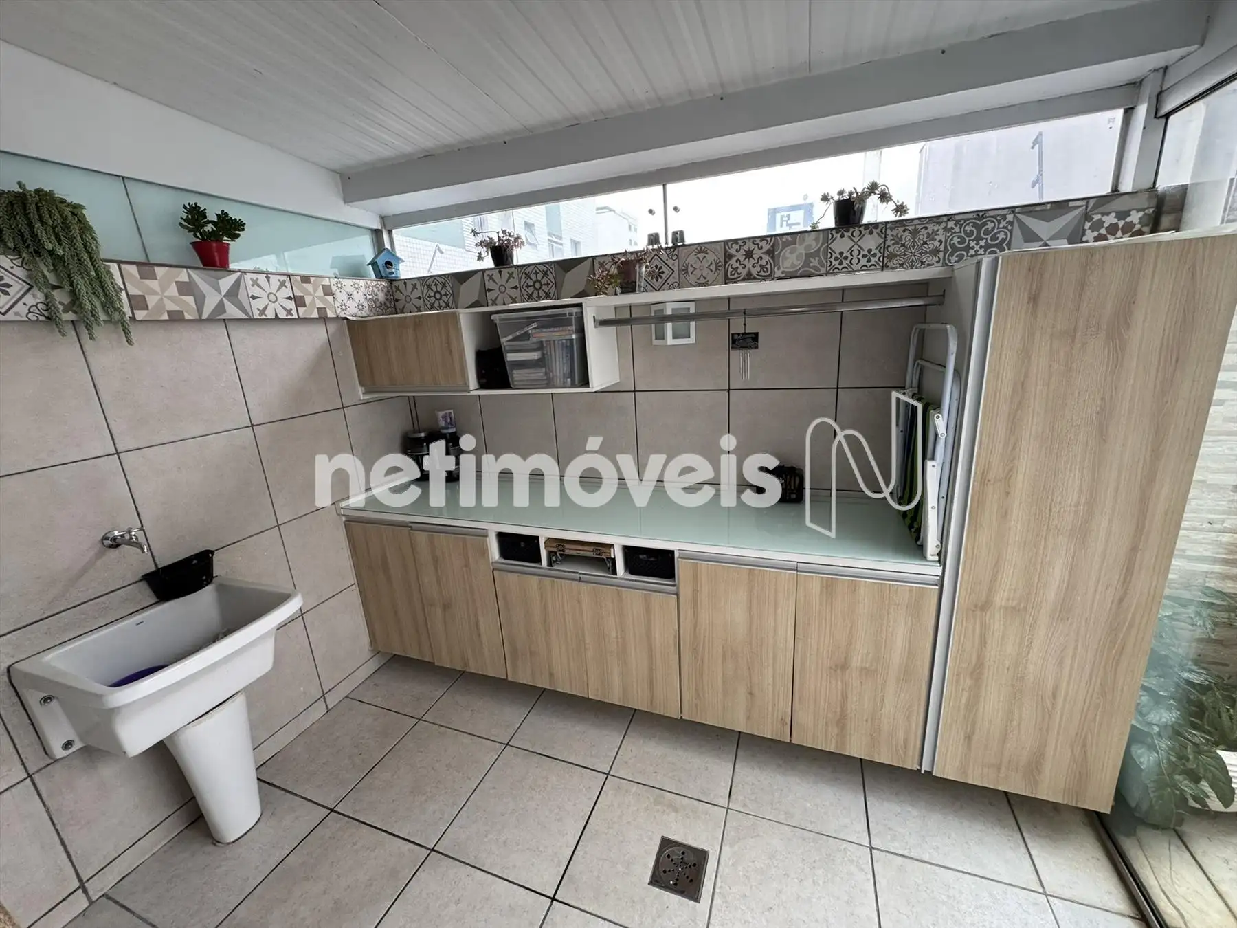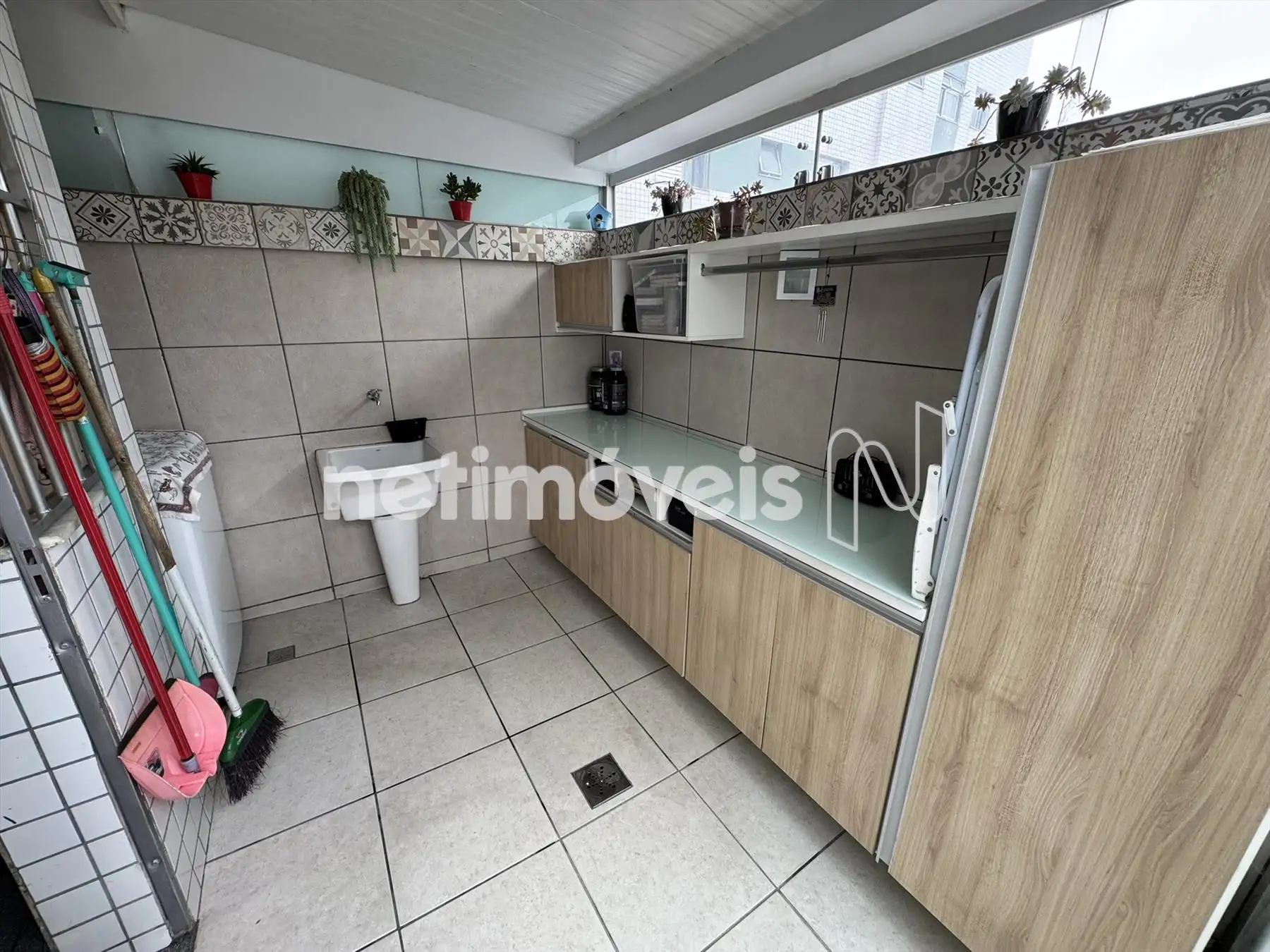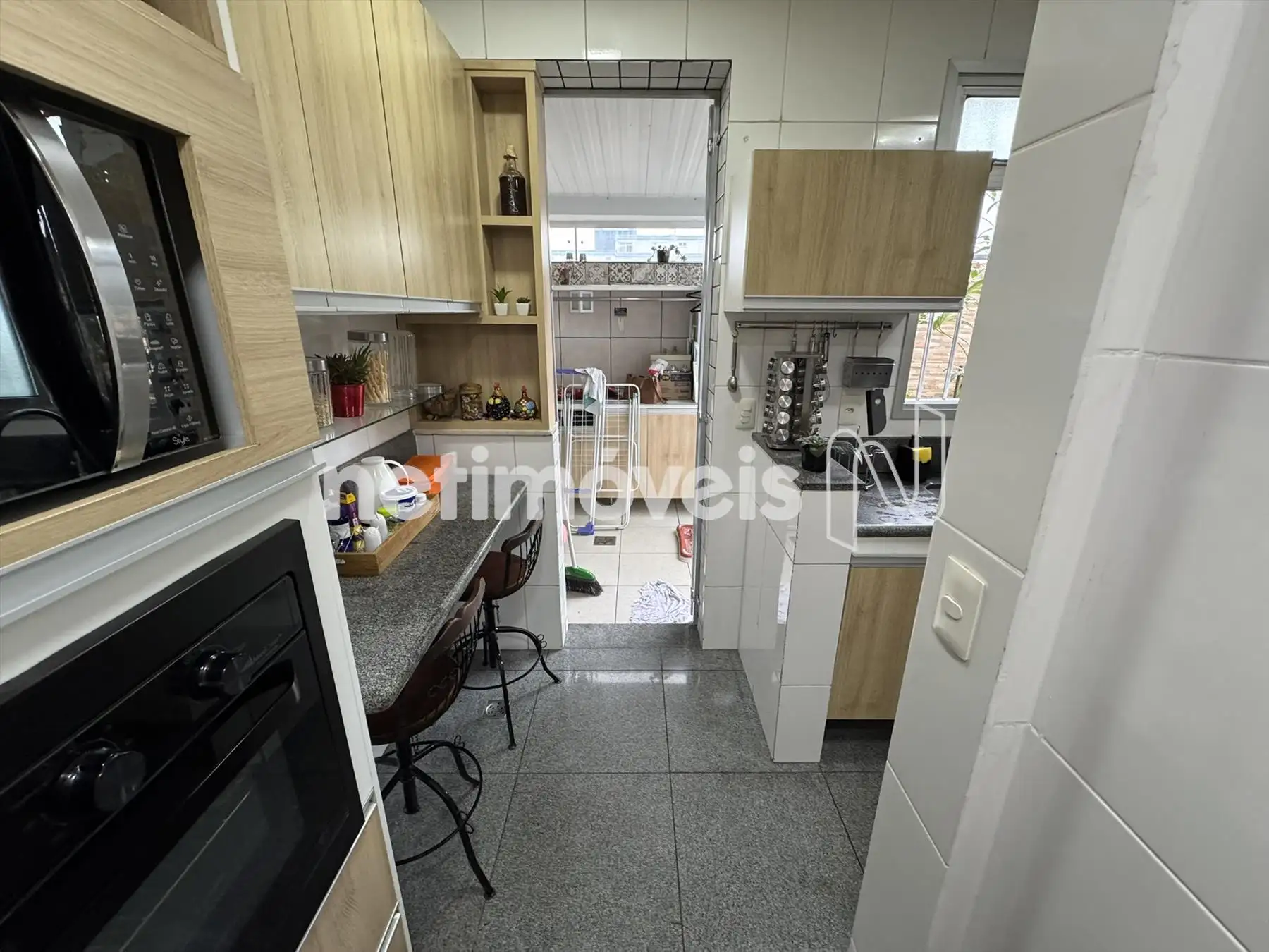 Área de serviço com armários, piso e bancada em granito.