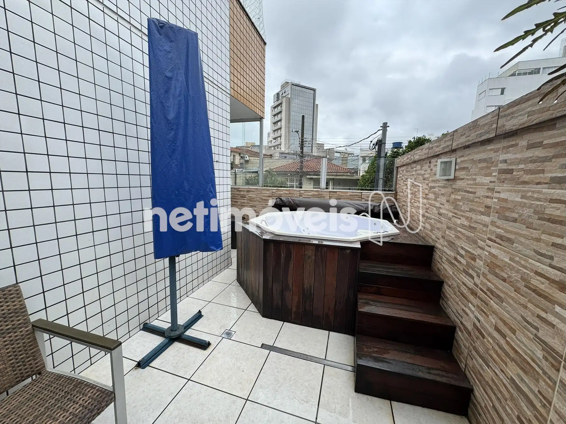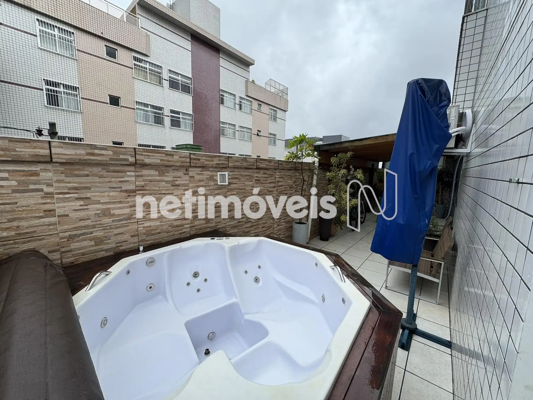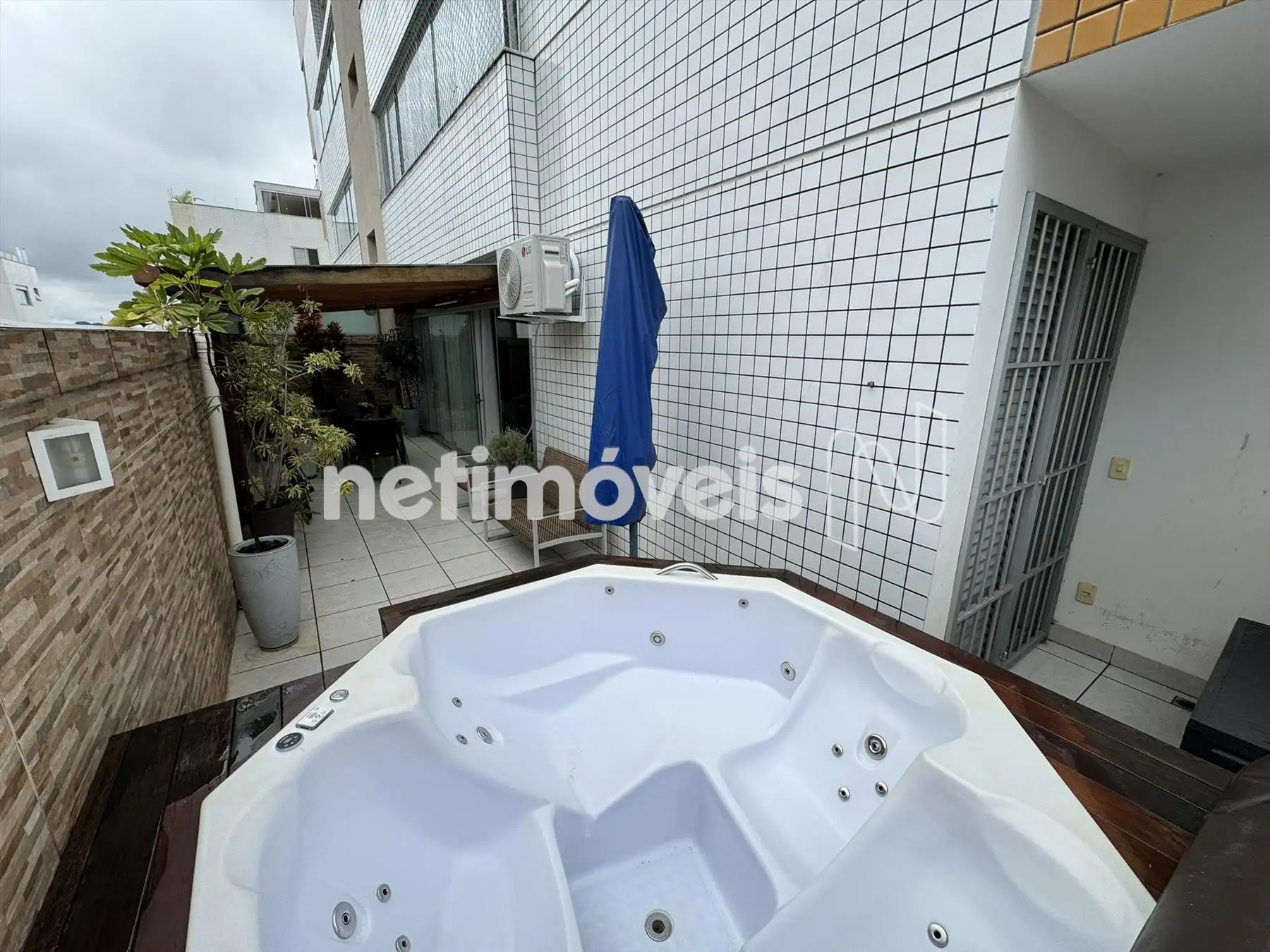 Área privativa com piso em porcelanato, Jacuzzi, churrasqueira e duas entrada pelas laterais do apartametno, sendo uma pela sala e outra pela área de serviço.