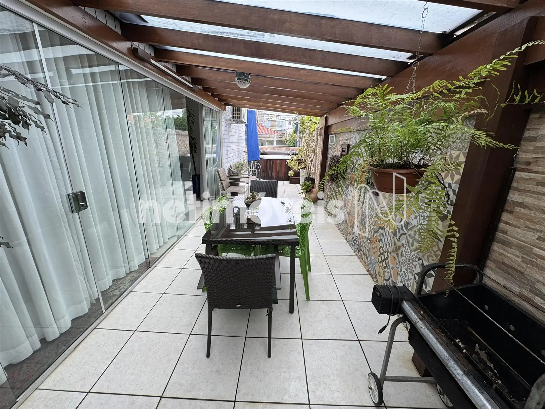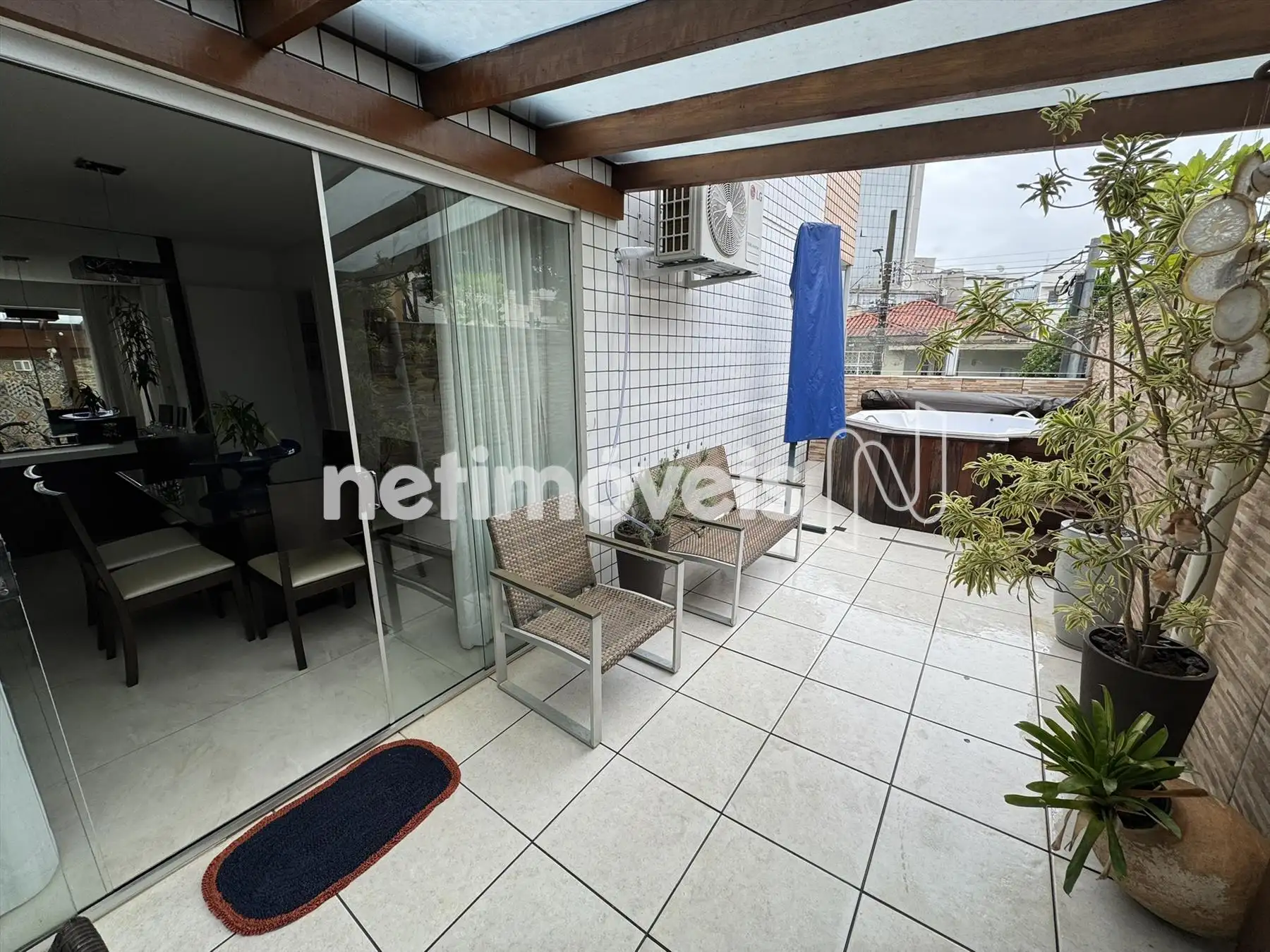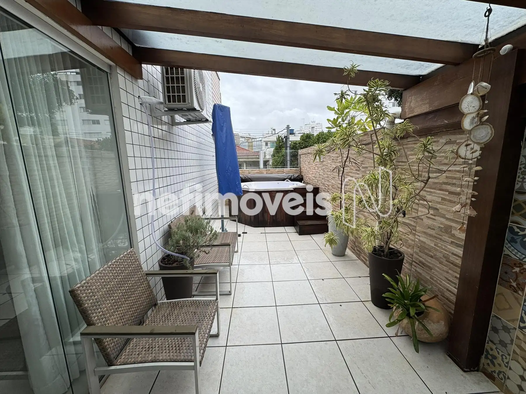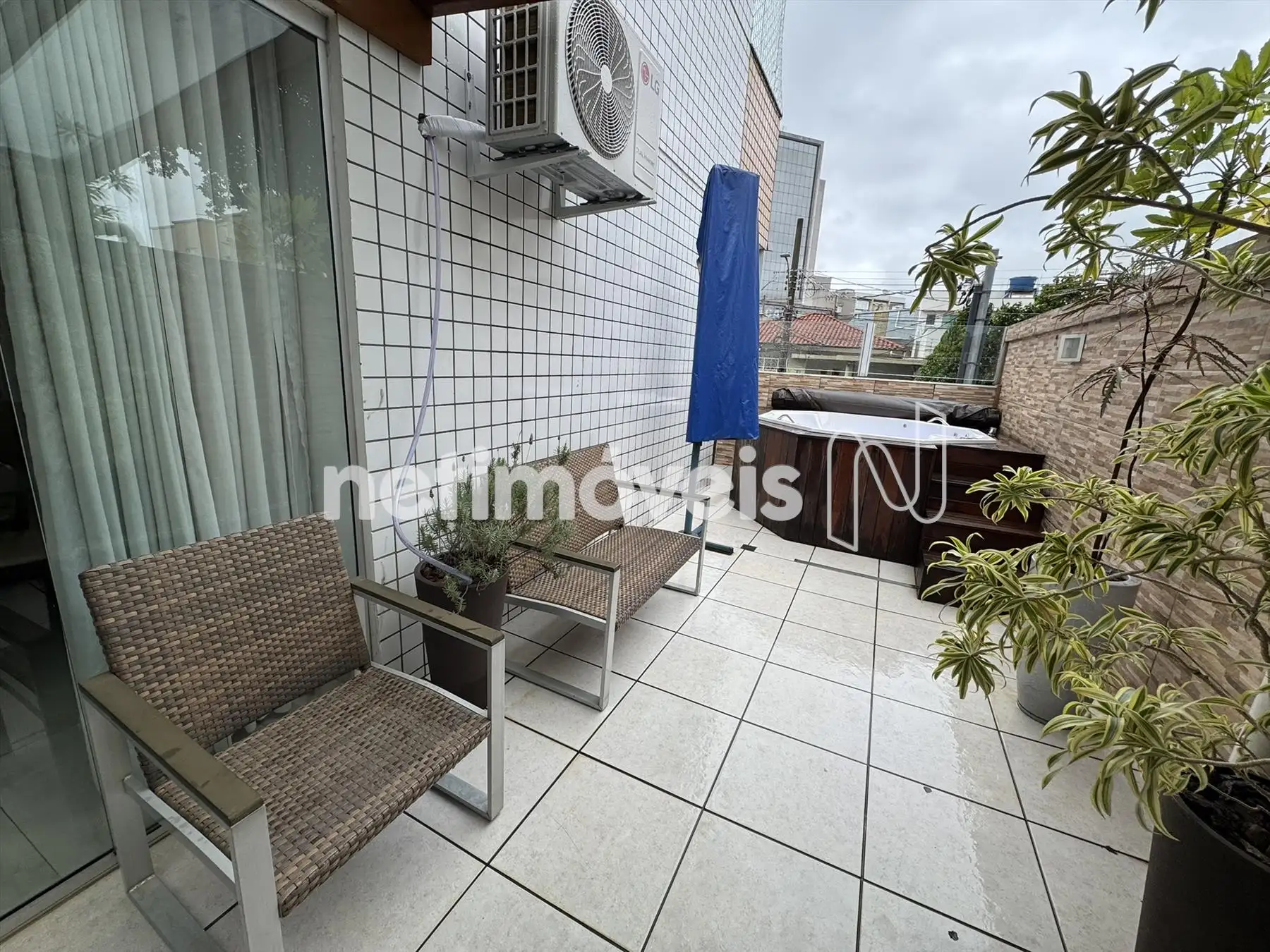 Área privativa com piso em porcelanato, Jacuzzi, churrasqueira e duas entrada pelas laterais do apartametno, sendo uma pela sala e outra pela área de serviço.