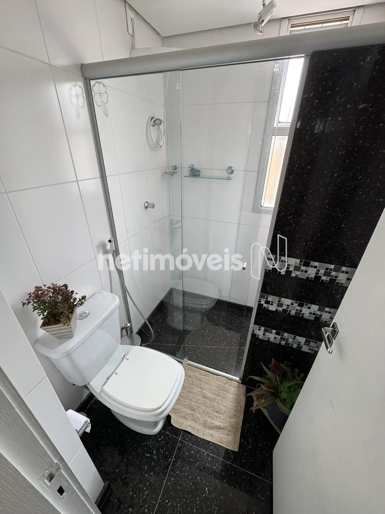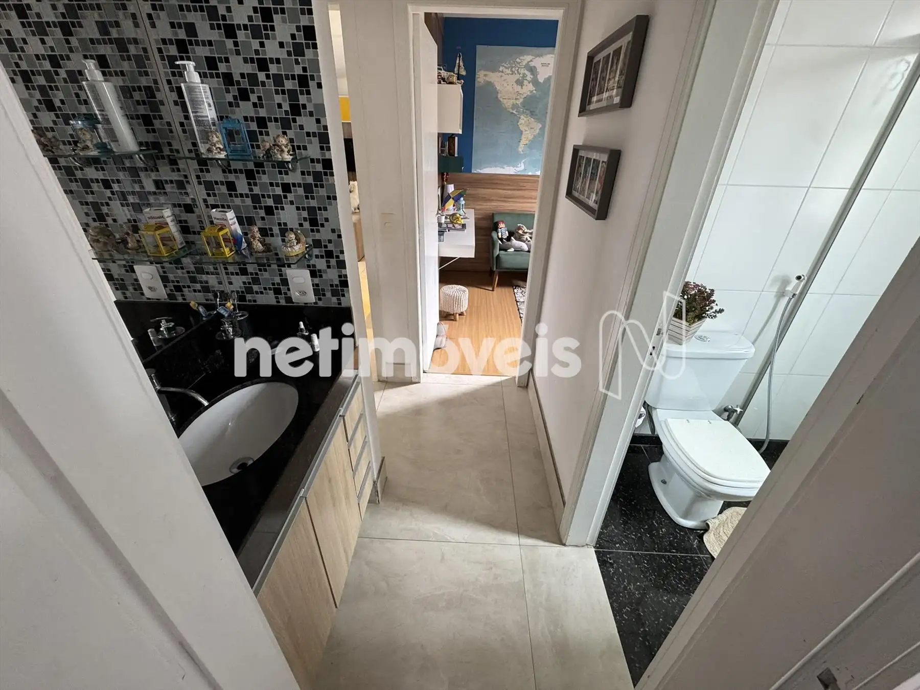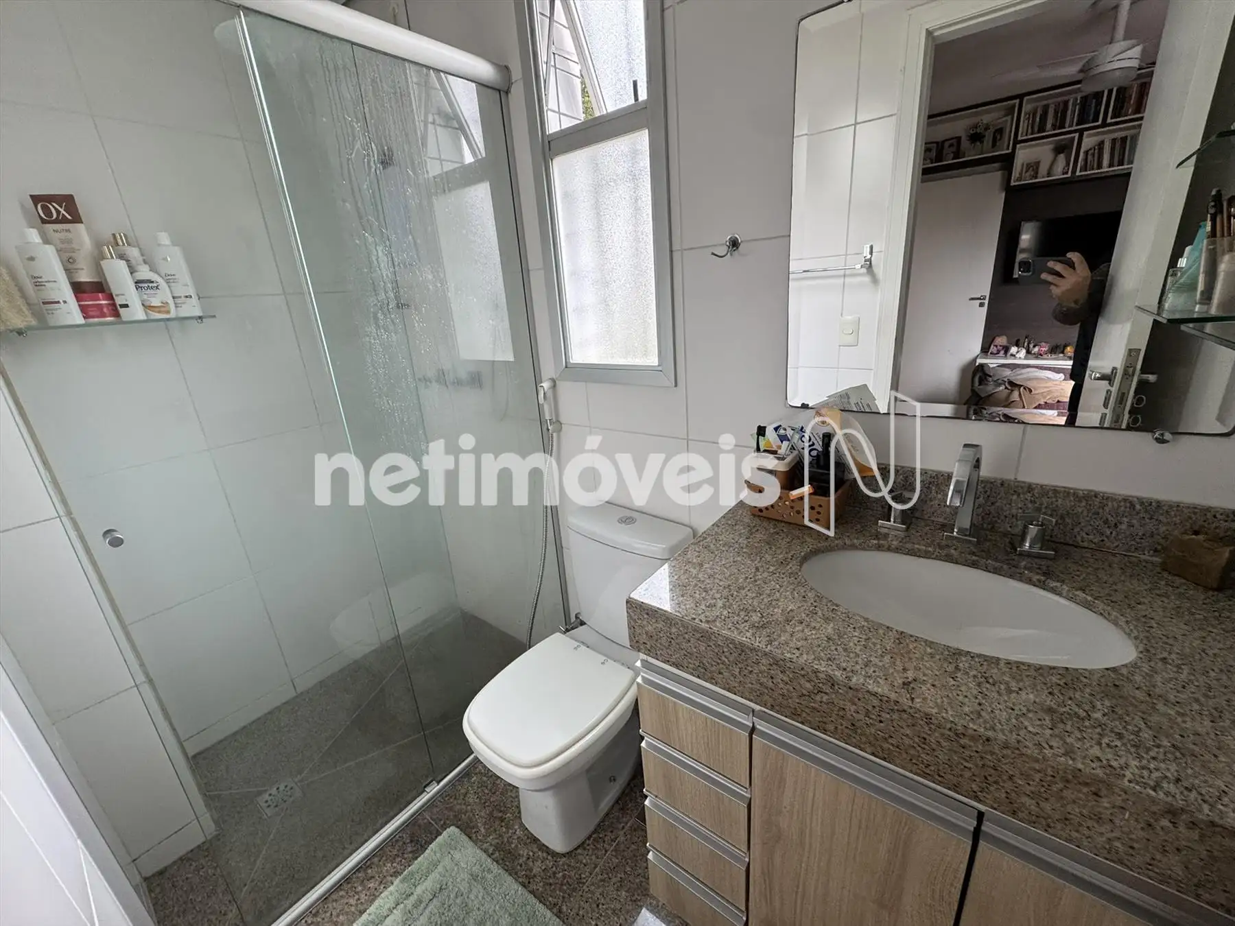 Banho social com armários, box blindex, piso e bancada em granito.