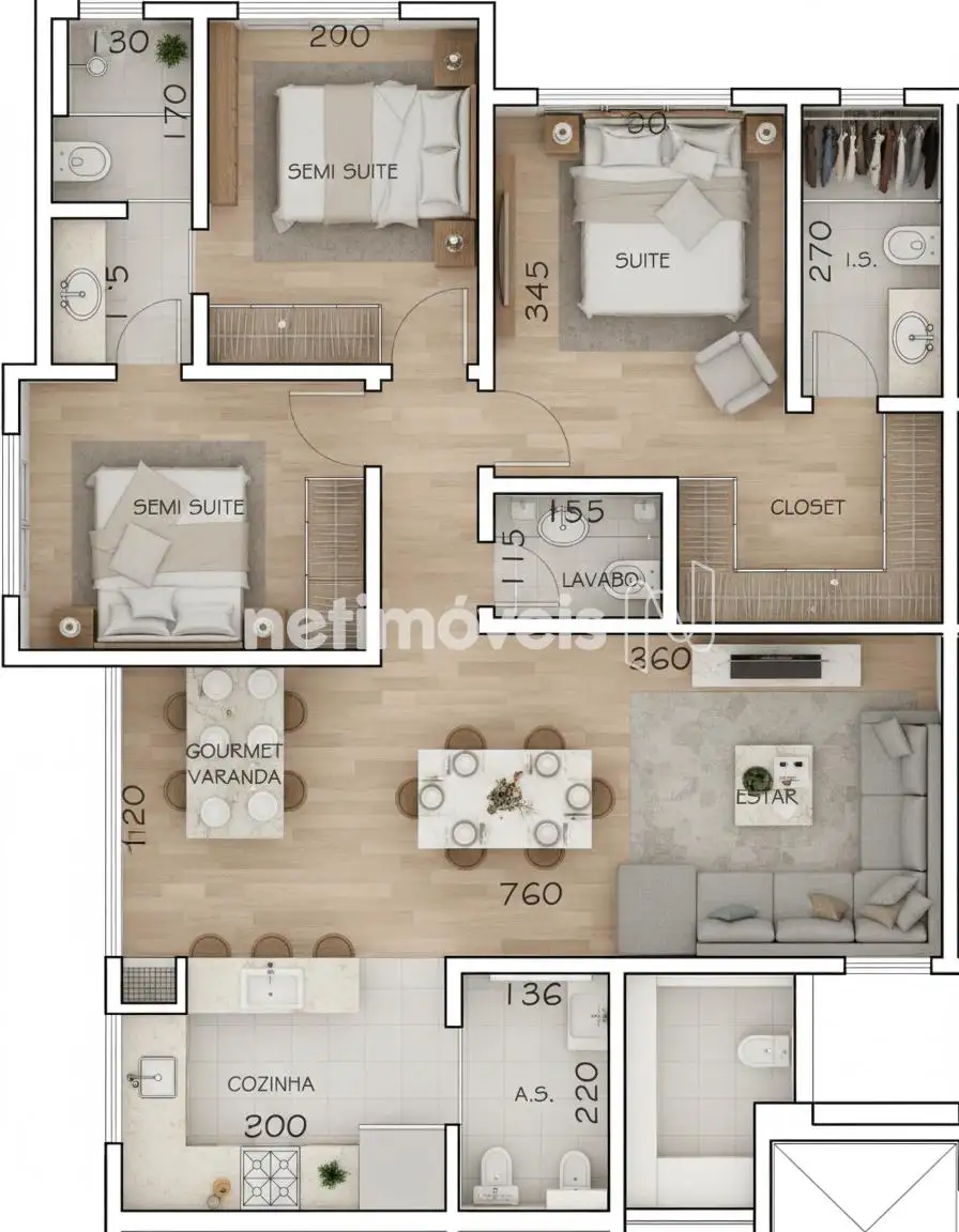 - 3 quartos com piso em vinílico, sendo 1 suíte com closet e 2 semi suítes