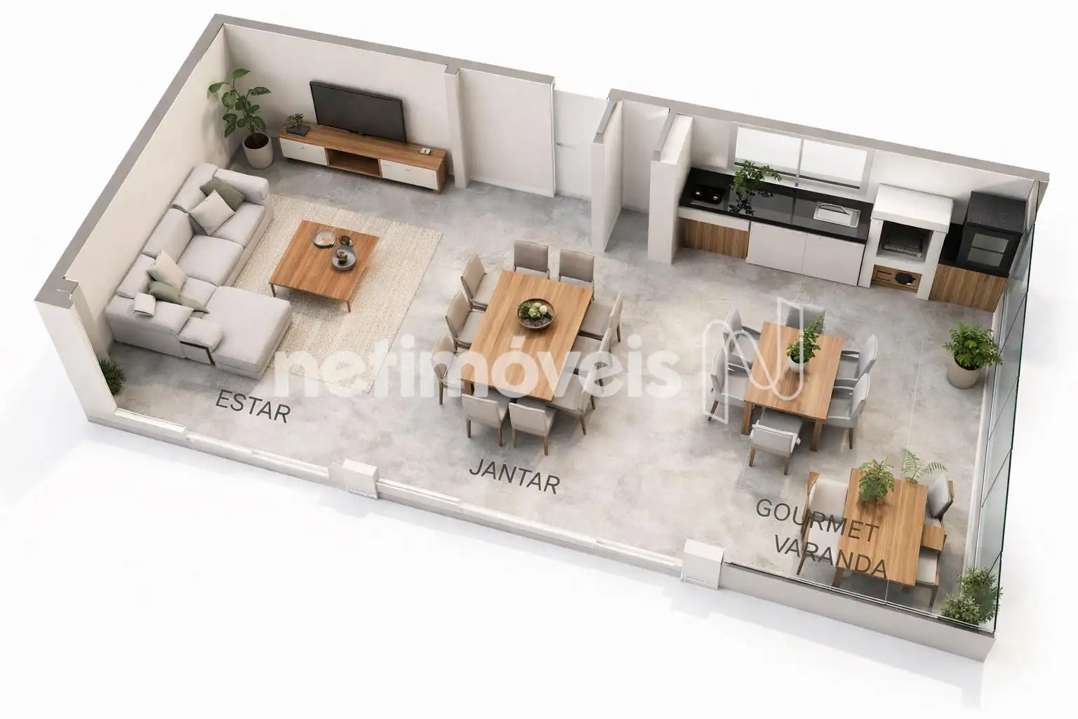 - Sala de estar, jantar e varanda gourmet integradas, com piso em porcelanato
