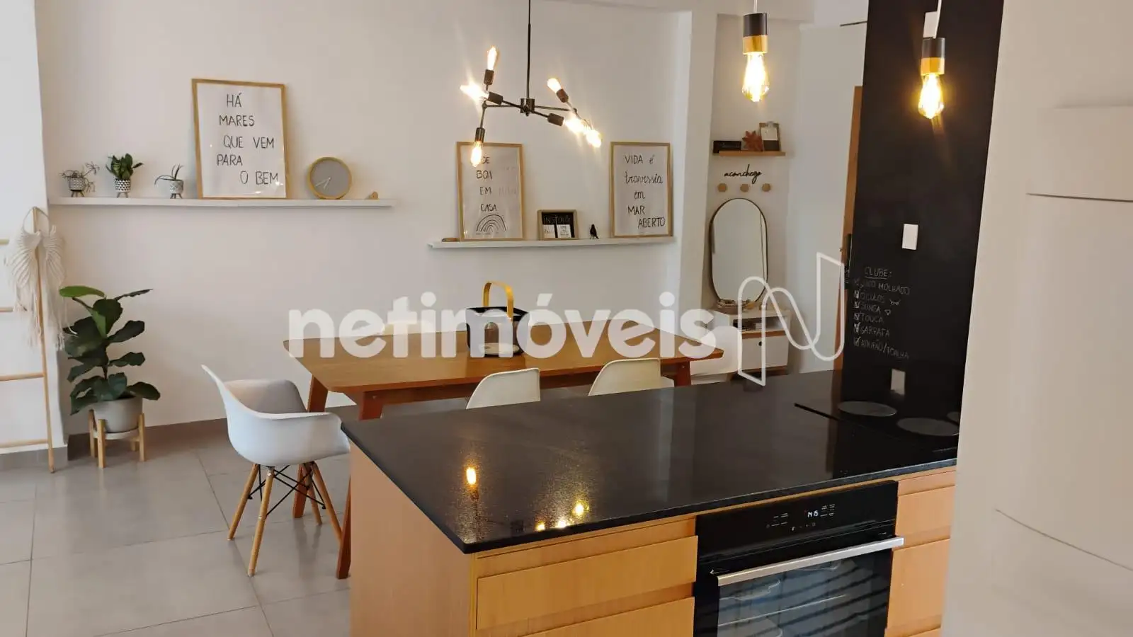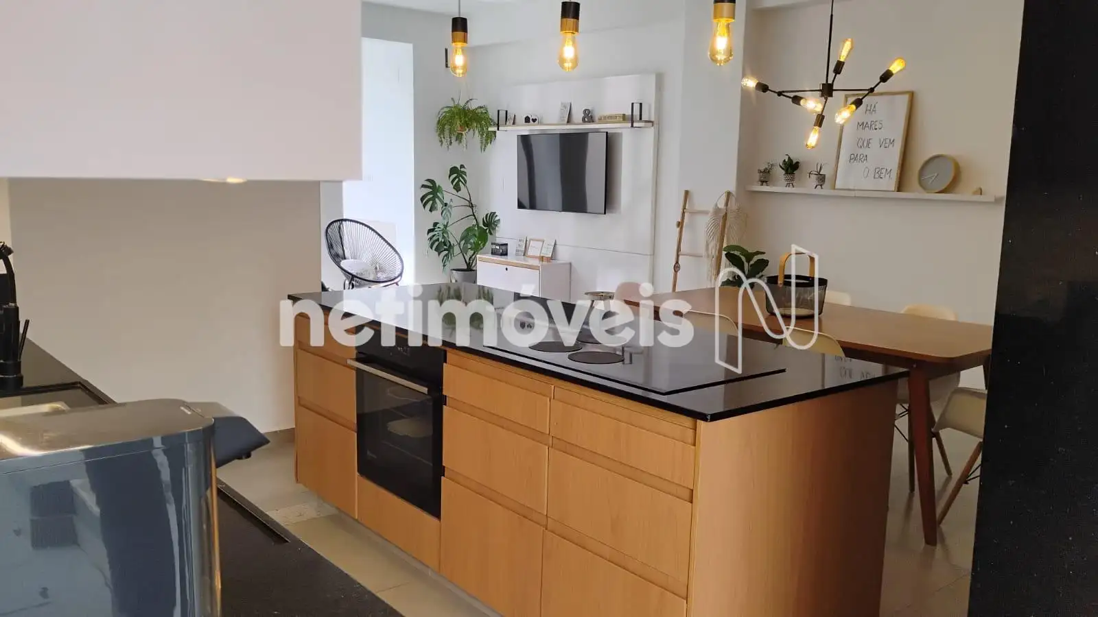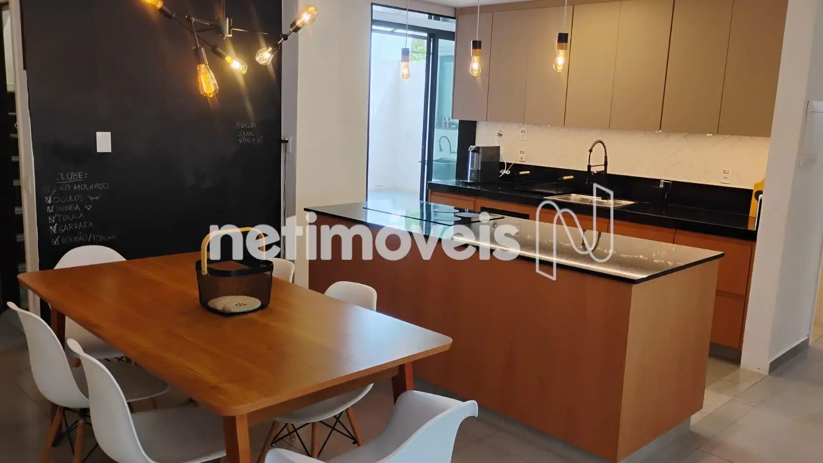 - cozinha americana, com bancada em granito preto e iluminação planejada, fogão por indução e lava louças;