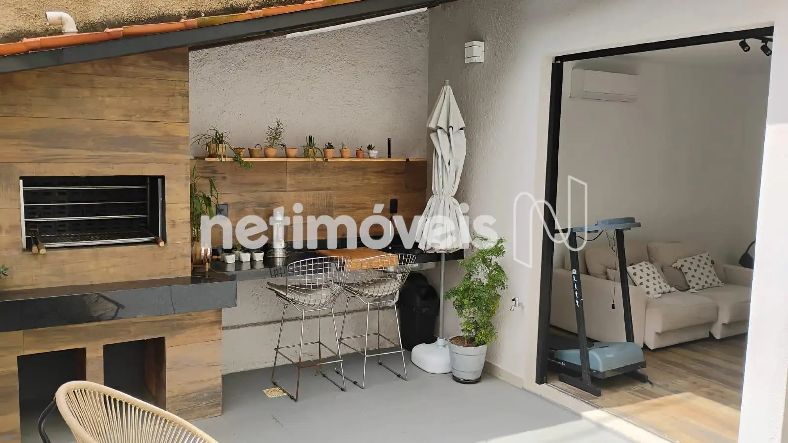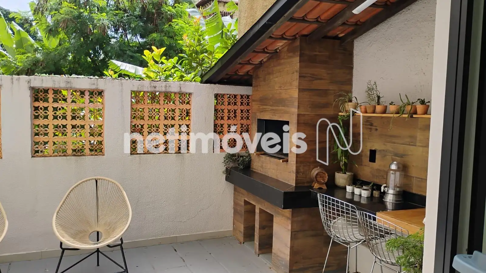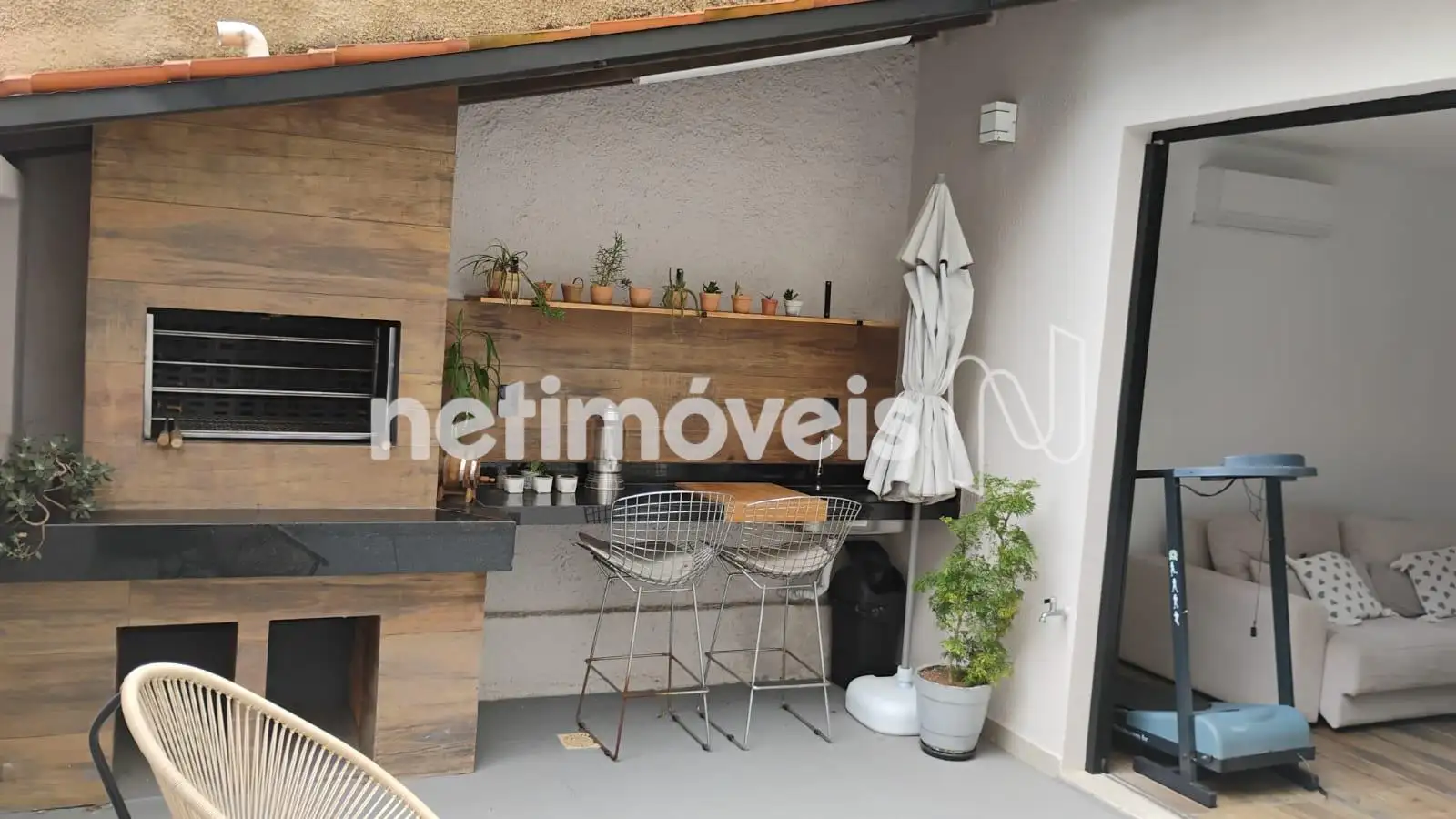 - área gourmet com churrasqueira e bancada em granito;