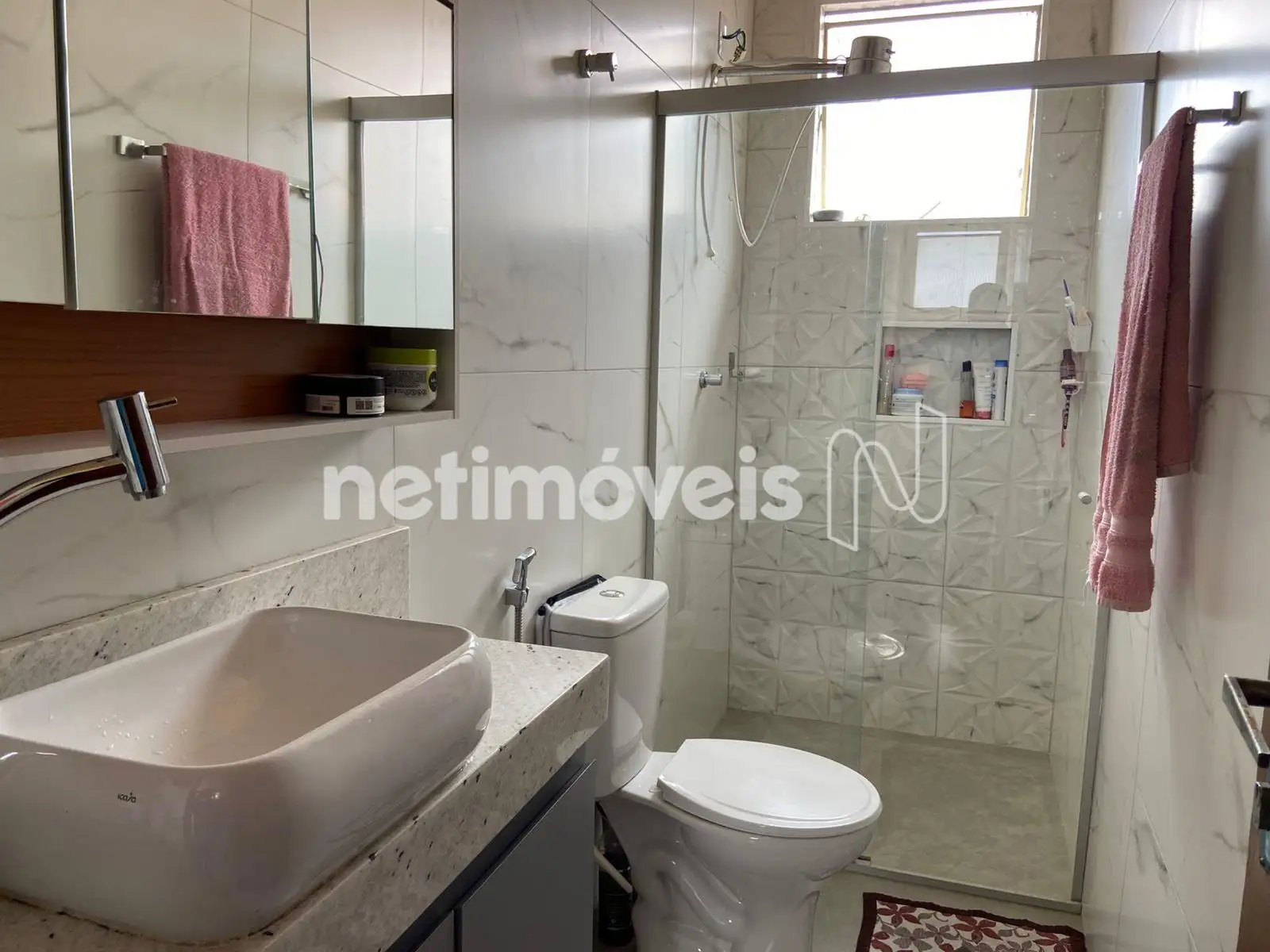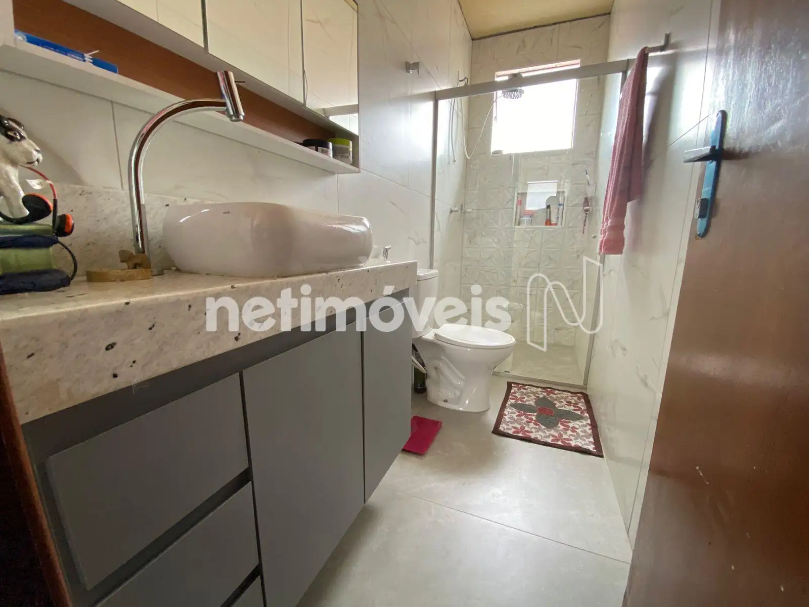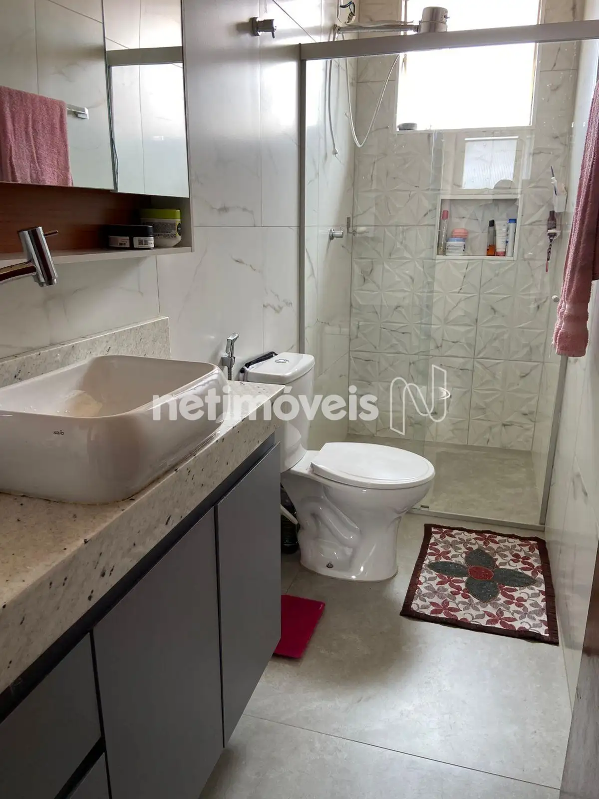 O banheiro social possui armário, bancada com cuba suspensa e box em blindex, com bom padrão de acabamento.