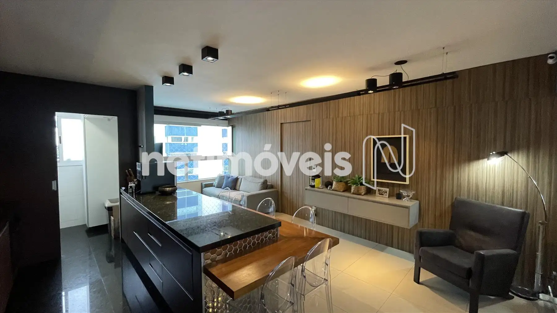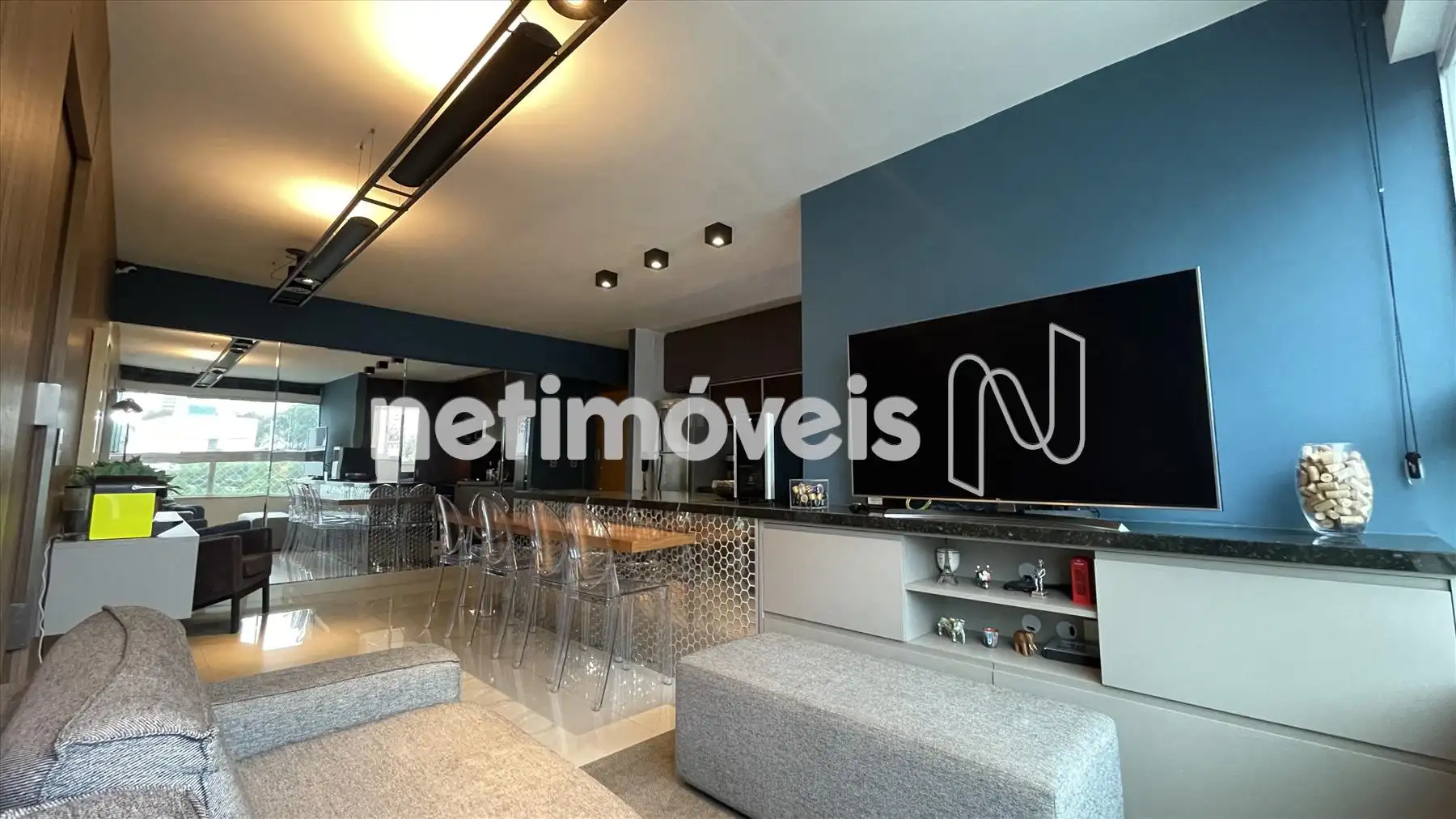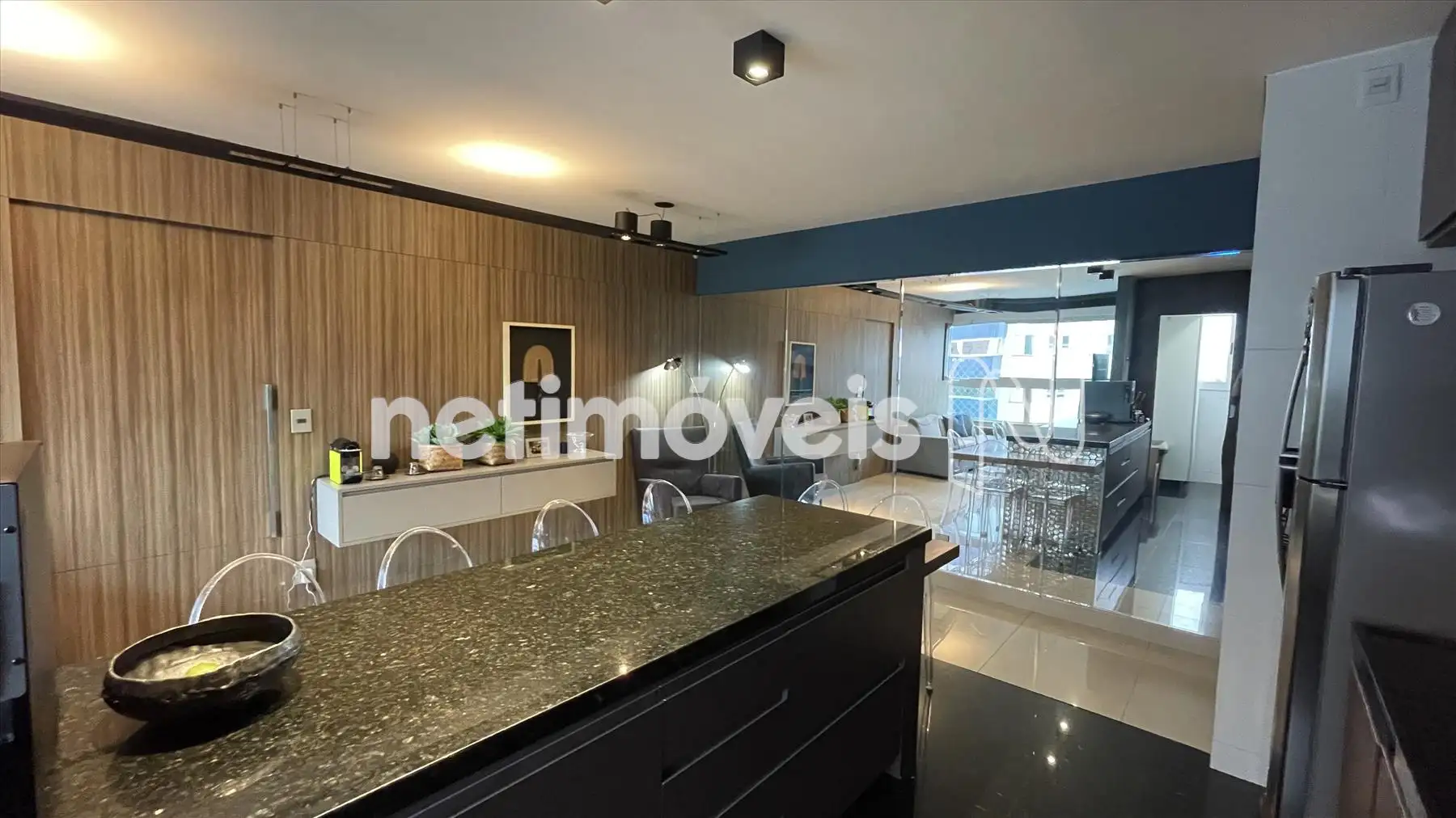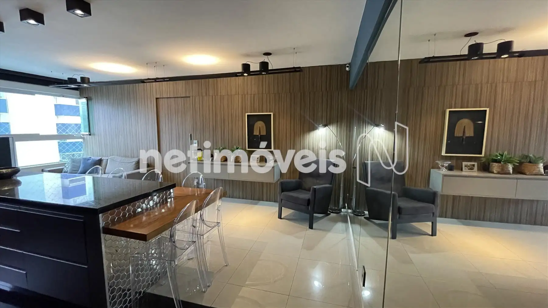Sala com cozinha e varanda integrada, com painel espelhado, ilha em granito, painel de TV e projeto luminotécnico