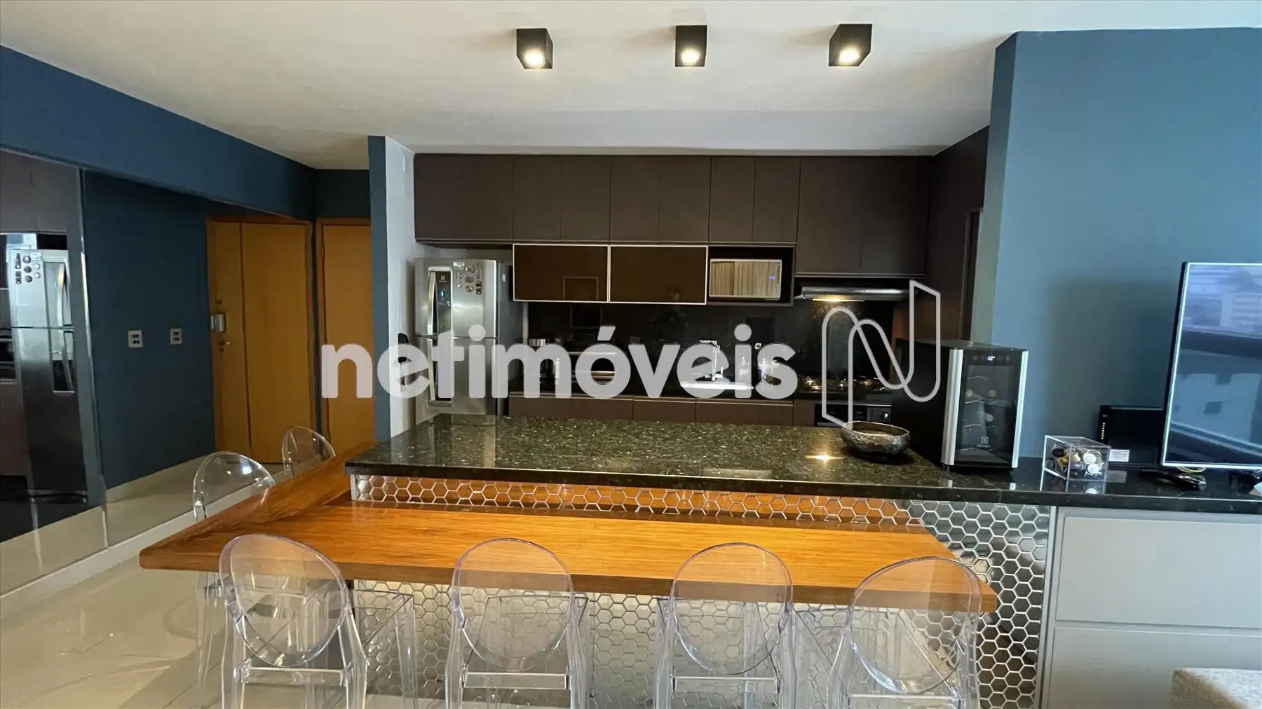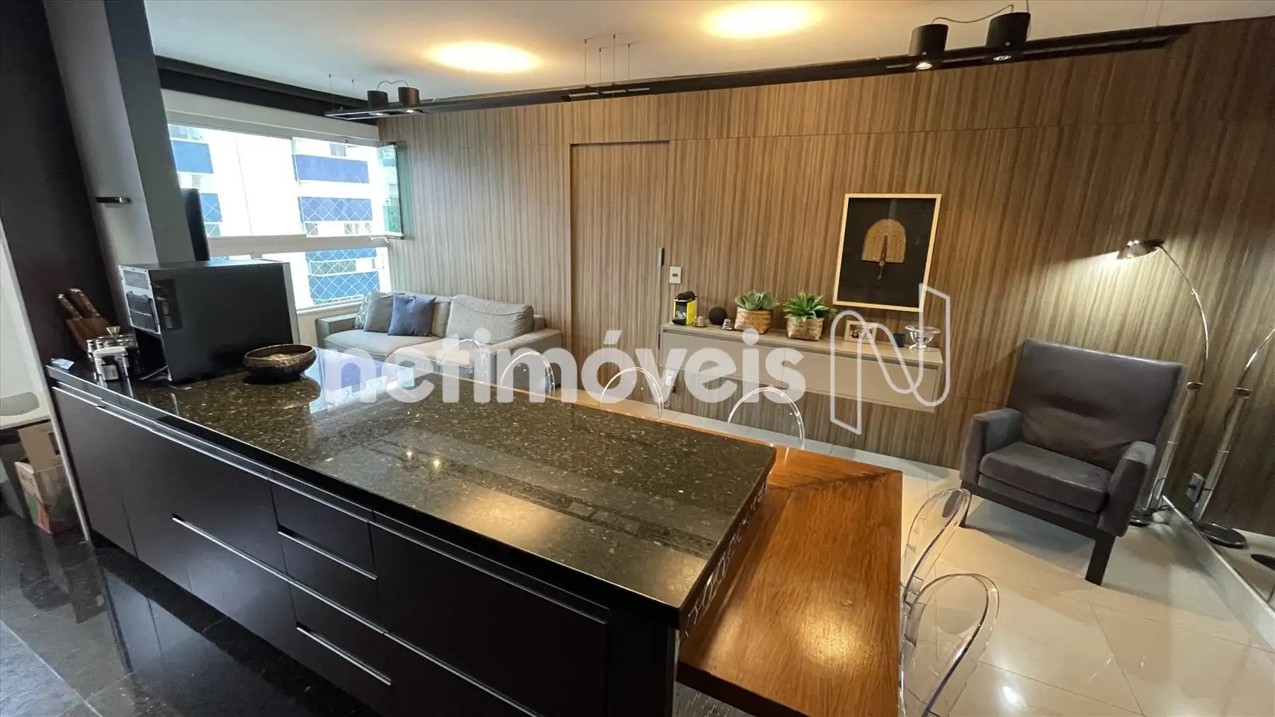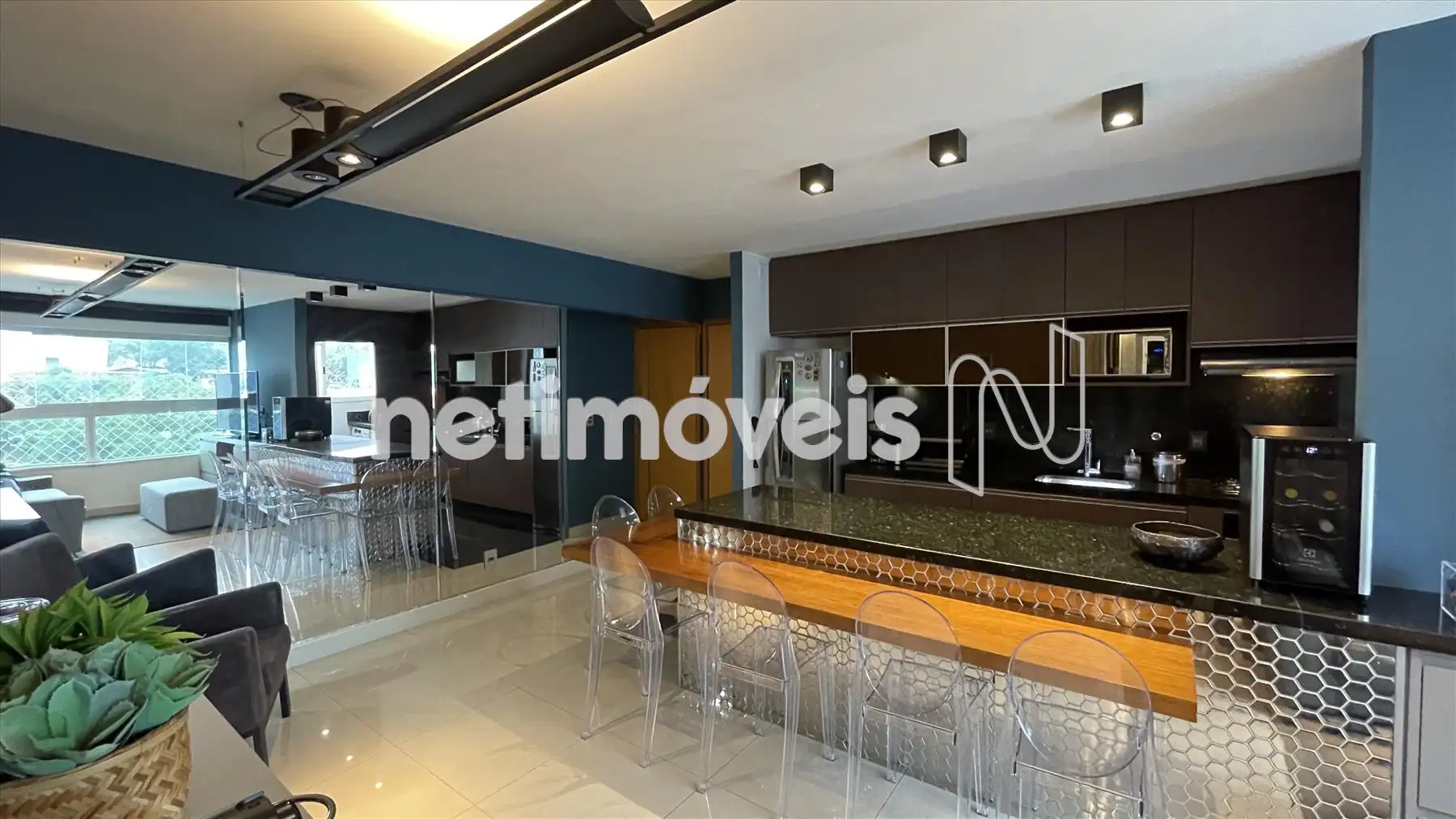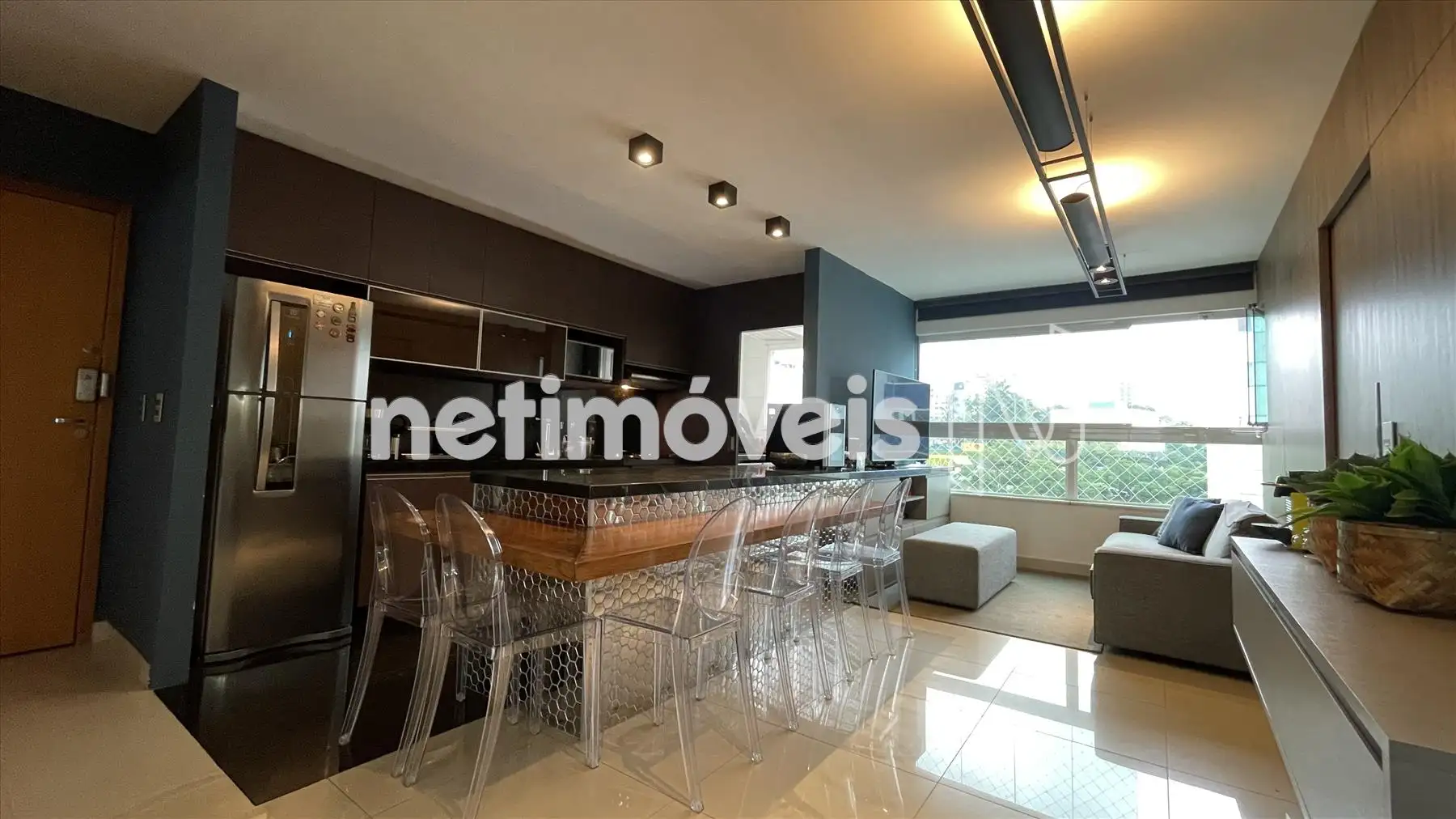 Sala com cozinha e varanda integrada, com painel espelhado, ilha em granito, painel de TV e projeto luminotécnico