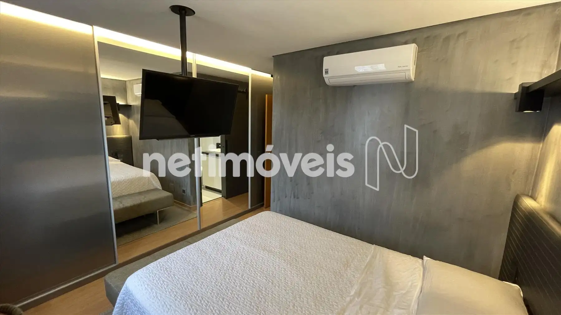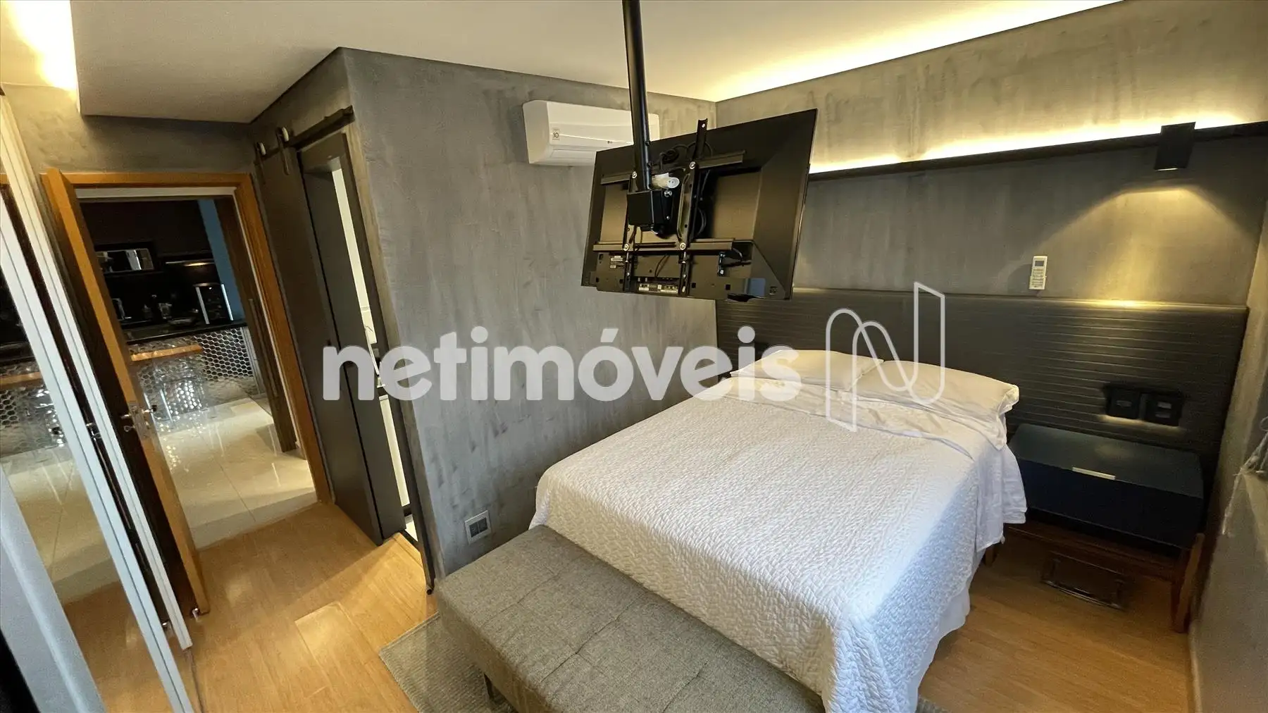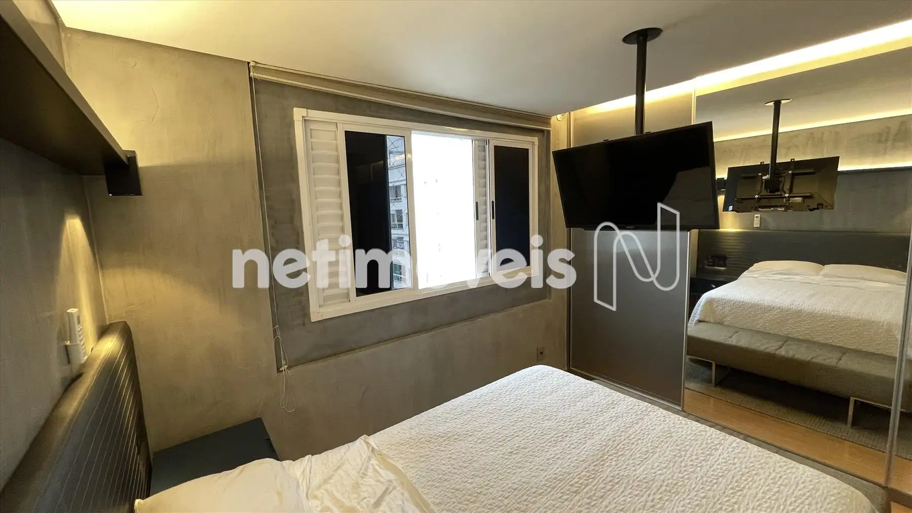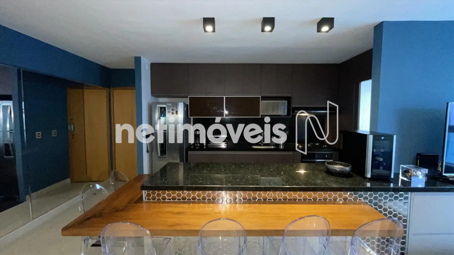 Sala com cozinha e varanda integrada, com painel espelhado, ilha em granito, painel de TV e projeto luminotécnico