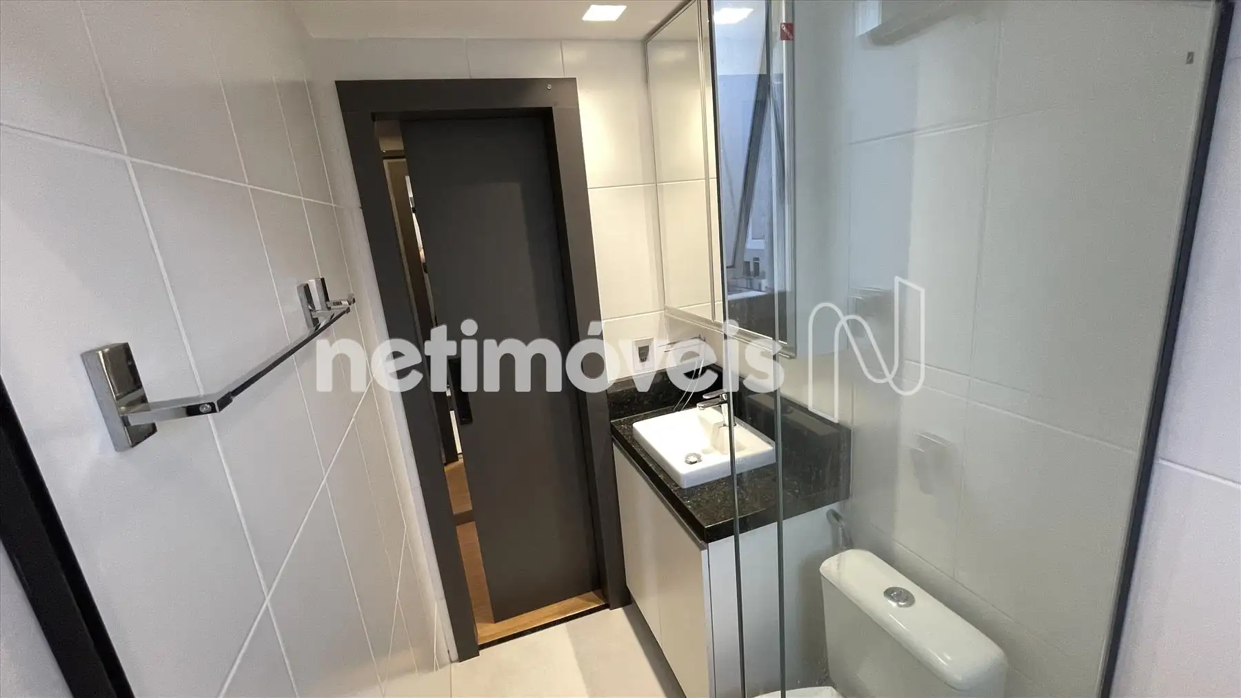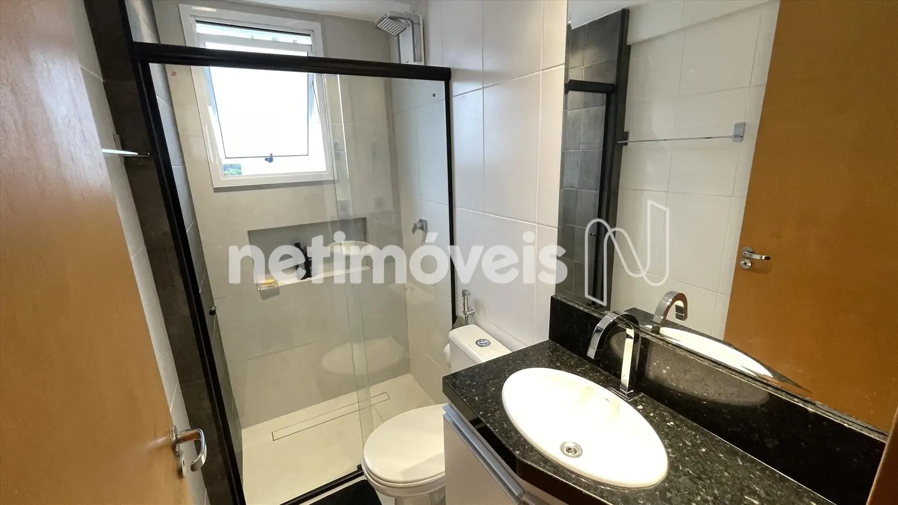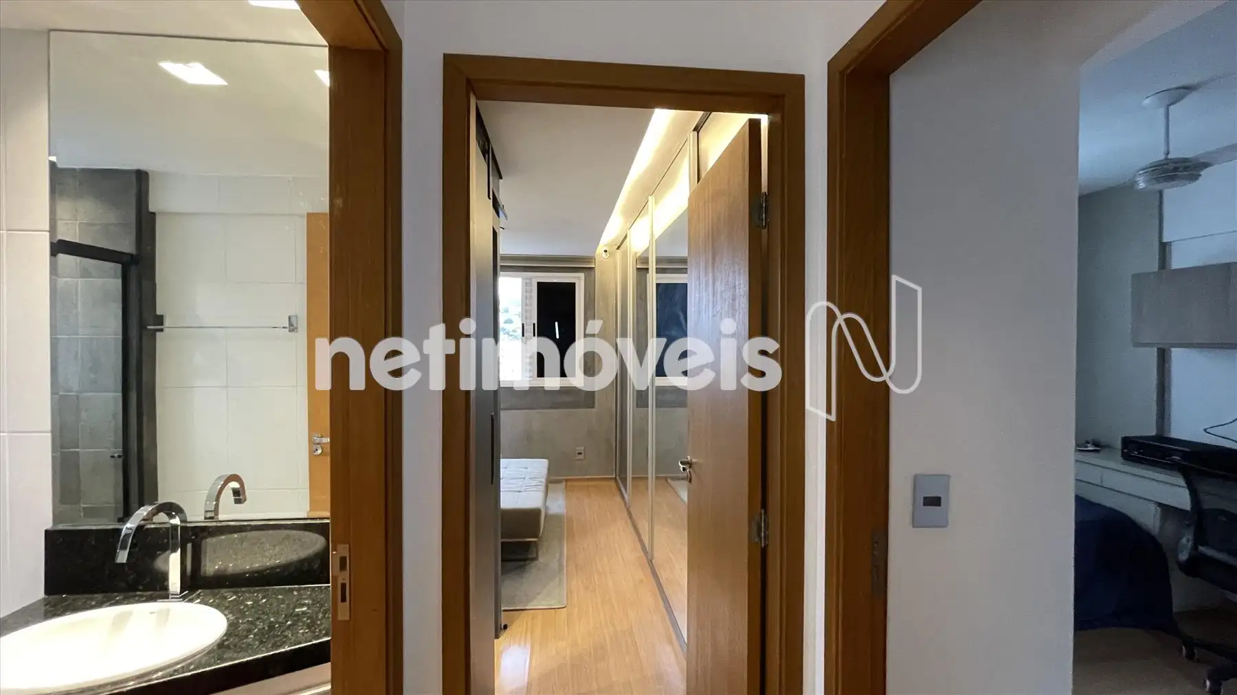 Banho social e suíte com bancada em granito e armários sob pia