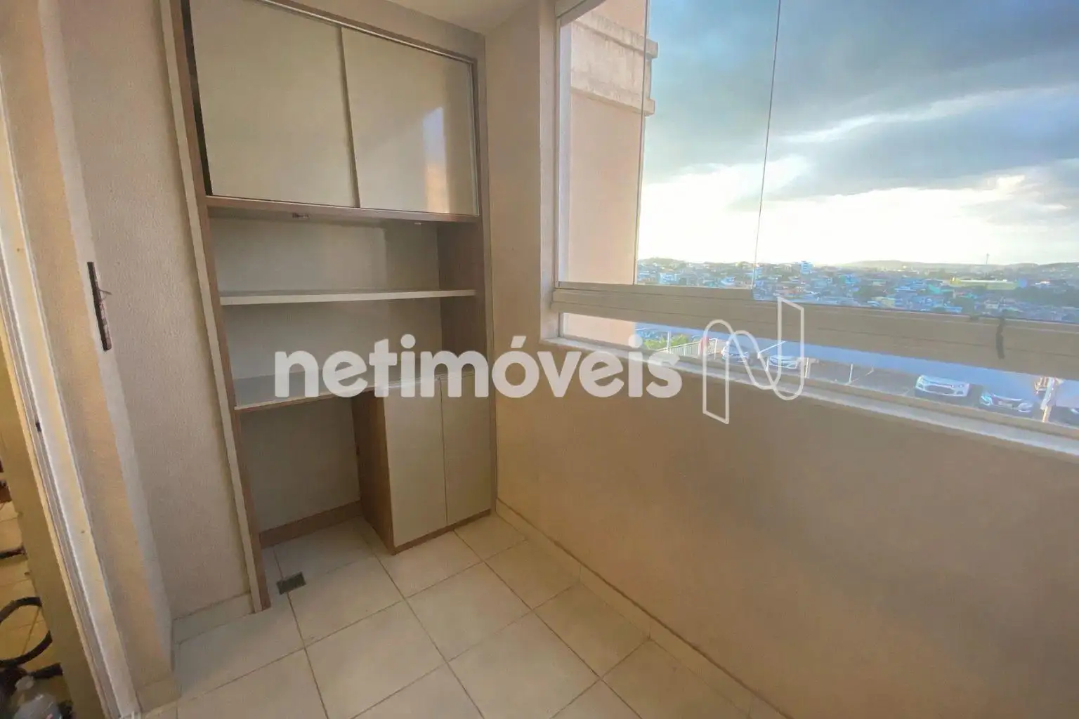 - Varanda com armário e cortina de vidro.