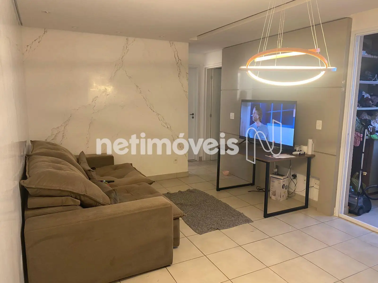 - Sala ampla integrada à cozinha, com parede marmorizada, painel de TV e iluminação moderna.