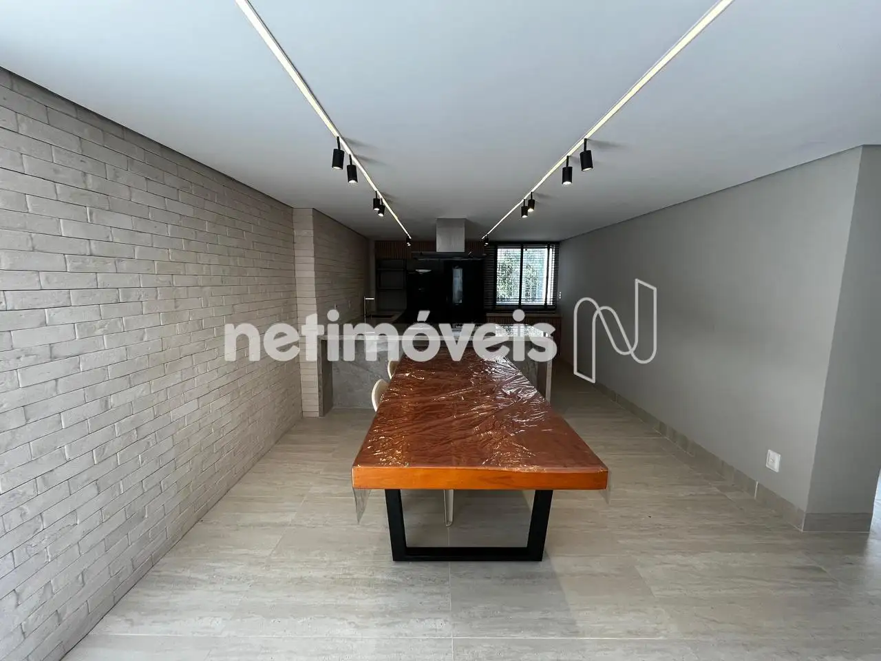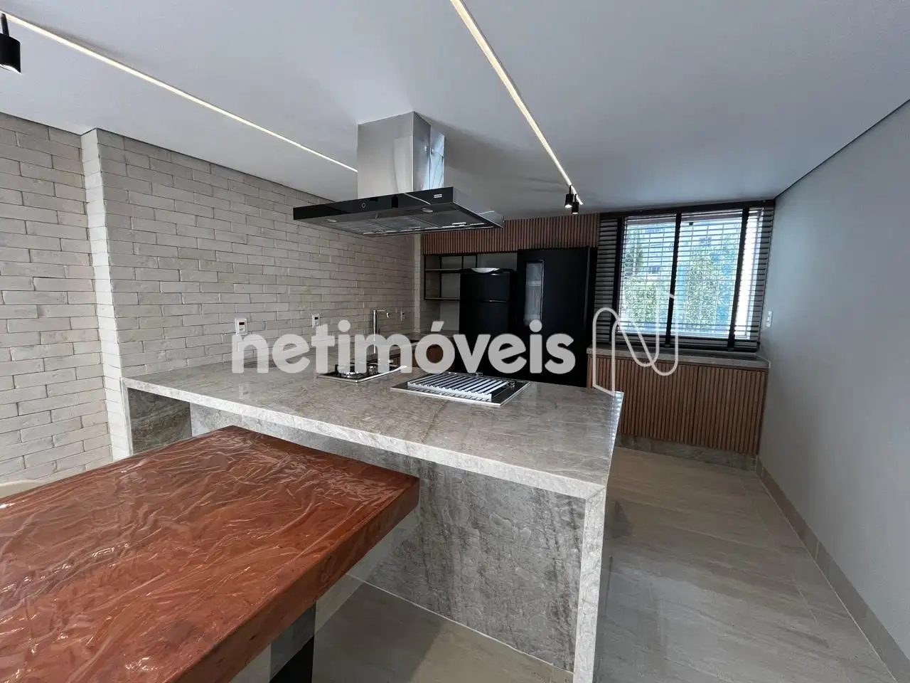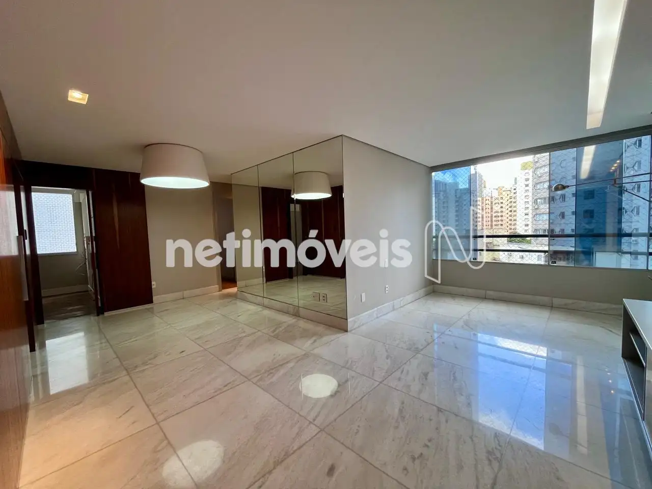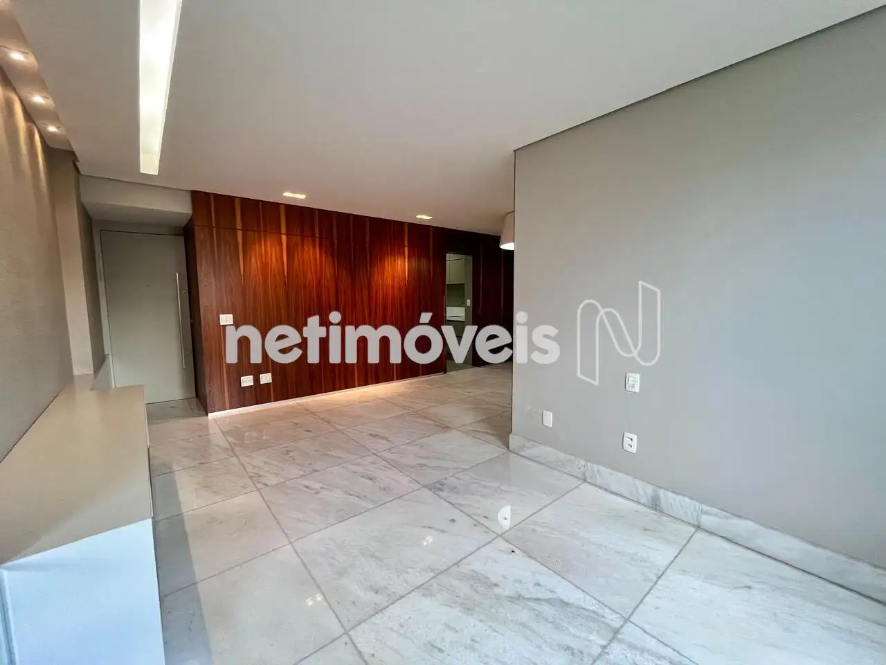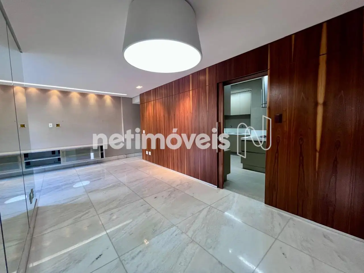 Sala ampla para 02 ambientes, com piso em mármore, iluminação e painel amadeirado;