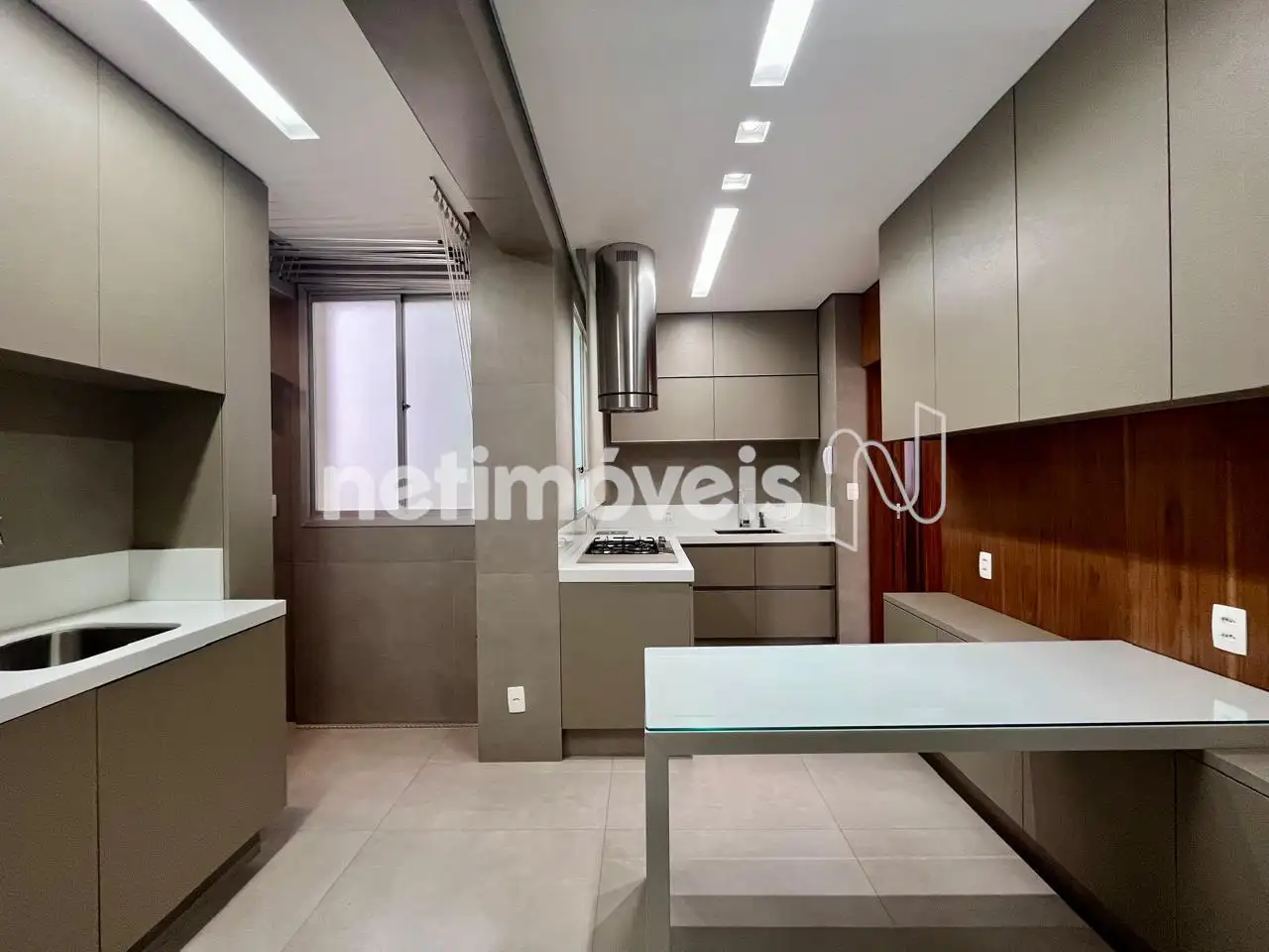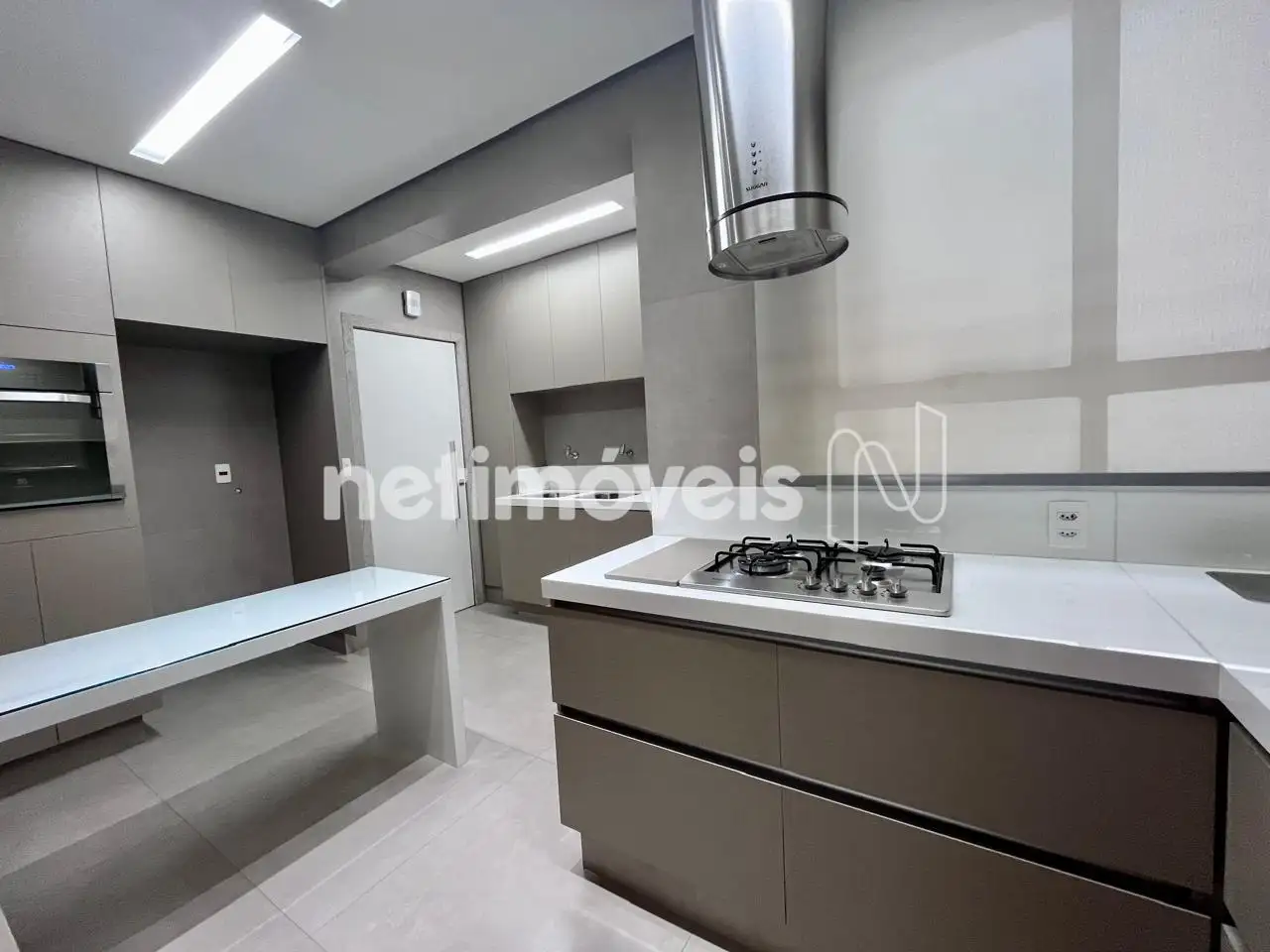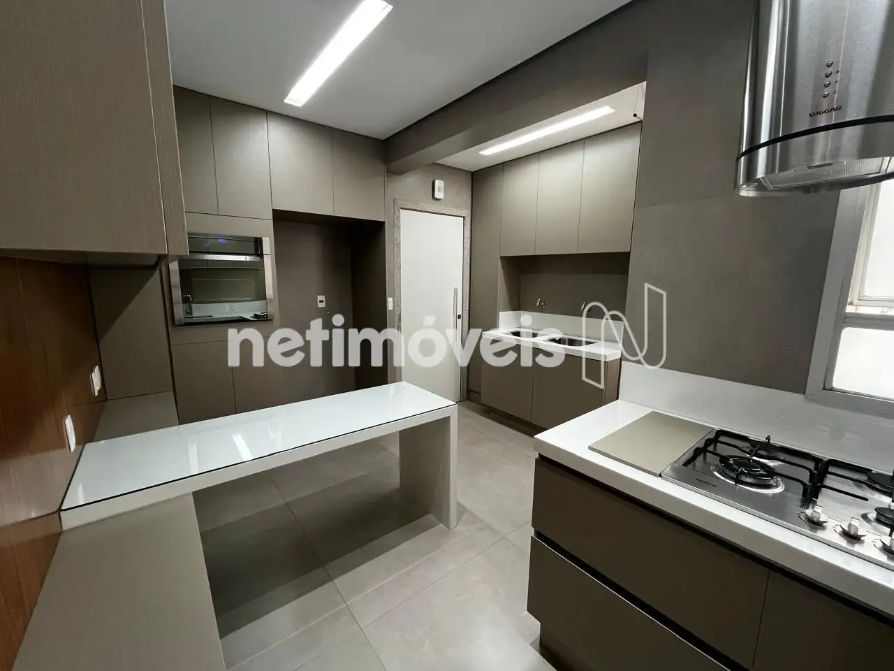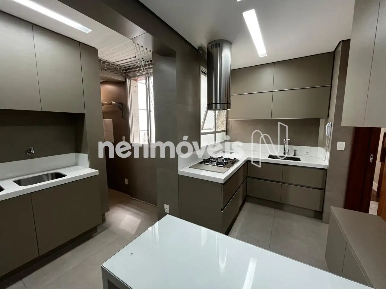 Cozinha espaçosa com armários, bancada em silestone e área de serviço;