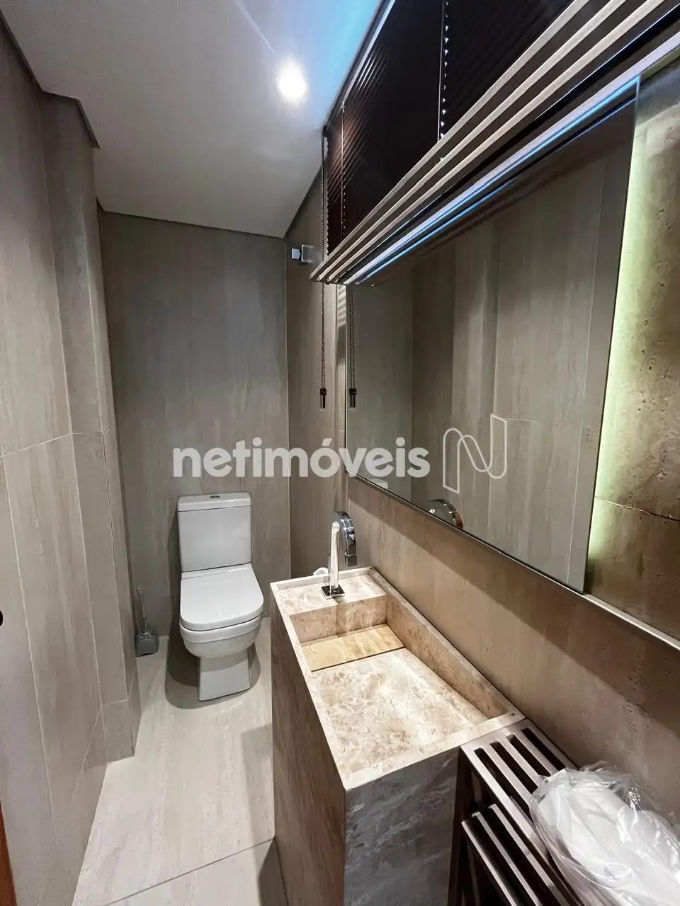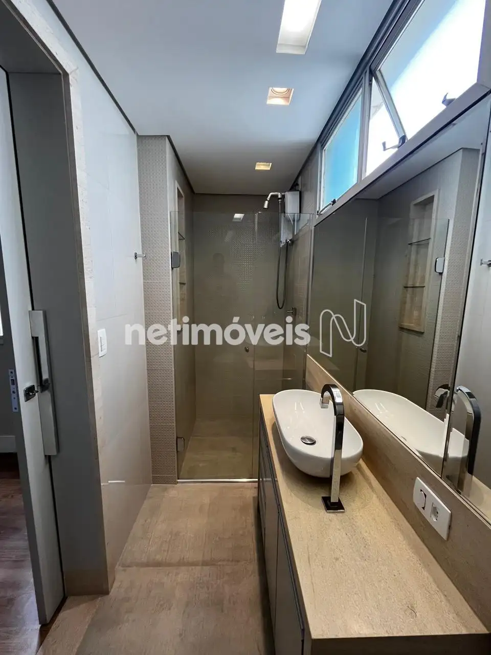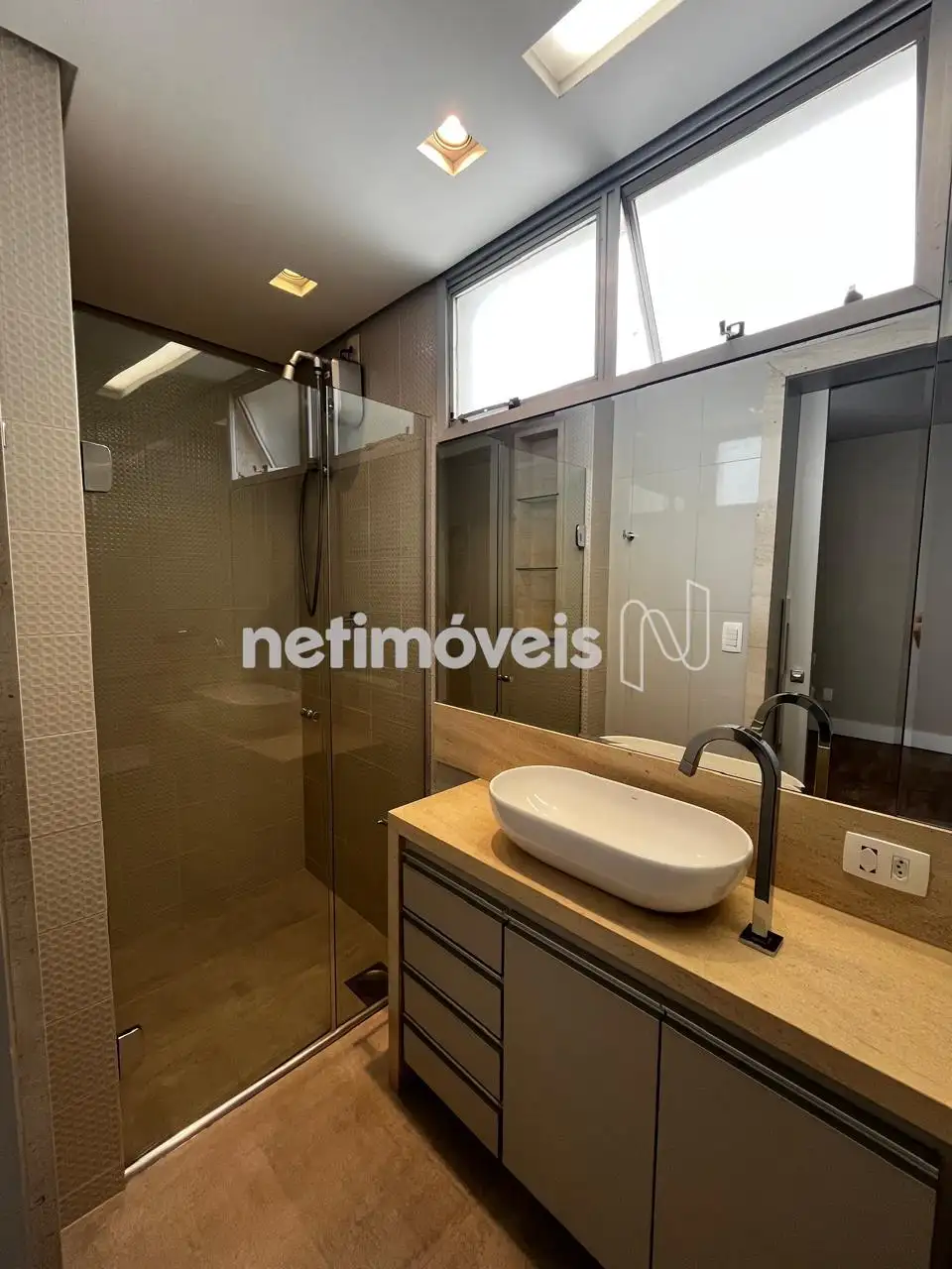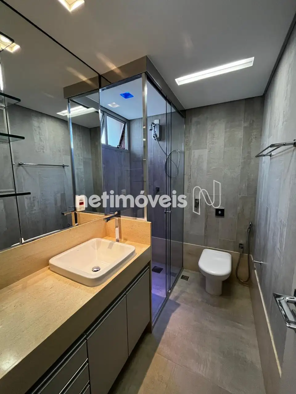 Banho social com armário, box e espelho;