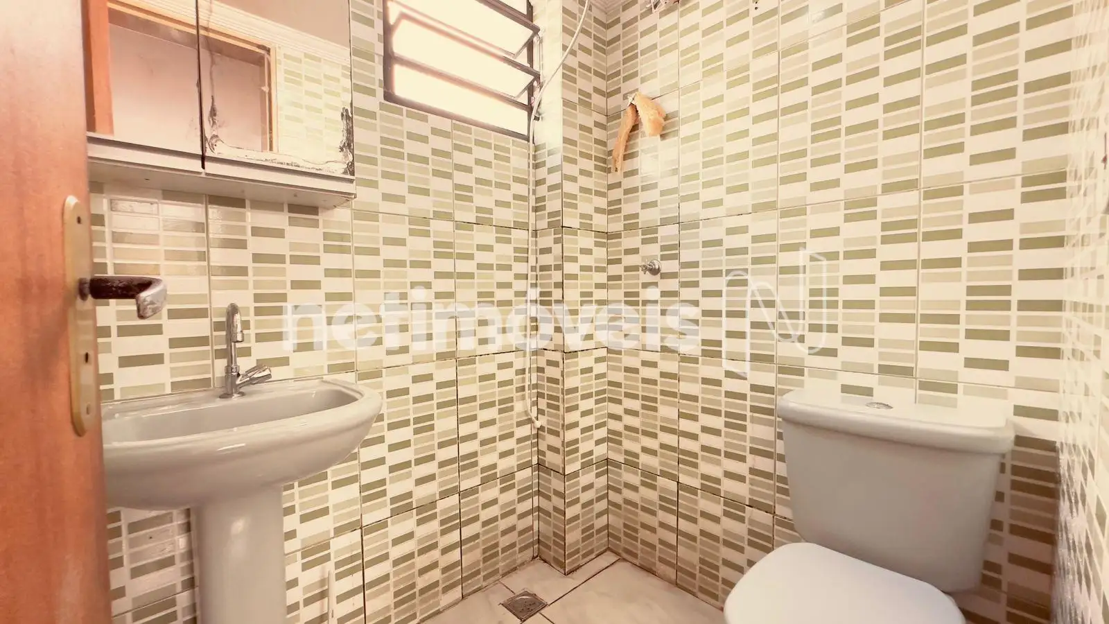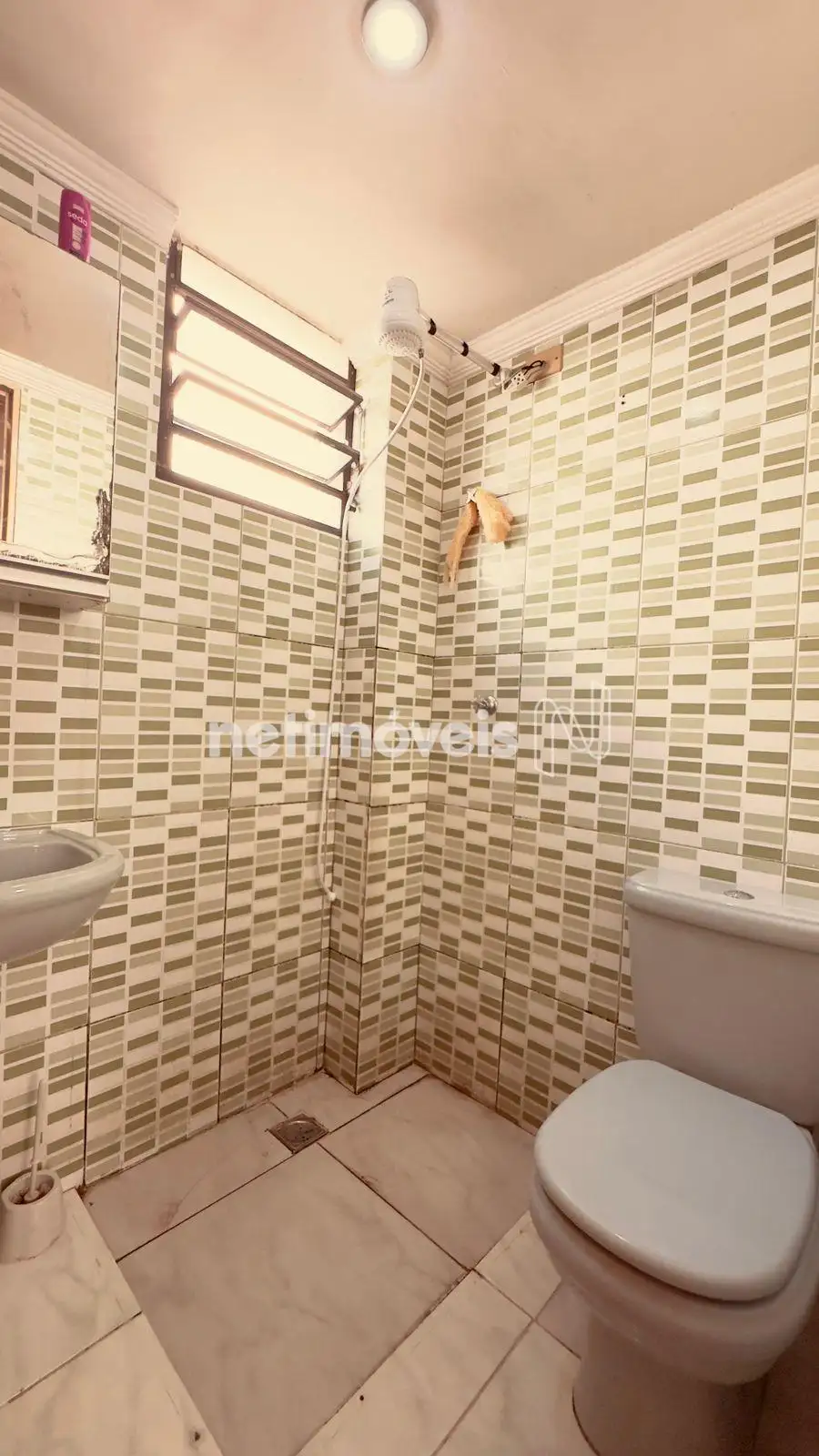 Banheiro social com box em vidro temperado e armário;