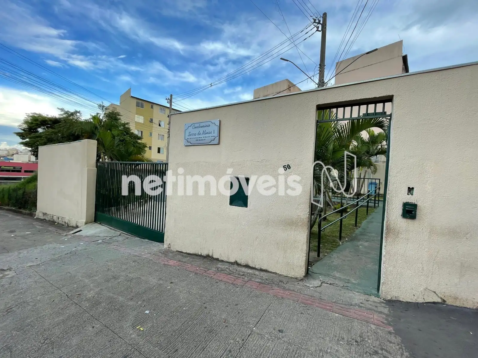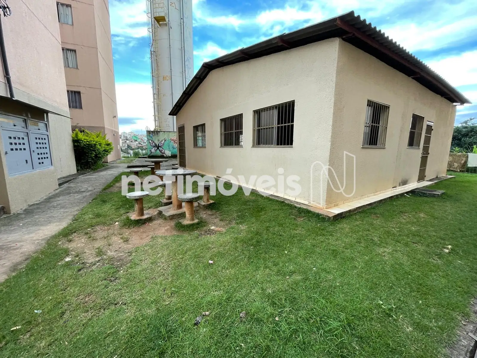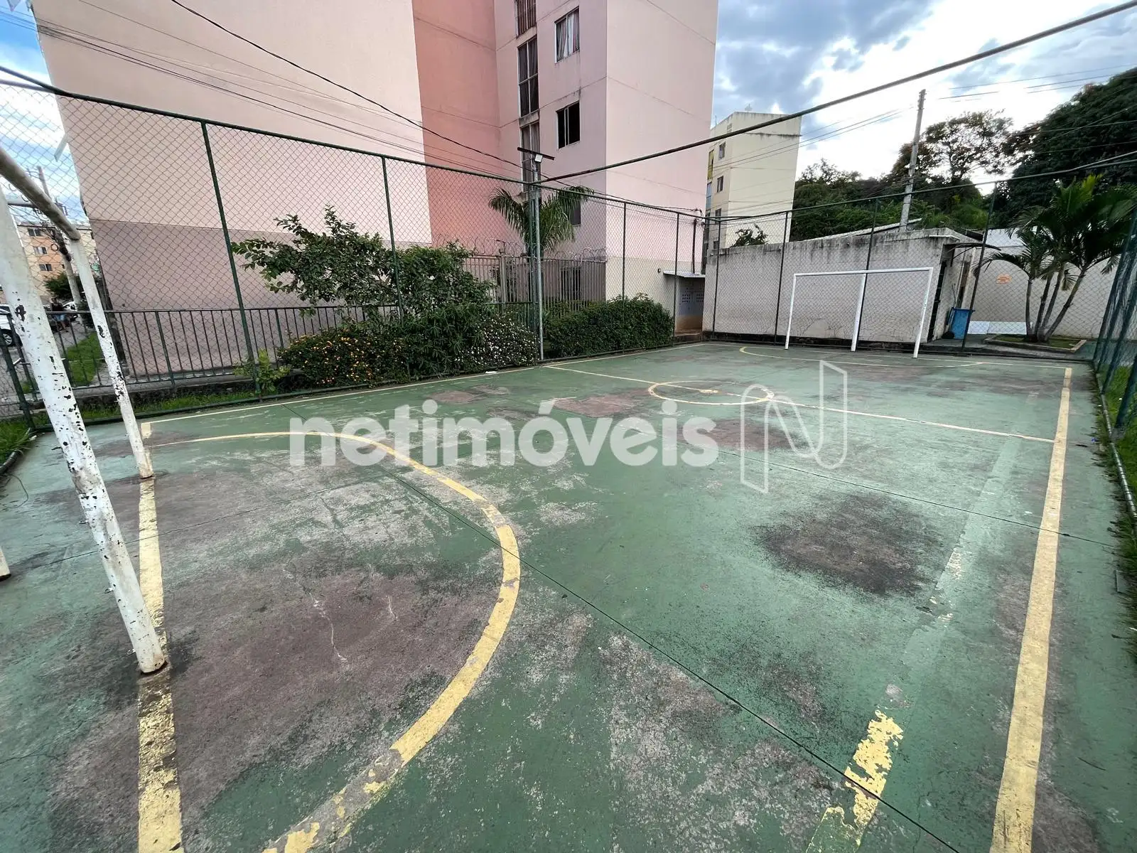 Prédio em pintura, janelas amplas, salão de festas, quadra de esportes, jardins, interfone e portão eletrônico.