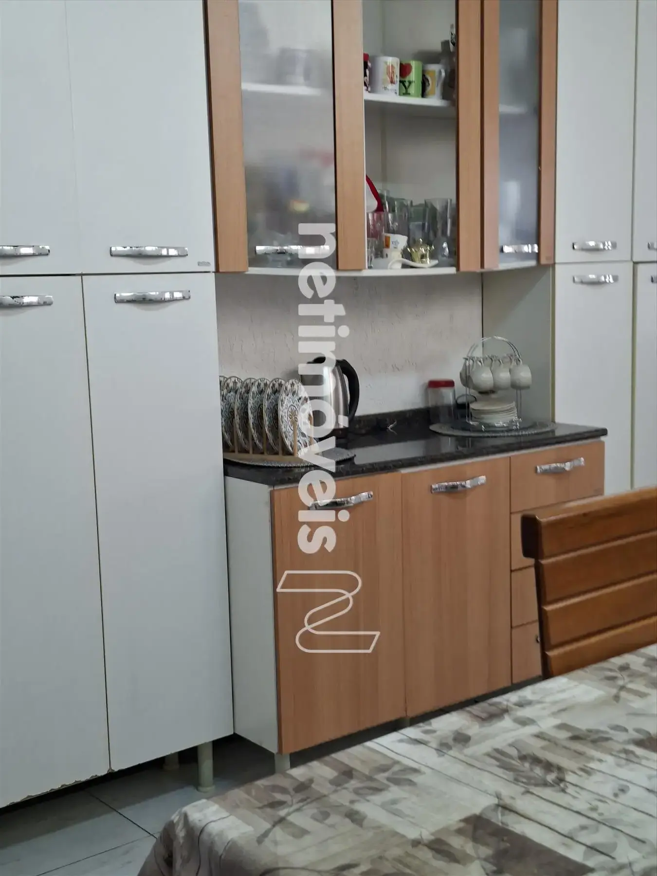 - Cozinha com piso em porcelanato, conjugado com copa, pia com bancada em granito e armários.