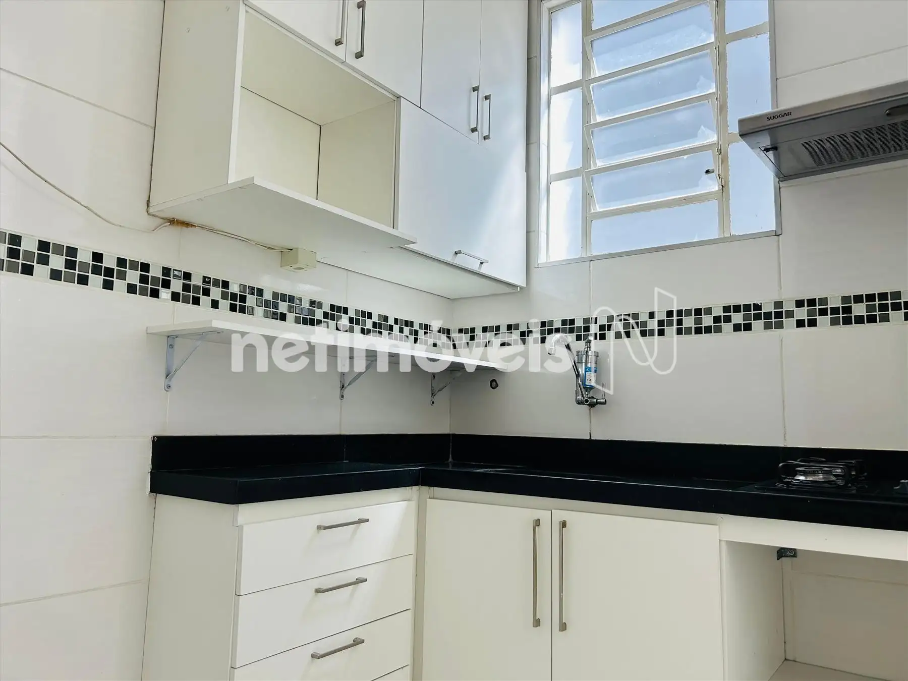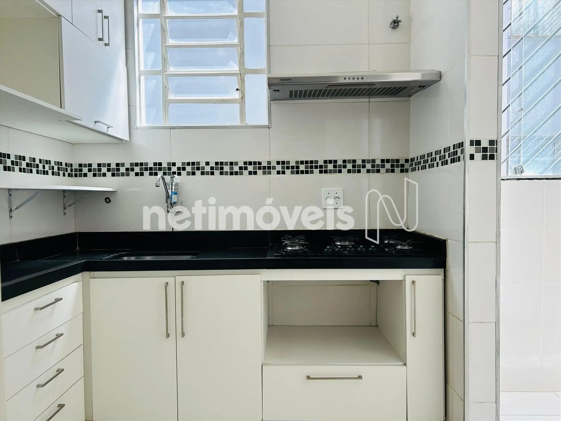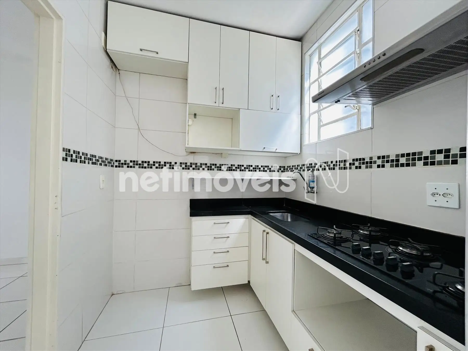 Cozinha com armários, fogão cooktop,bancada em granito, com exaustor