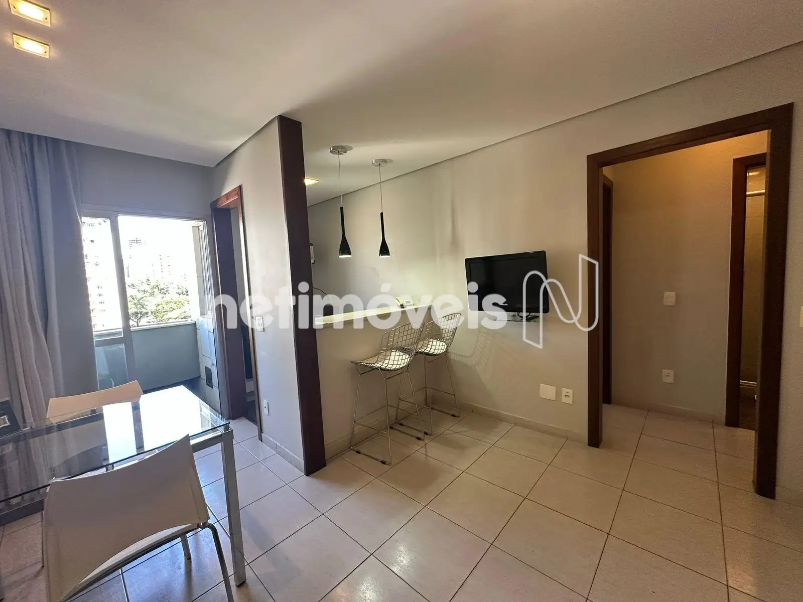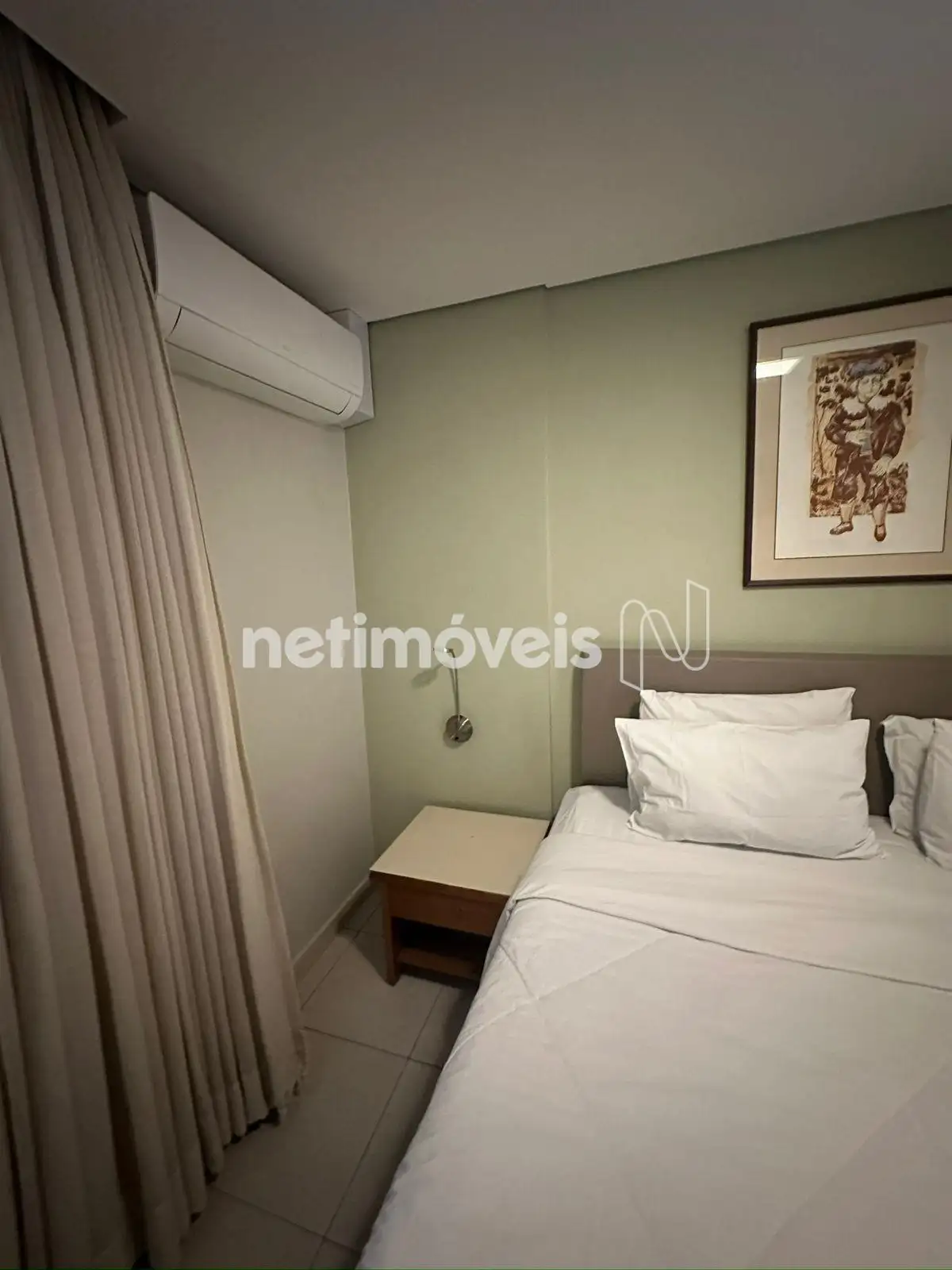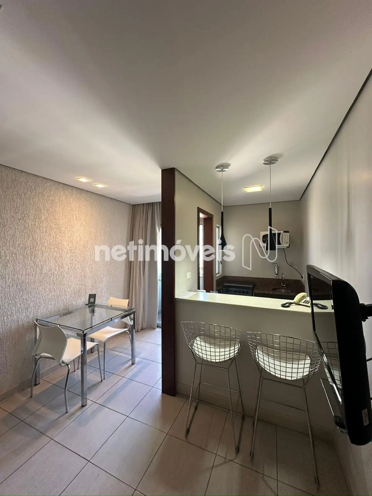O apartamento tem aproximadamente 35m², boa circulação de ar e luz natural. O imóvel está mobiliado, ar condicionado, eletrodomésticos do dia a dia, cama, sofá, cadeiras, aparelho de TV e frigobar. Armarios no quarto, banheiro e cozinha