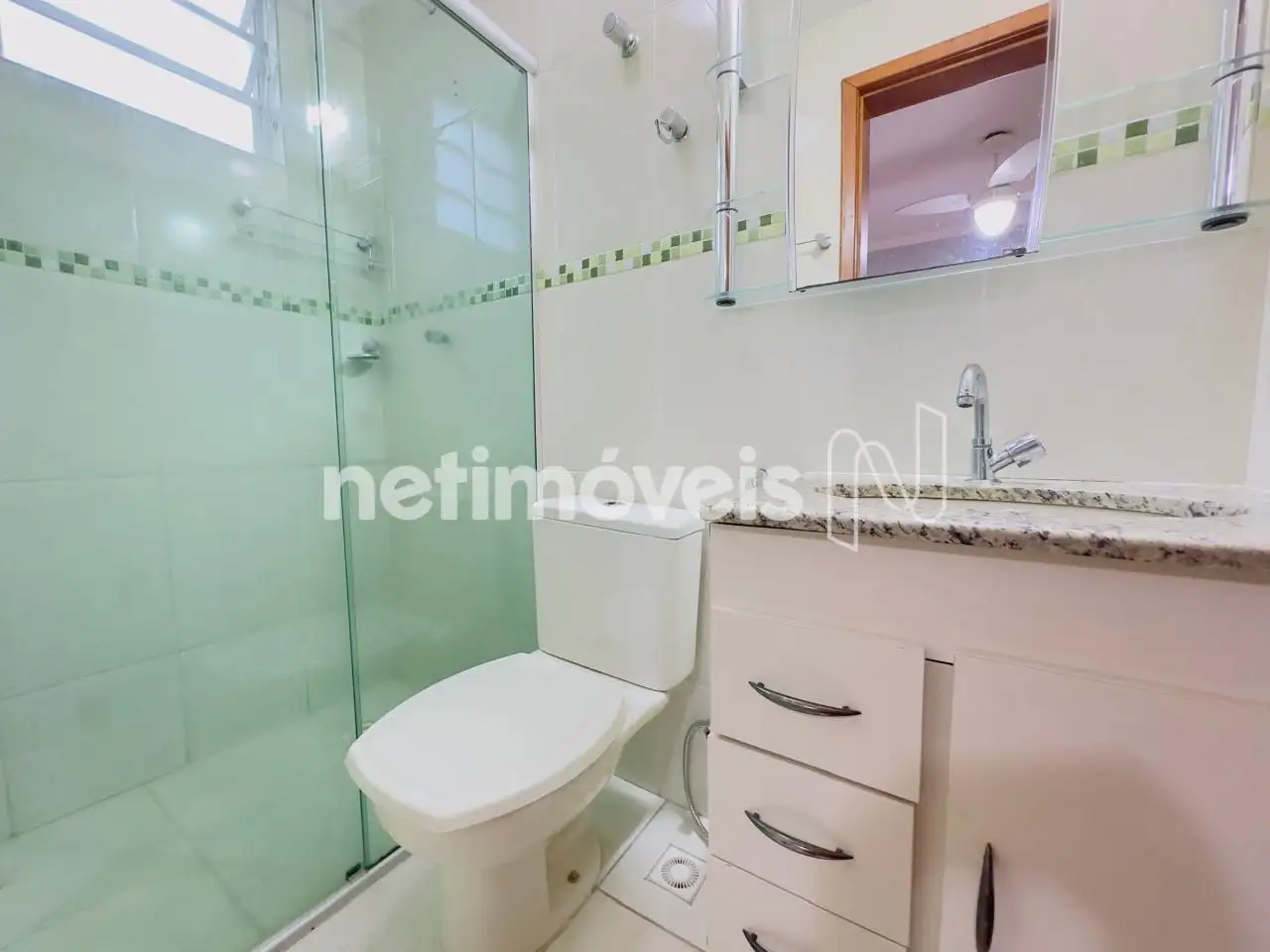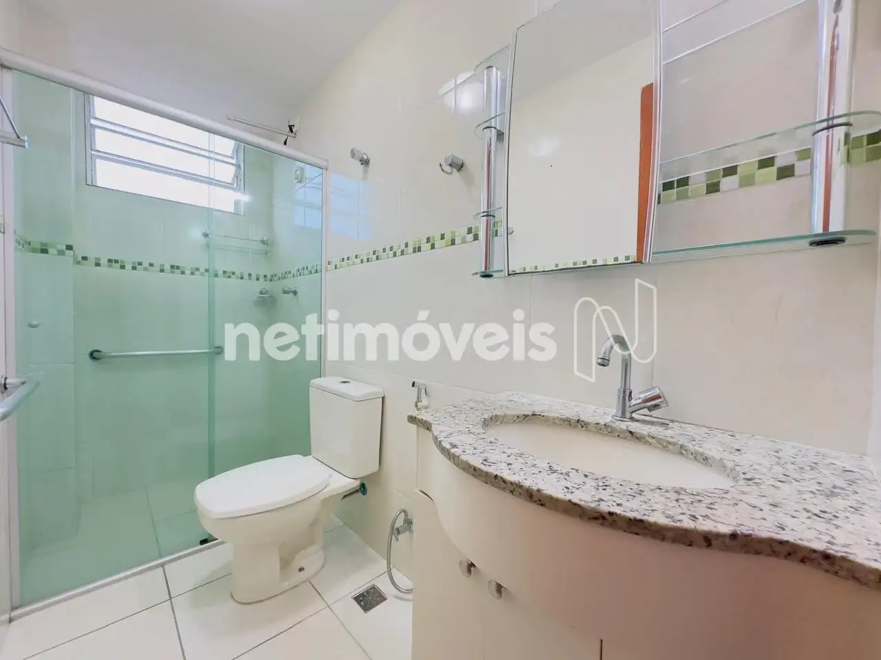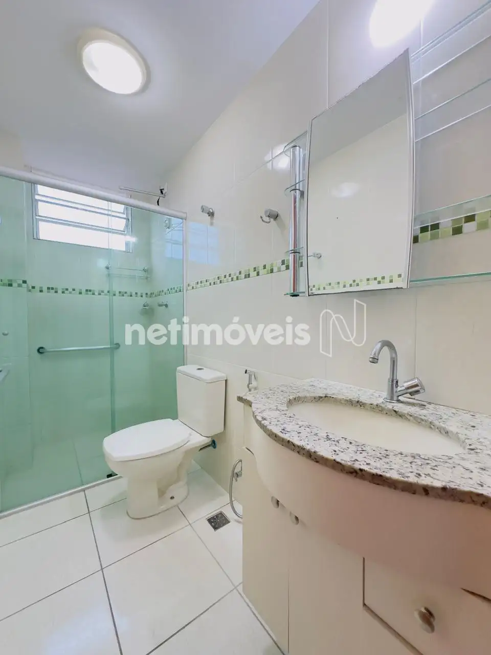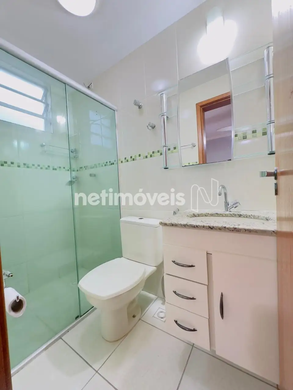 Banheiros social e da suíte com armários sob bancadas em granito, boxes em blindex e pisos em porcelanato;