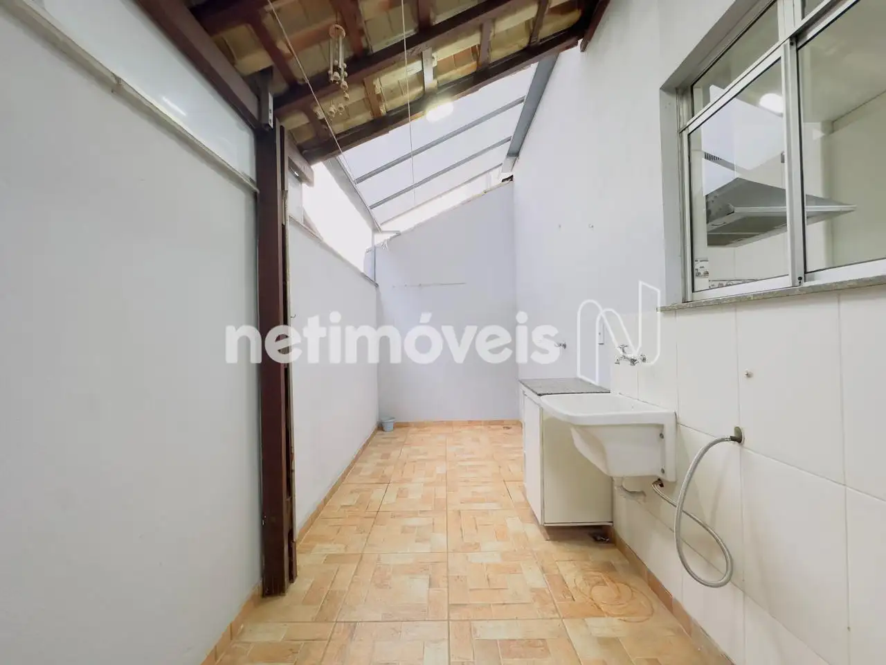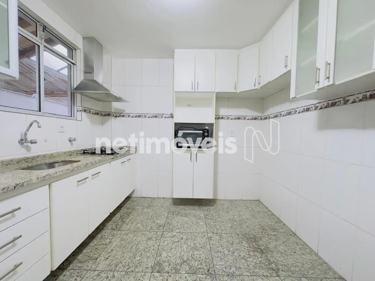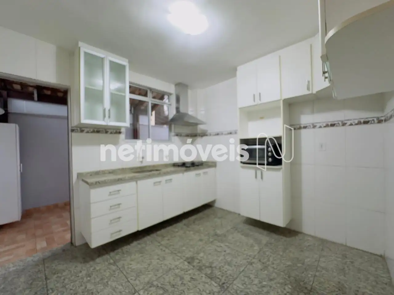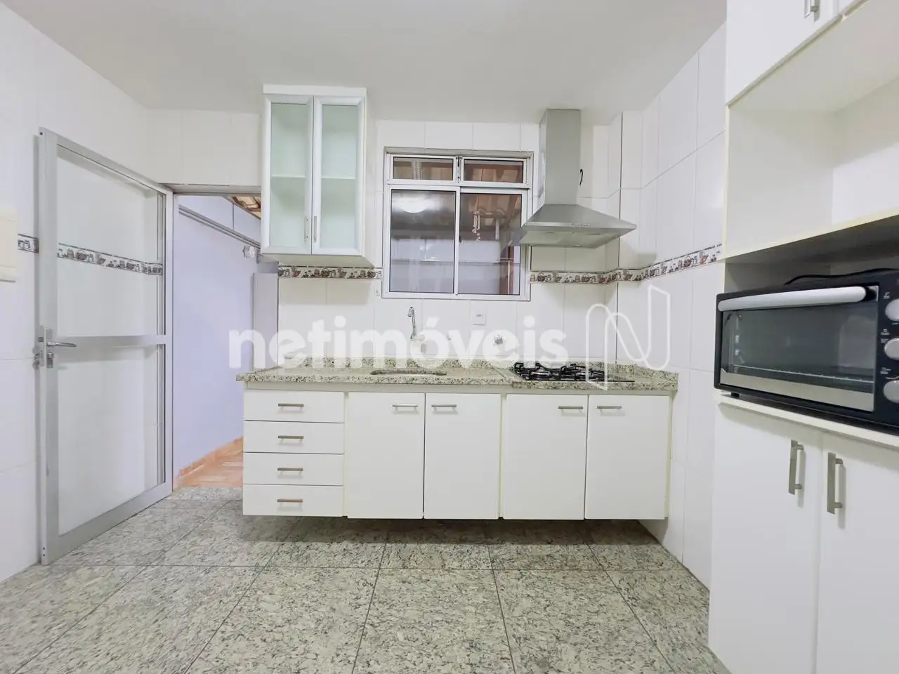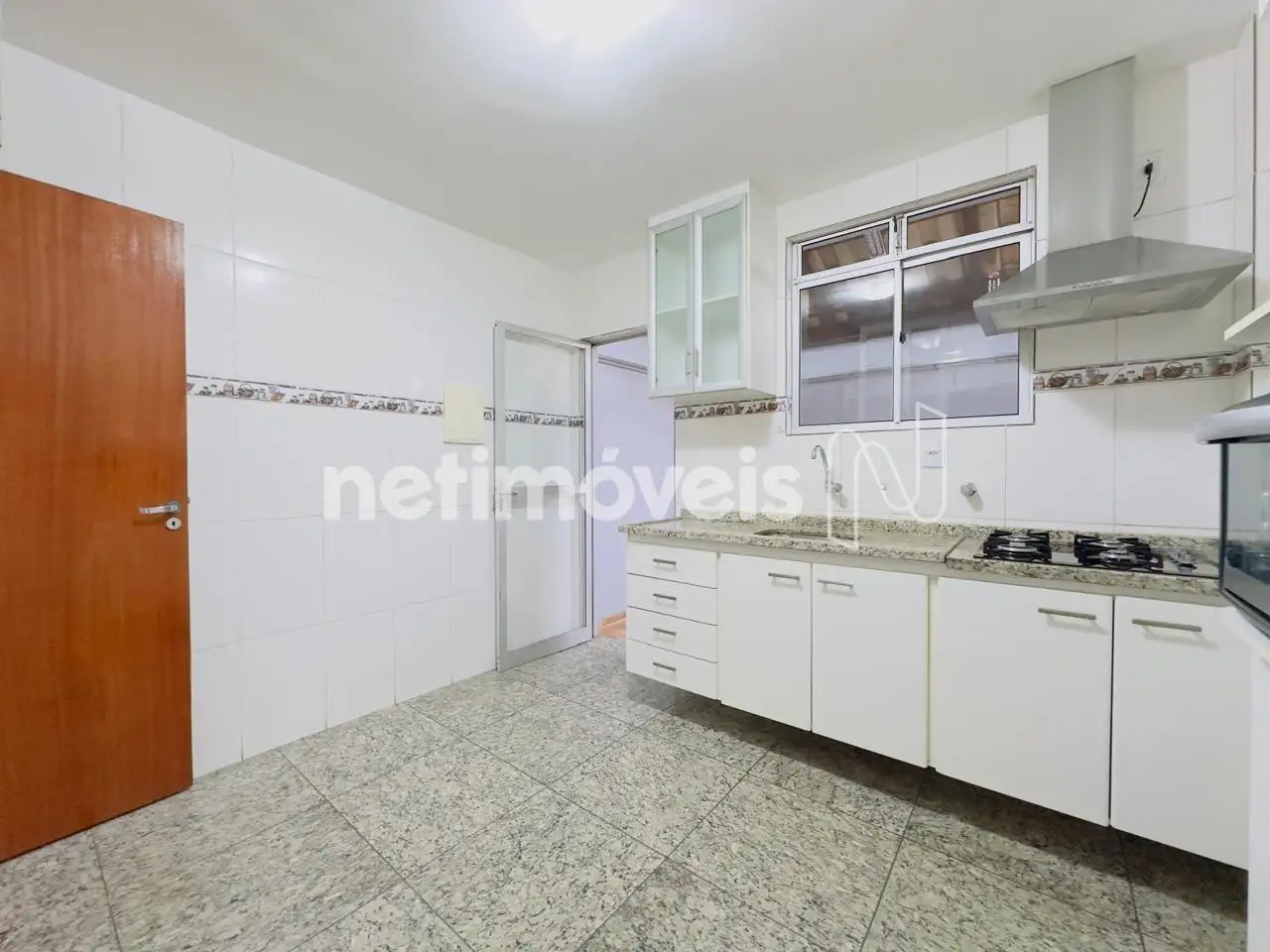 Cozinha com armários sob e sobre bancada em granito, piso em porcelanato, acesso a área privativa, metade com telhado fixo e a outra metade retrátil e lavanderia.