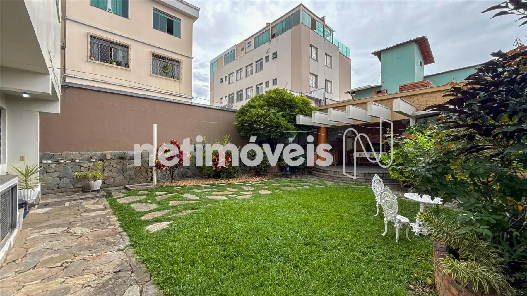 Quintal com jardinagem particular, gramado, com uma área gourmet linda, churrasqueira, cozinha integrada com bancada,