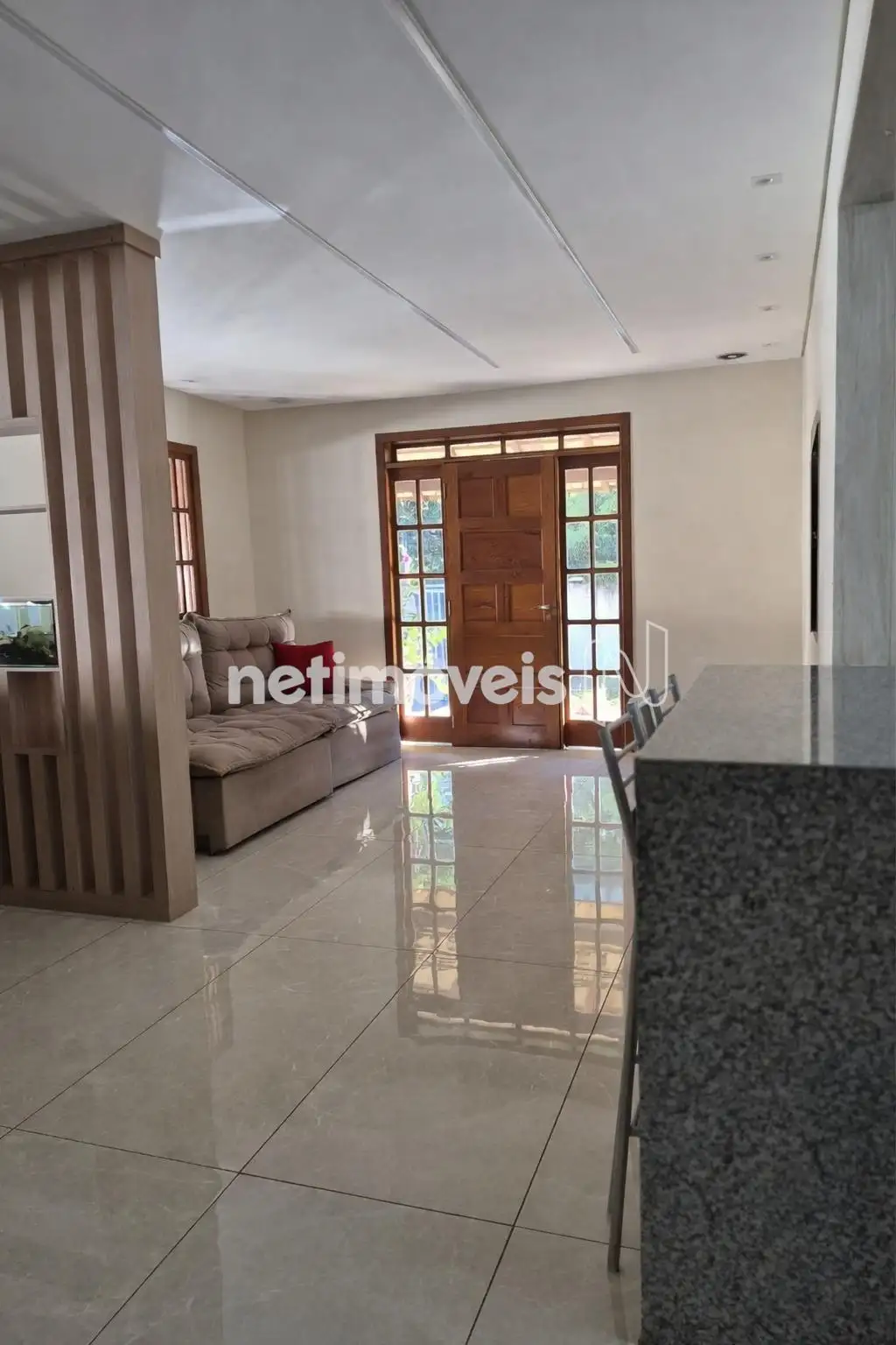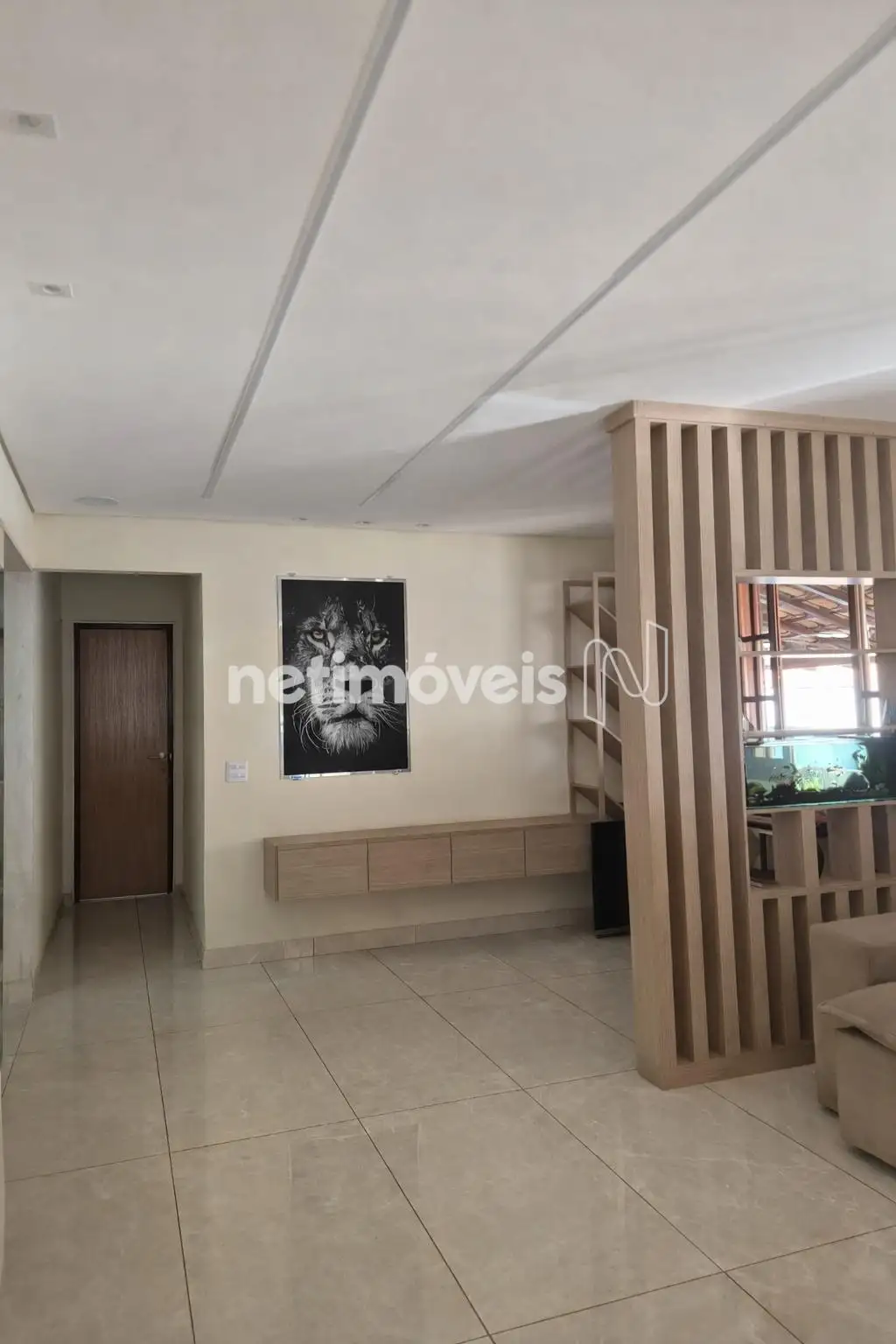 Sala para dois ambientes, teto rebaixado com iluminação embutido, piso em porcelanato.