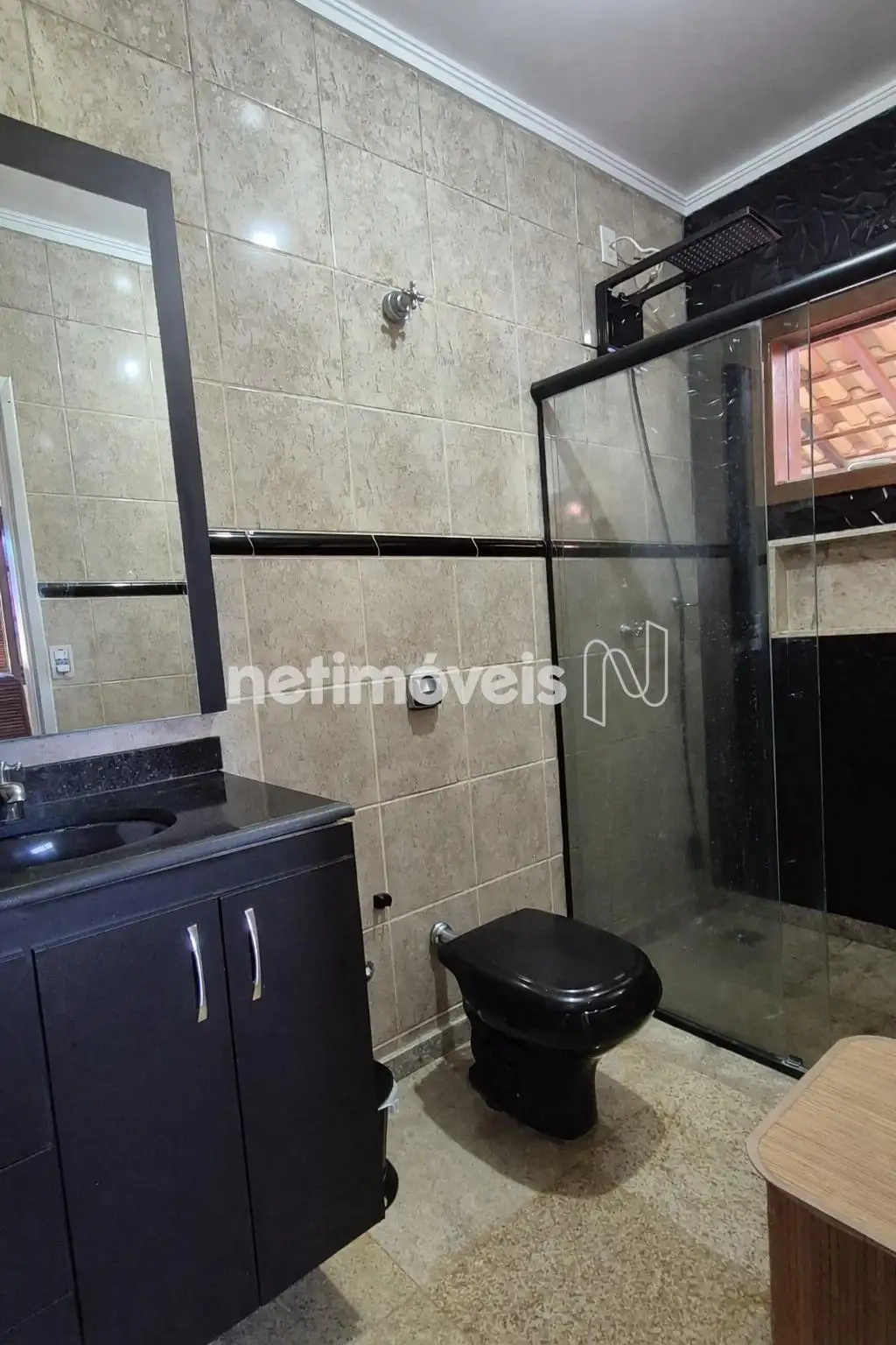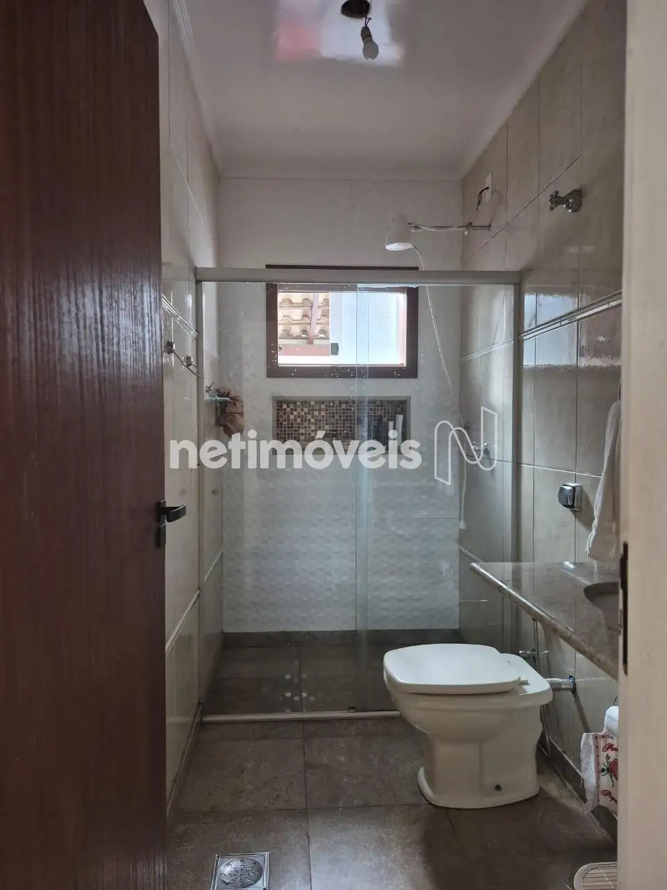 Suíte e social com bancada em granito, box em vidro, piso em porcelanato