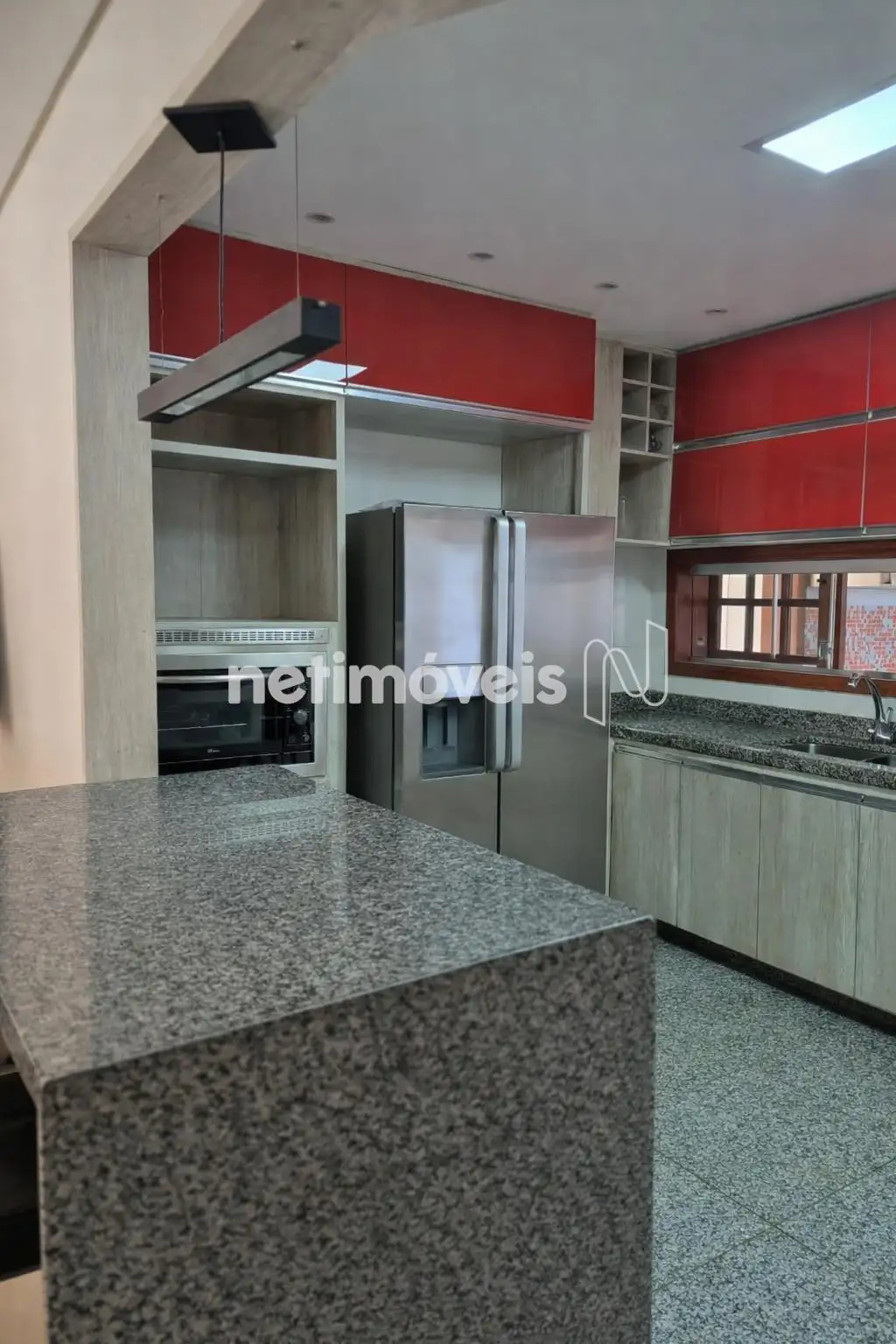 Cozinha: Bancada em granito, piso em granito, armários,