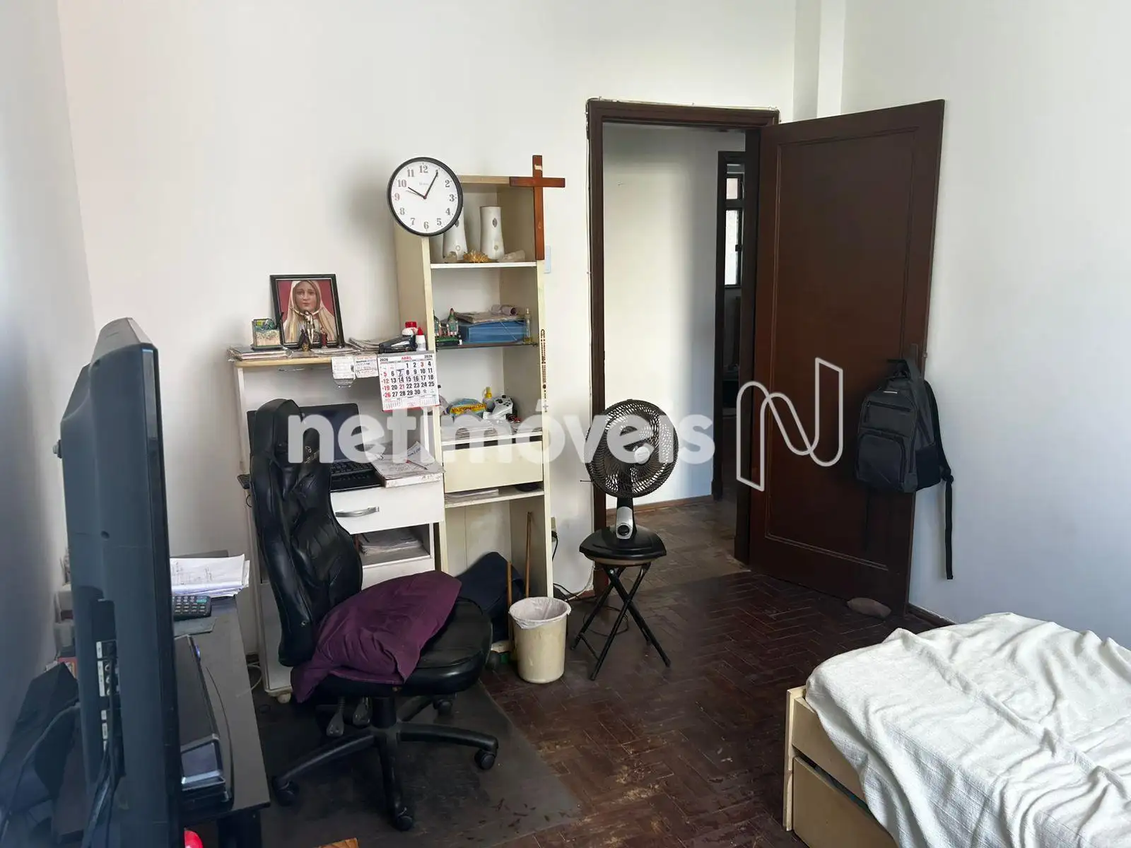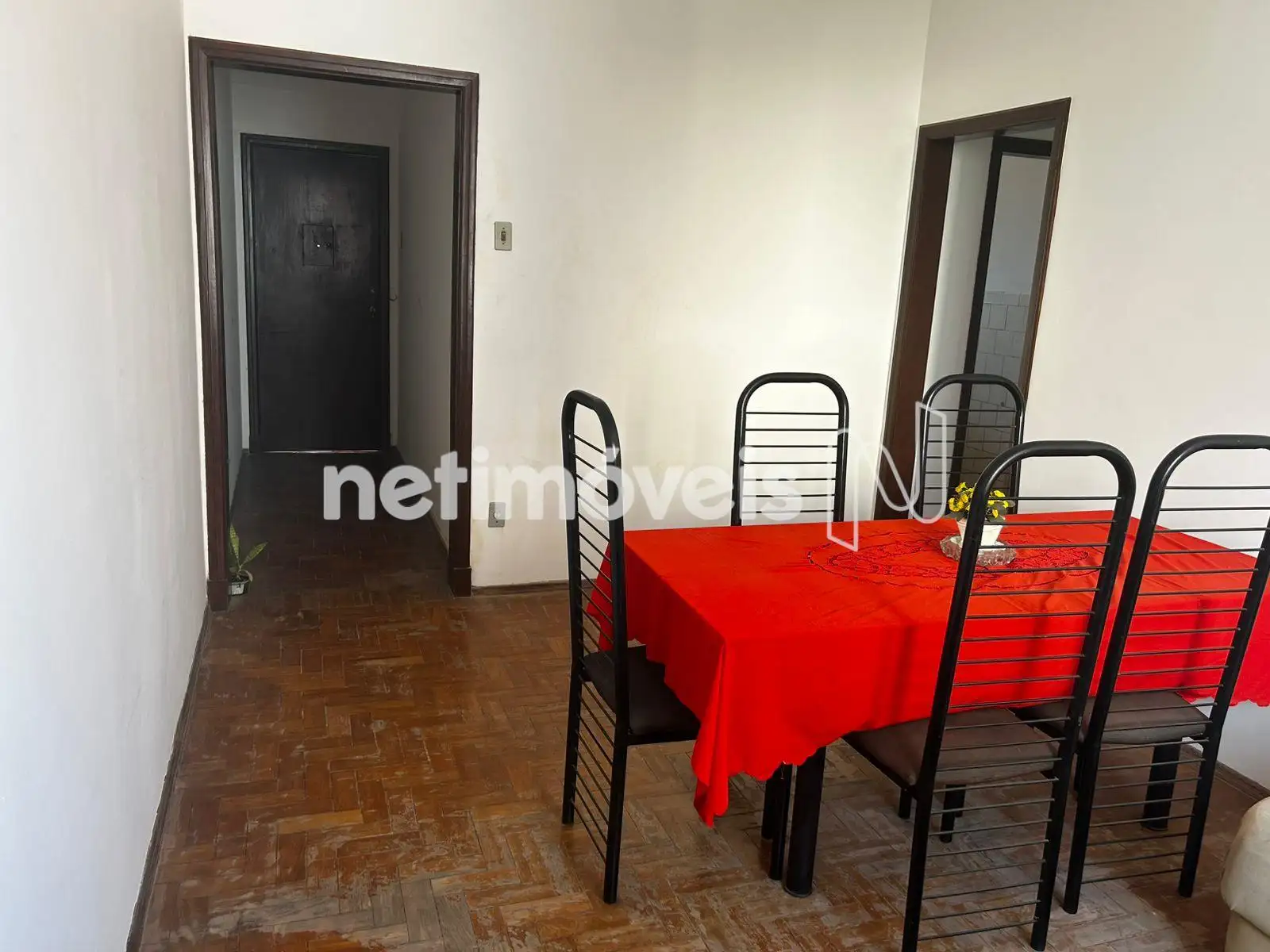 Apartamento de 3 quartos, 2 quartos com armários, sala ampla, banheiro espaçoso, cozinha e área de serviço.