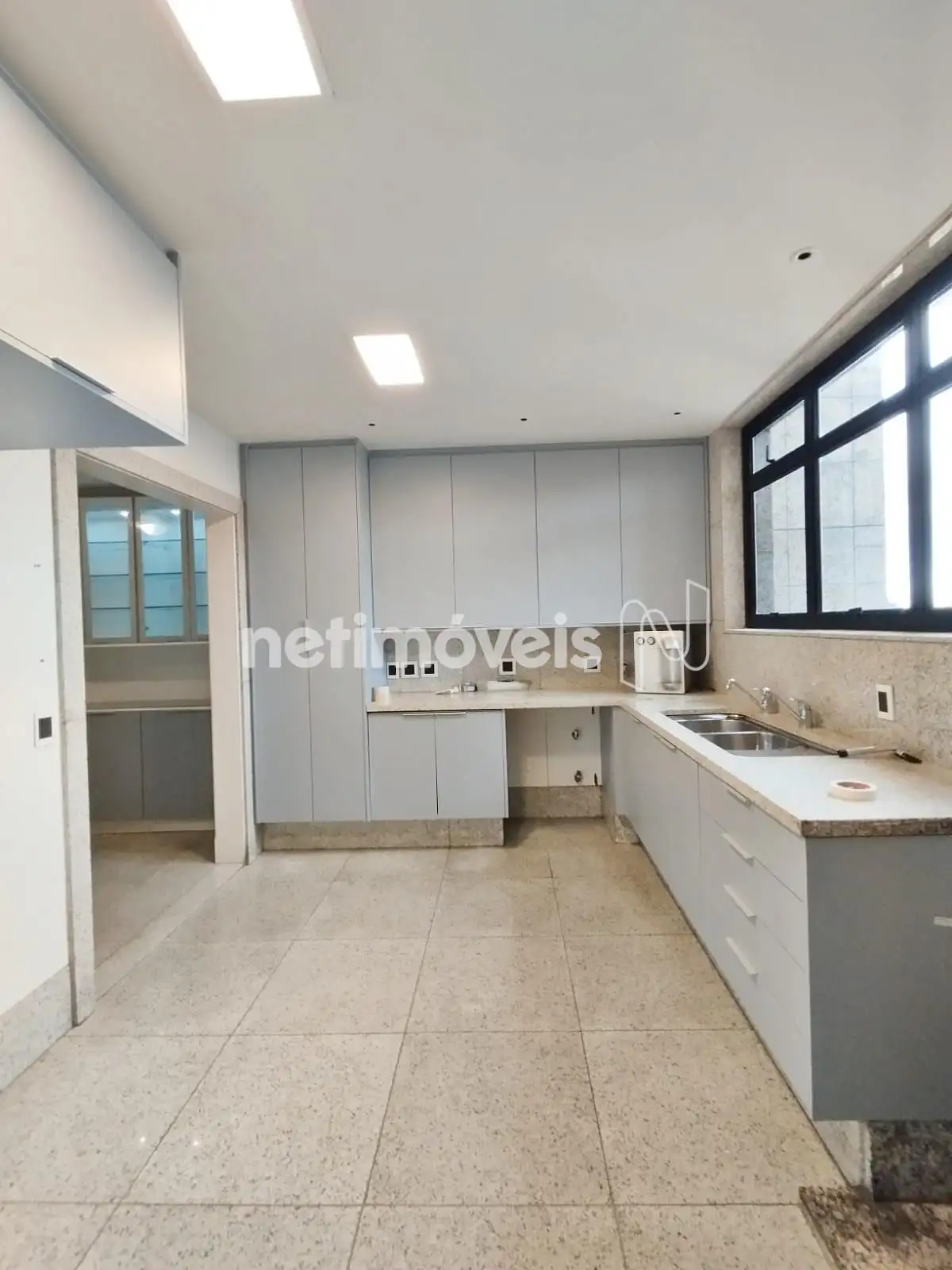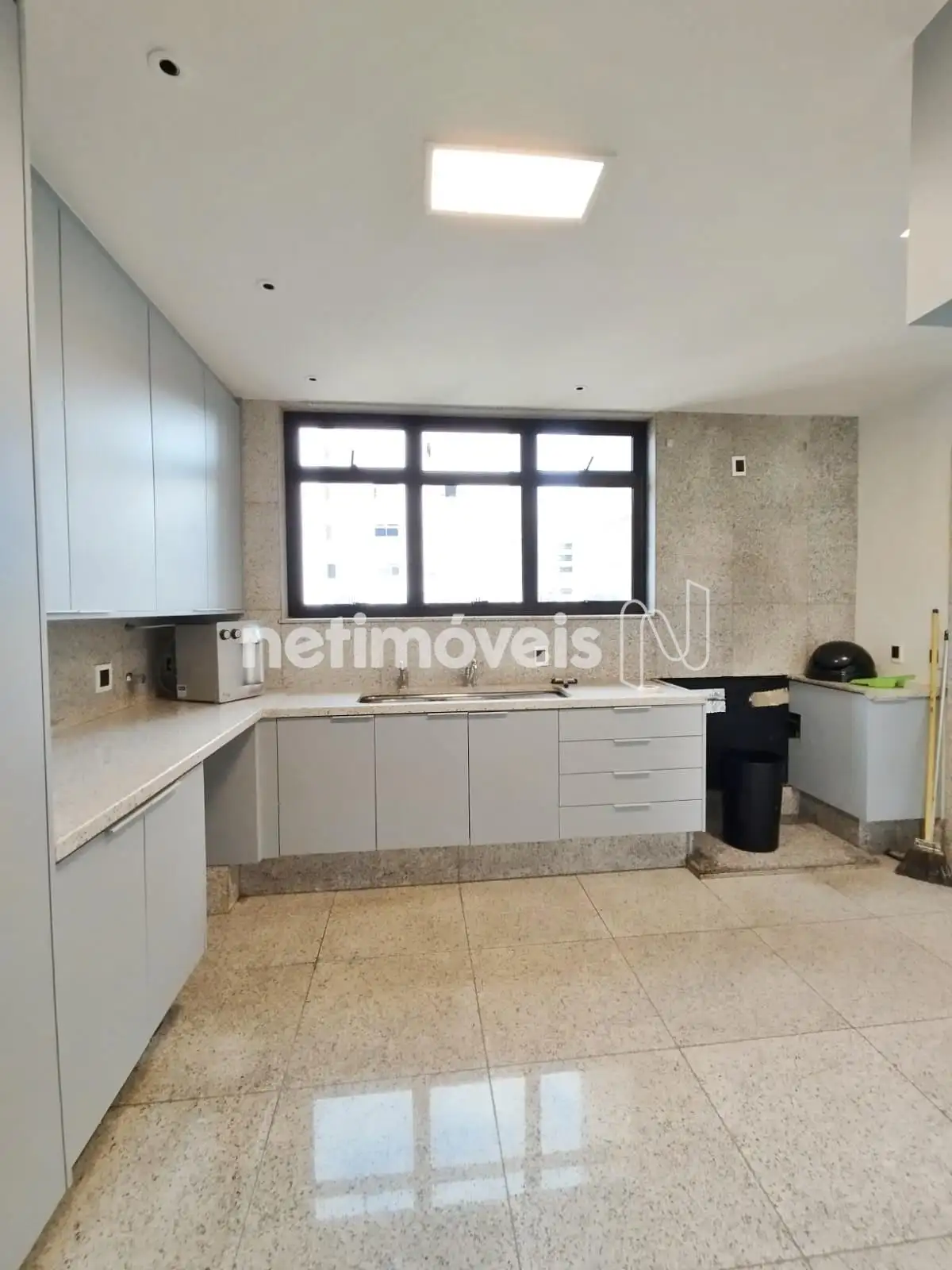Cozinha ampla, armários, bancada e piso em granito.